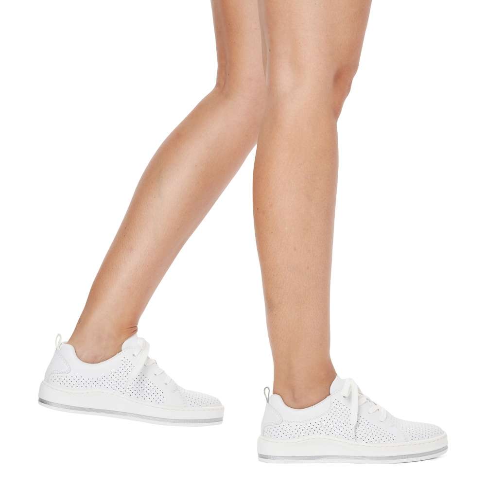 Detailní informace Nádherné bílé perforované tenisky s kulatou špičkou s kontrastním detailem na podešvi podél celé botky a na patě ve stříbrném odstínu zaujmou nejen Vás, ale i Vaše kolegyně v práci či kamarádky. Navíc díky úžasné měkké stélce a podešvi vybavené unikátní technologii ANTISTRESS nebudete chtít tyto krásky vyzout. Botky jsou na zavazování, tudíž si je jednoduše přizpůsobíte přesně jak potřebujete. Jednoduše je sladíte k sukni, šatům, šortkám i kalhotám. Tento model nesmí chybět ve Vašem nákupním košíku.