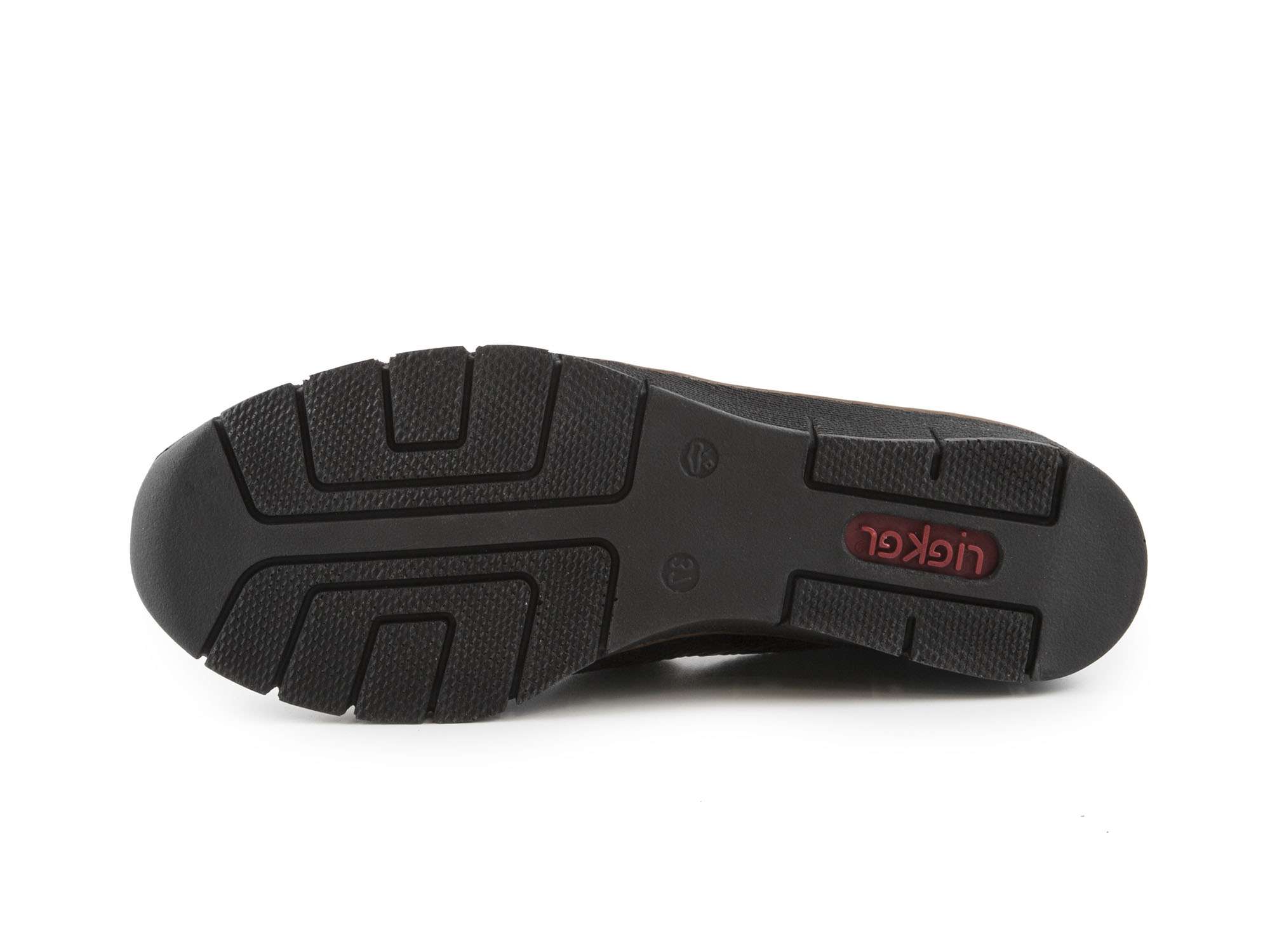 Podešev bot je vyrobena v černé barvě. Je mohutnější - v přední části s platformou o výšce cca 2 cm a v patní části se zvedající ve formě klínku až na 3,5 až 4 cm. Tato podešev je u značky Rieker velmi oblíbená díky pohodlí již několik let. Kolem horního okraje podešve je nevýrazný tmavě hnědý proužek pro efekt.