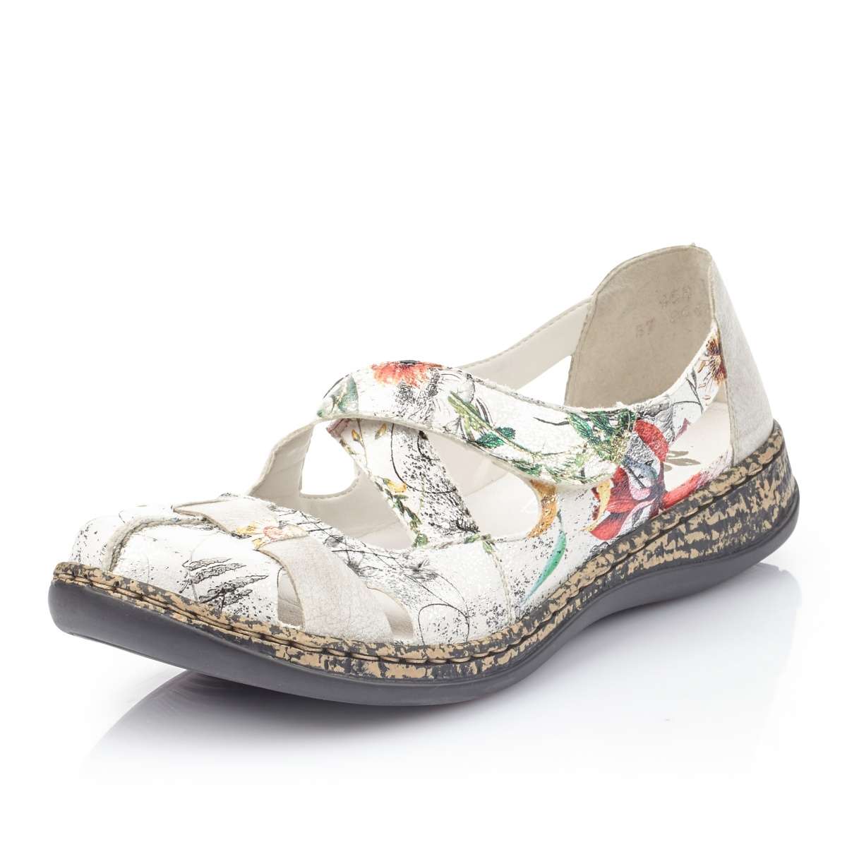 Jarní polobotky, značky RIEKER. Podešev Prošívaná designová podešev je vyrobena z kvalitní syntetiky s úpravou Antistress, která Vám zajistí pohodlí po celý den. Díky této technologii je lehká, flexibilní, absorbuje nárazy při došlapu a snadno se přizpůsobí každé noze. Svršek Tyto bílé polobotky s jarním květinovým vzorem se stříbrnými odlesky rozjasní každý Váš outfit. Pro snadnější obouvání je přes nárt pásek na suchý zip. Využijete je jak do práce, tak na procházku do města. Stélka Při celodenním chození oceníte koženou stélku, která se postará o Vaše pohodlí při každém kroku. Technologie: Antistress