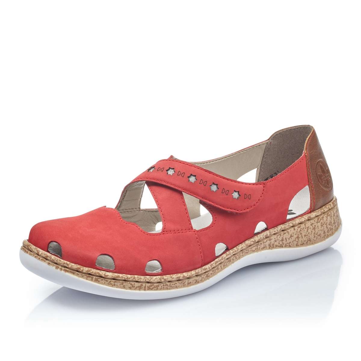 Polobotky v krásně červeném odstínu s hnědou patou oživí Váš šatník ať už vyrazíte do práce nebo do města. Boty mají ve spodní části efektní děrování, díky kterému jsou velmi prodyšné. Pro snadnější obouvání je přes nárt pásek na suchý zip zdobený vyřezávanými hvězdičkami s třpytivým podkladem.