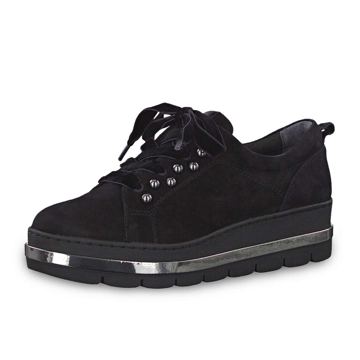 Vysoká platforma dominuje celkovému vzhledu této polobotky. Tato obuv je vhodná pro ženy, které nemají rády podpatky, a přesto si chtějí přidat pár centimetrů. Podešev má lemování lesklým proužkem pro hezčí vizuální dojem a hrubší vzorek ze spodní části platformy pro funkčnost na kluzkém povrchu. Šněrování Vám ulehčí nazouvání a kvalitní svršek zaručí celkové pohodlí i při dlouhodobém nošení. Díky klasické černé barvě si můžete boty obout do práce i na volný čas.