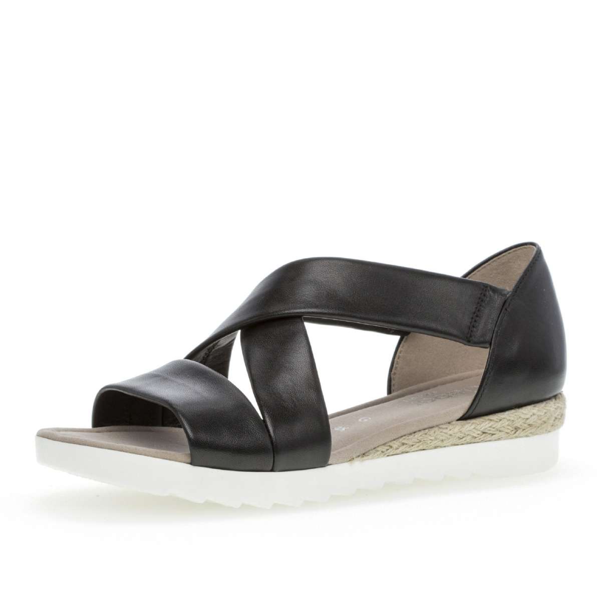 Dámské kožené sandále značky GABOR, černé barvy budou to pravé. Bota má uzavřenou patu a přes nárt je zdobena širšími pásky. Pásky kolem kotníku mají vložené pružné gumičky pro snadné obutí a přizpůsobení k Vaší noze. Obuv poskytuje více prostoru pro prsty a bříška palců, podešev je zdobená pleteným vzorem. Tento typ sandálů je vhodný na procházky, do práce nebo i na společenské akce..