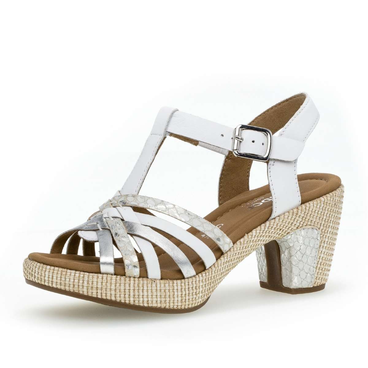 Dámské kožené sandálky značky GABOR, v bílé barvě s propletenými řemínky, které mají decentní odlesky. Pohodlí i při dlouhodobé chůzi budete mít díky stélce Comfort G, která poskytuje dostatečný prostor pro prsty. Nazouvání si ulehčíte řemínkem přes nárt a zapínáním sponkou s vsazenými gumičkami. Podešev i s podpatkem jsou ozdobou celé boty a zaujmou na první pohled. Sandále si můžete obout k džínům nebo sukni.