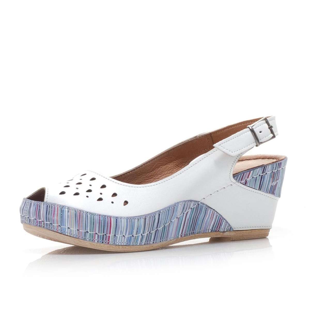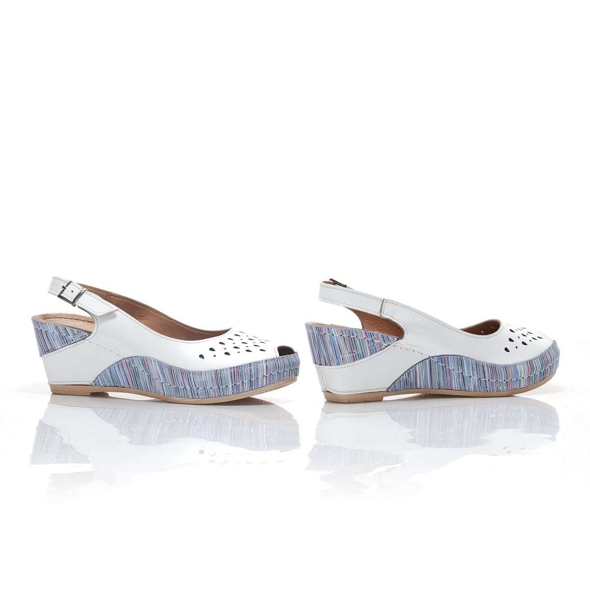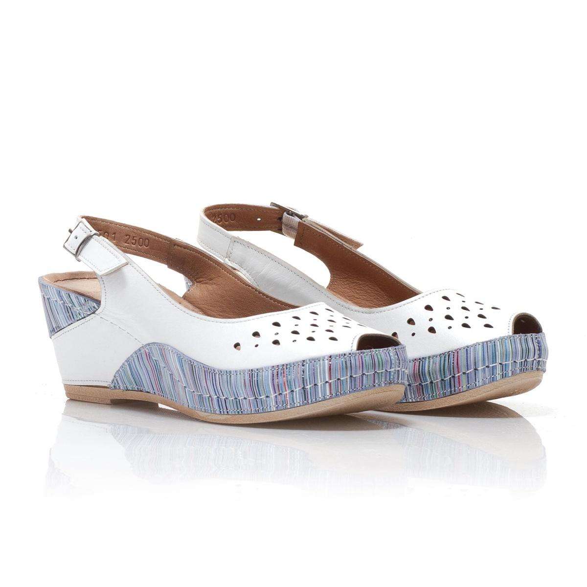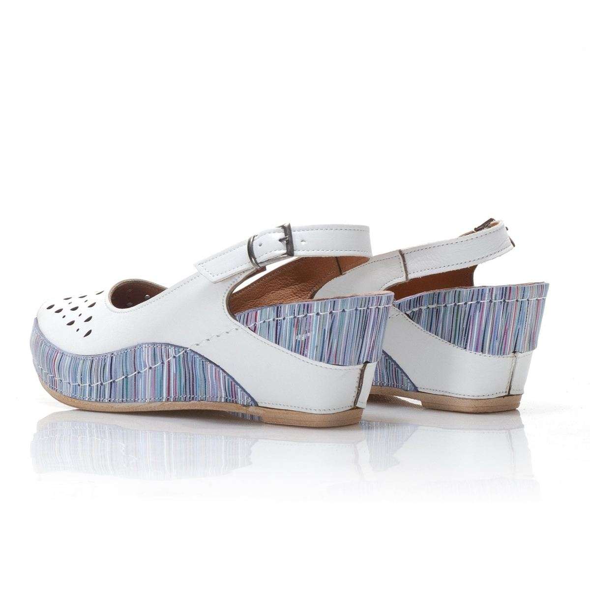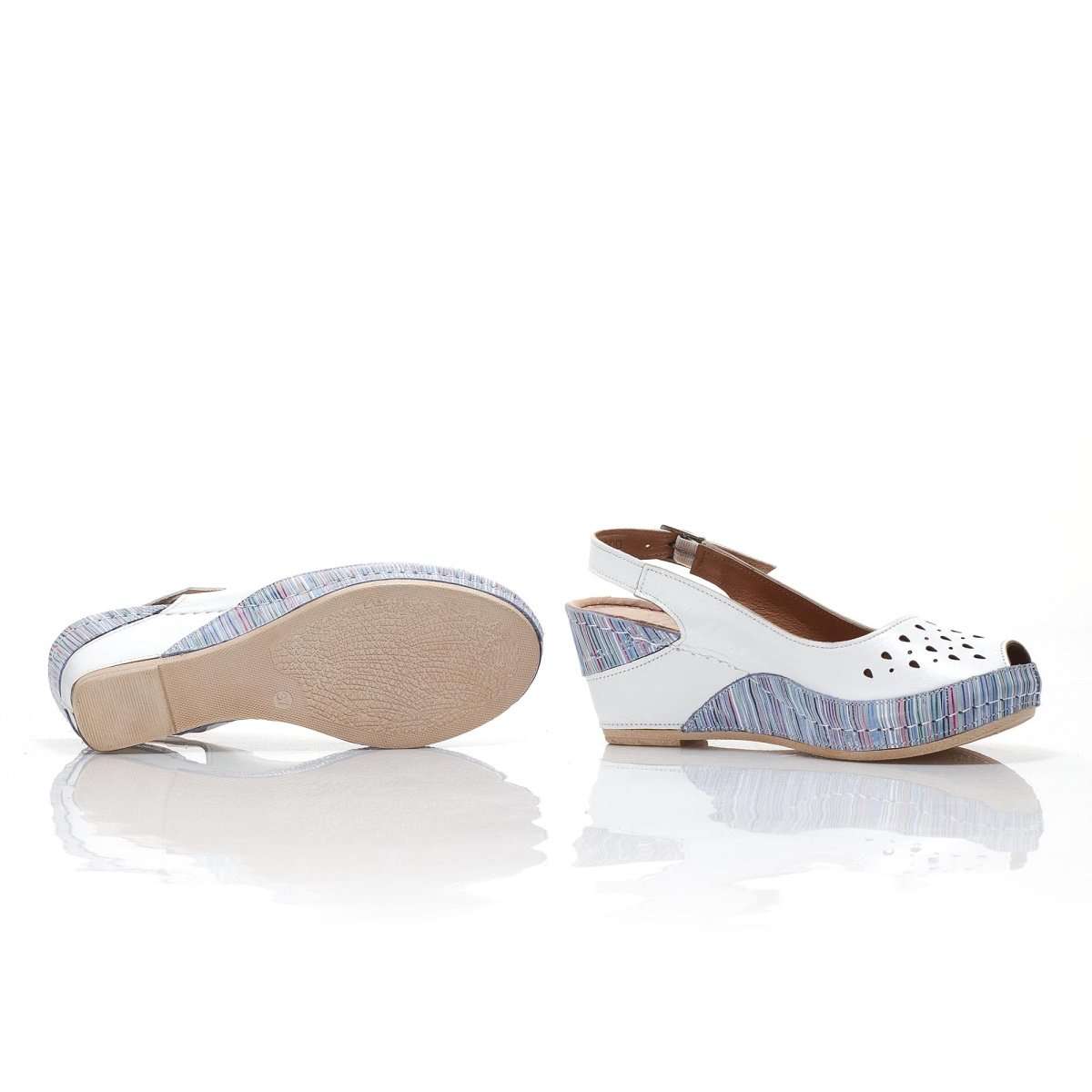 Zajímavé dámské sandály šité z pravé kůže mají hladký povrch a kulatou špičku. Zdobené jsou perforací svršku a kombinací barev. Na vnější straně je přezka pro úpravu přímo k Vaší noze. Tento model unosíte k procházkám letní přírodou, ale i do práce.