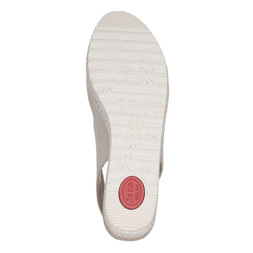 Tyto dámské sandálky od značky Jana jsou ideální na letní slunečné dny. V oblasti paty je pásek s přezkou, díky které si můžete obuv uzpůsobit podle svých představ. Měkká stélka je velmi pohodlná, takže se nemusíte bát dlouhých dnů na nohou. Vyvýšená podešev převážně v oblasti paty působí elegantně. Tento model lehce sladíte s každým outfitem, tudíž nesmí chybět ve Vašem botníku. Technologie: Jana Relax – vyměkčené místo pod patou pro pohodlný došlap, tzv. shock point, snižuje nárazy na patu a její zatížení, čímž zpříjemňuje chůzi a snižuje únavu nohy