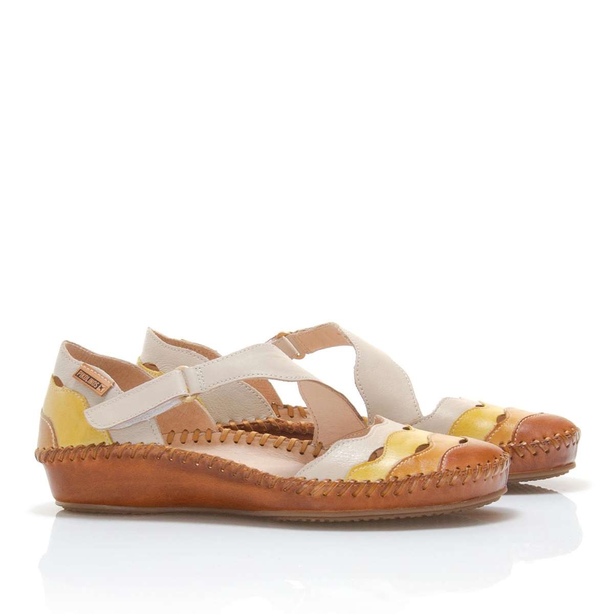 Dámské sandály s plnou špicí a pevnou patou vyrobené z pravé kůže mají hladký povrch navíc kulatou špičku. Zdobené jsou tvarem pásků a jejich barevnou kombinací. Pásek přes nárt má na vnější straně suchý zip pro snadné obutí a přizpůsobení se přímo k Vaší noze.