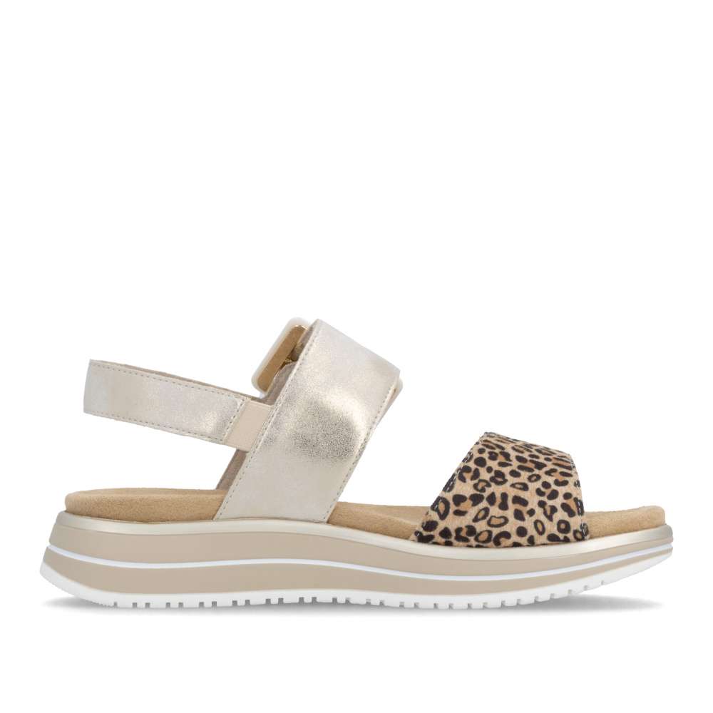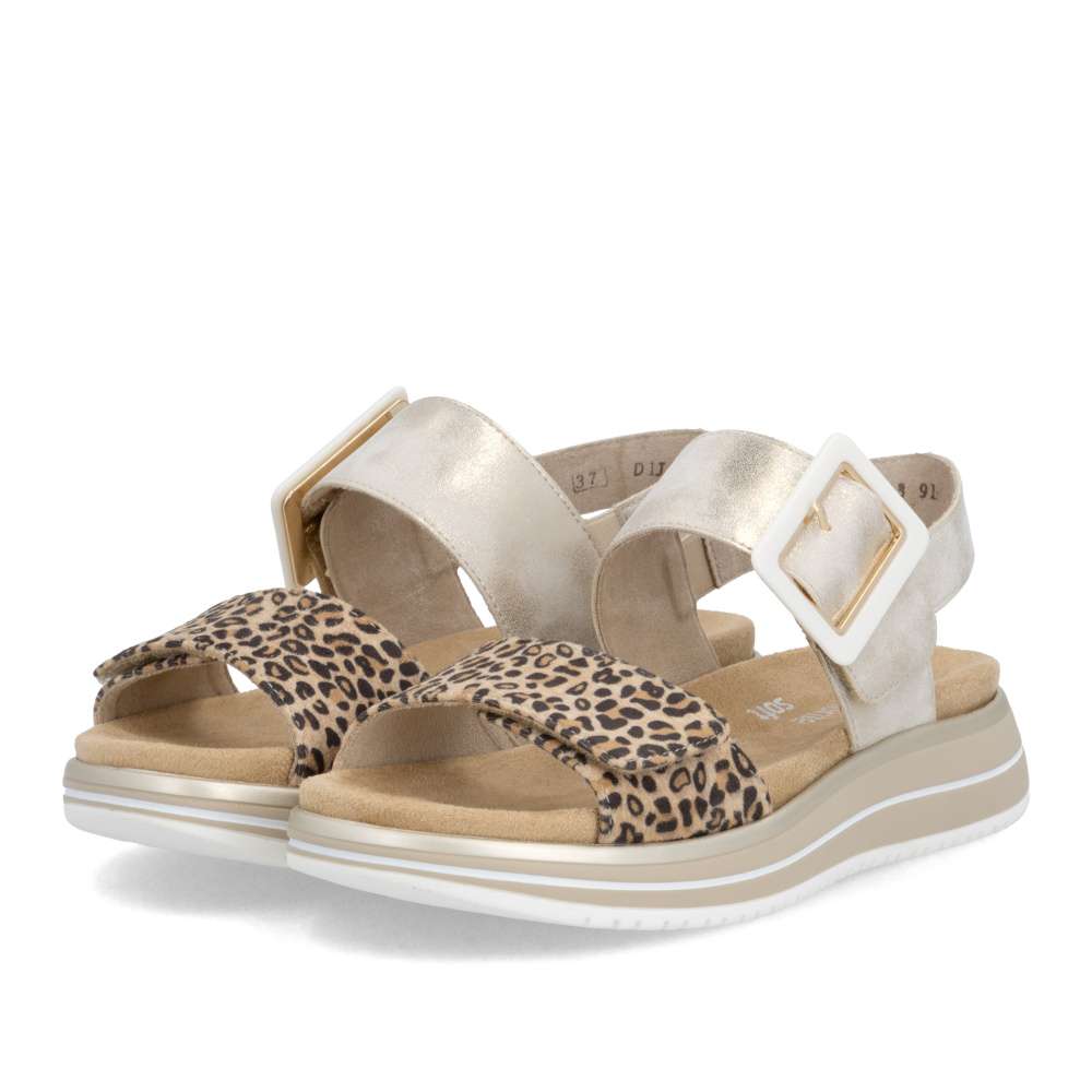 Detailní informace Obuv REMONTE představuje prémiovou řadu značky RIEKER, která se vyznačuje vysokou kvalitou použitých materiálů a precizním zpracováním. Módním skvostem jsou tyto sandály RIEKER, které zaujmou svým stylovým designem a komfortem při nošení. Vizuálně atraktivní kombinace materiálu se zlatavými odlesky a zvířecího motivu dodává sandálům výrazný vzhled, který okamžitě upoutá pozornost. Oba pásky jsou vybaveny praktickým suchým zipem, který umožňuje snadné obouvání a zároveň optimální přizpůsobení noze. Pásek u kotníku je navíc doplněn výraznou sponou, která působí jako stylový detail a podtrhuje celkovou eleganci modelu. Vyjímatelná textilní stélka poskytuje nejen příjemný komfort během celého dne, ale také praktickou flexibilitu. Umožňuje snadné vyjmutí a čištění, což udržuje obuv svěží a hygienickou. Sandály mají vyšší podešev s působivým designem, která zajišťuje stabilitu a zvýrazňuje celkový moderní vzhled. Tyto sandály RIEKER spojují esteticky přitažlivý design s praktickými detaily a komfortem, čímž se stávají ideální volbou pro letní dny, volný čas i elegantnější příležitosti.