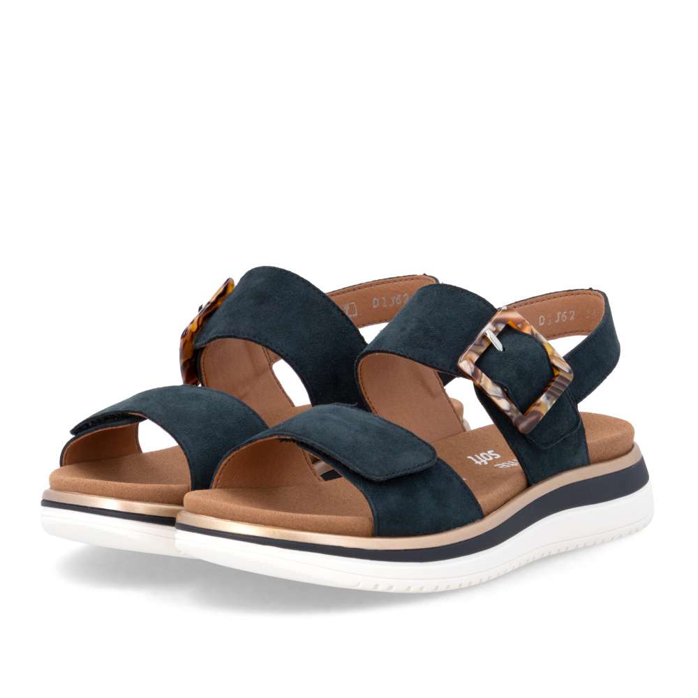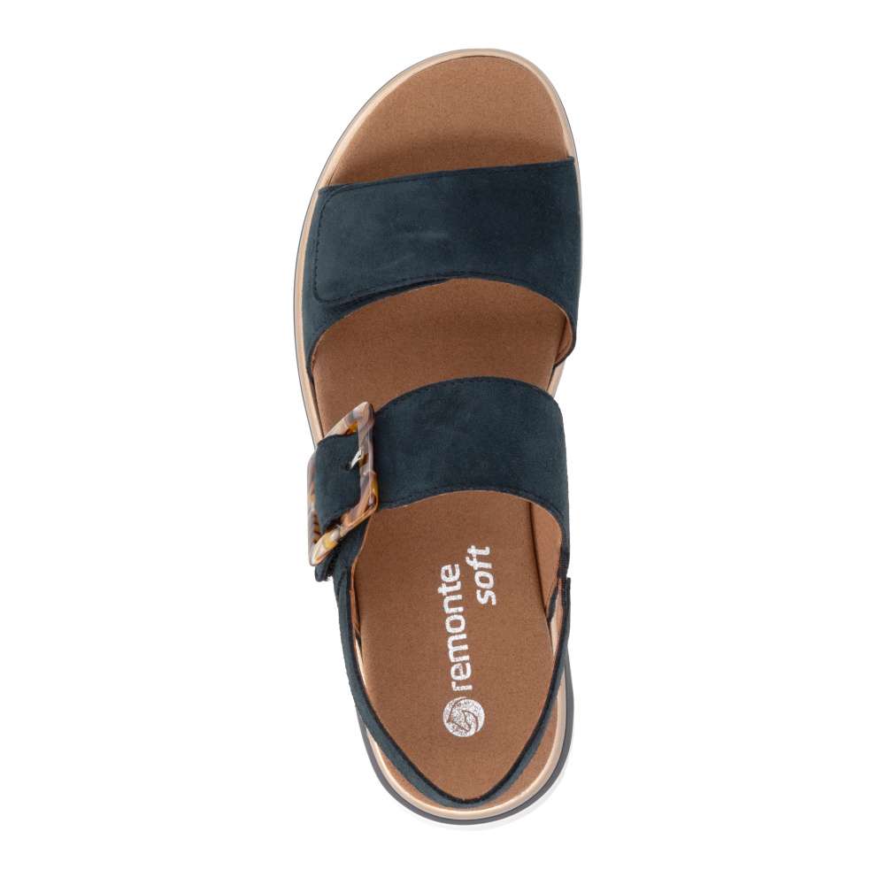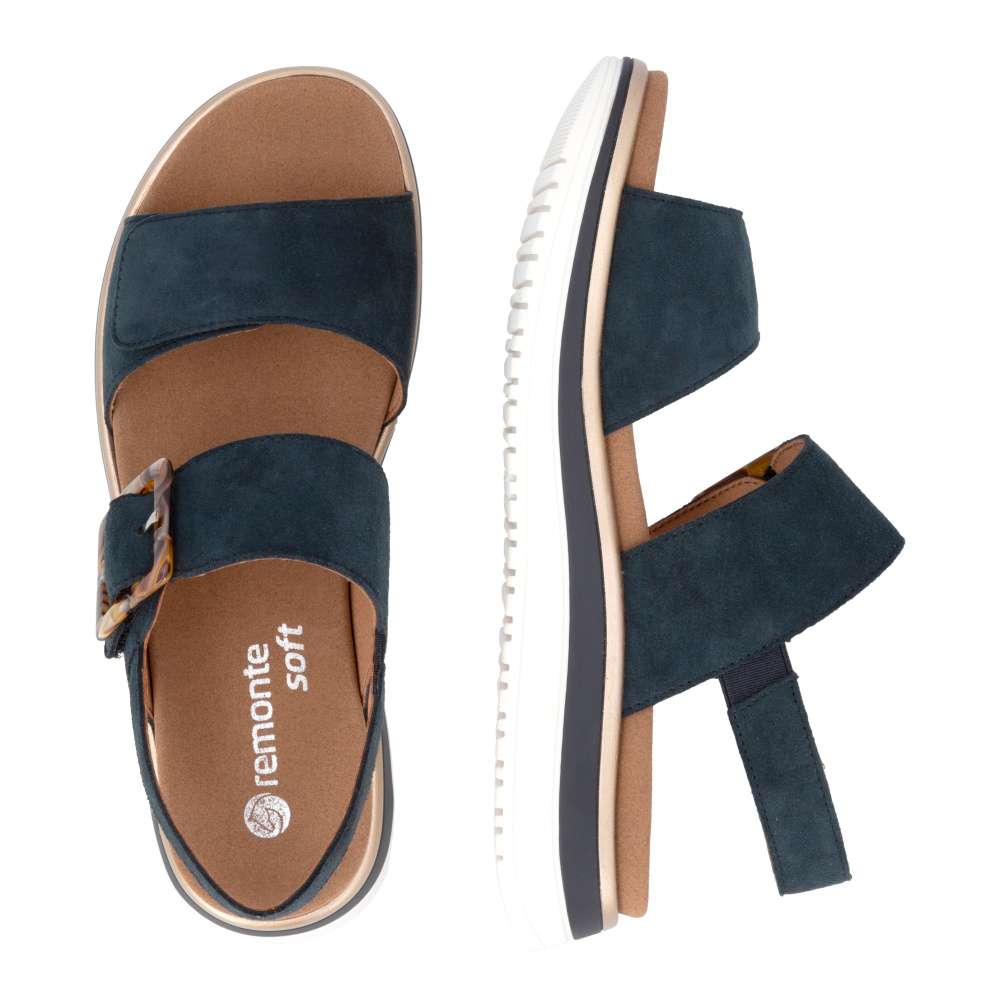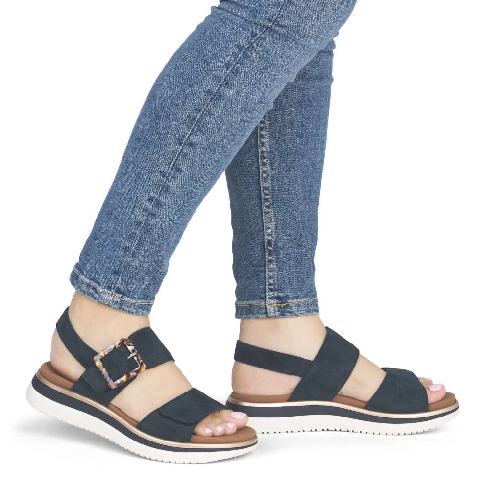 Obuv REMONTE představuje prémiovou řadu značky RIEKER, která se vyznačuje vysokou kvalitou použitých materiálů a precizním zpracováním. Tyto sandály RIEKER zaujmou již na první pohled svým stylovým designem a následně poskytovaným výjimečným komfortem, který oceníte při každém kroku. Tmavě modrý kožený svršek působí elegantně a nadčasově, díky čemuž sandály snadno zkombinujete s různými letními outfity. Jedinečným detailem, který okamžitě upoutá pozornost, je výrazná spona na pásku u kotníku, která dodává obuvi osobitý charakter. Oba pásky jsou vybaveny praktickým suchým zipem, který umožňuje rychlé a pohodlné obouvání, a zároveň zajišťuje optimální přizpůsobení noze. Díky tomu se sandály příjemně přizpůsobí tvaru chodidla a nabídnou maximální pohodlí při celodenním nošení. Vyjímatelná textilní stélka poskytuje nejen komfort při každém došlapu, ale také mimořádnou praktičnost. Možnost snadného vyjmutí a očištění zajišťuje, že obuv zůstává svěží, hygienická a připravená k dalšímu nošení – což oceníte zejména v horkých letních dnech. Vyšší podešev s atraktivním, moderním designem dodává sandálům stabilitu a příjemné tlumení, přičemž esteticky zvýrazňuje jejich elegantní vzhled. Tyto sandály RIEKER představují dokonale vyváženou kombinaci esteticky přitažlivého designu, promyšlených praktických detailů a vysoké úrovně pohodlí. Jsou ideální volbou pro každodenní nošení, volnočasové aktivity io něco elegantnější příležitosti, kde se chcete cítit stylově a zároveň pohodlně.