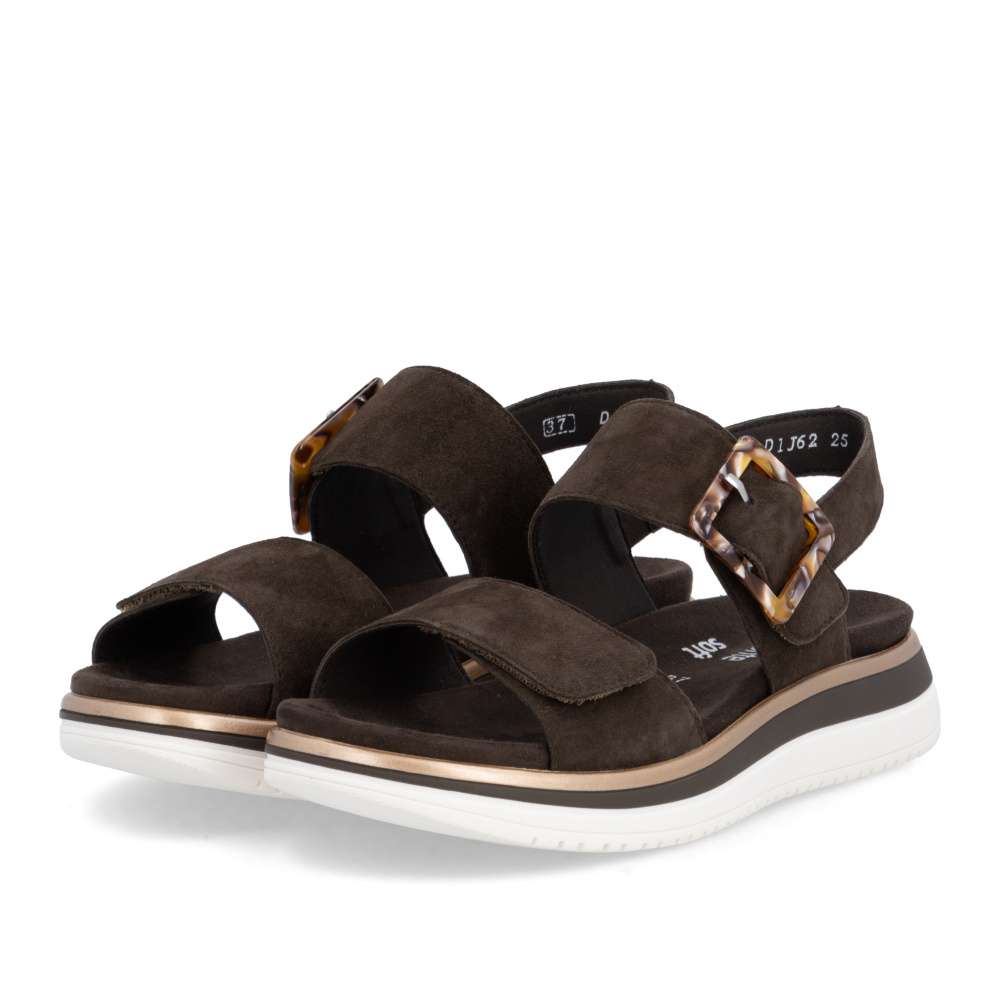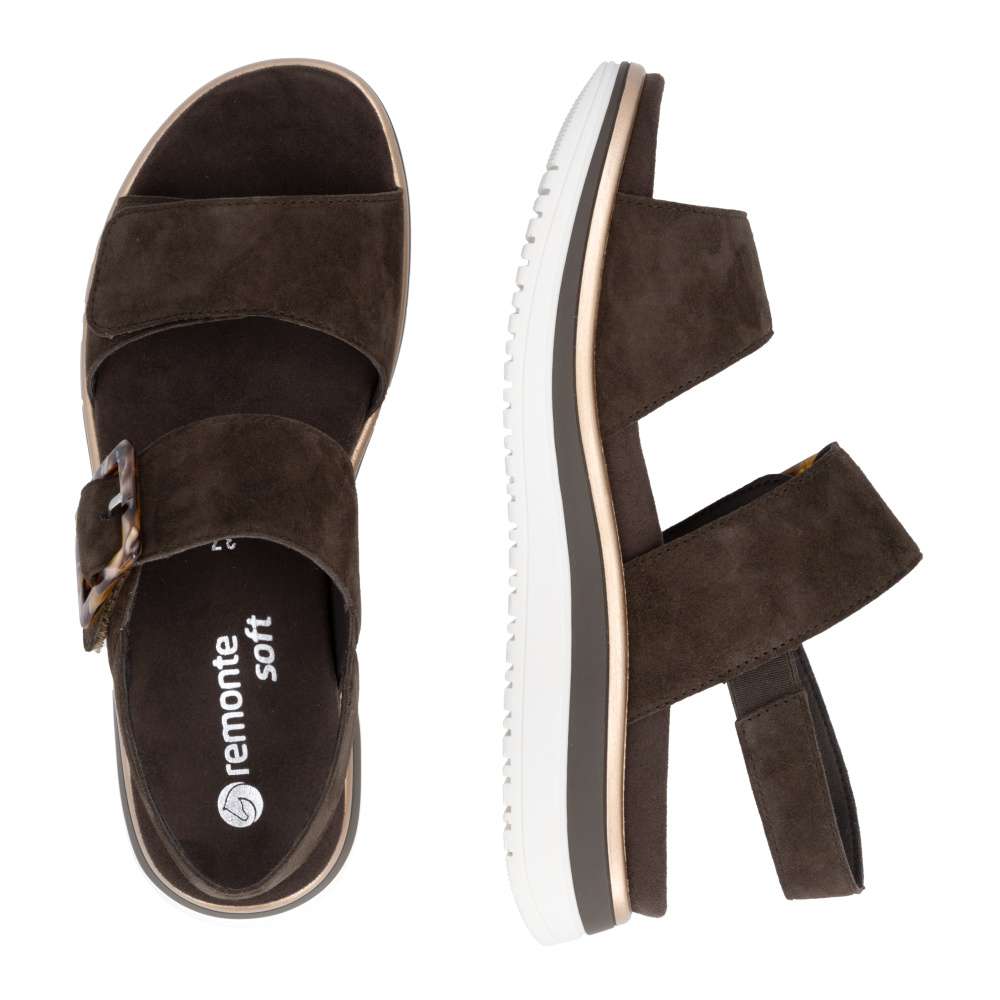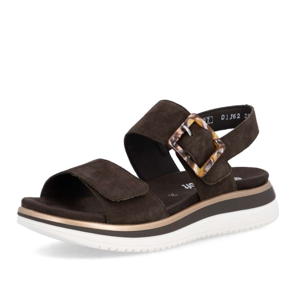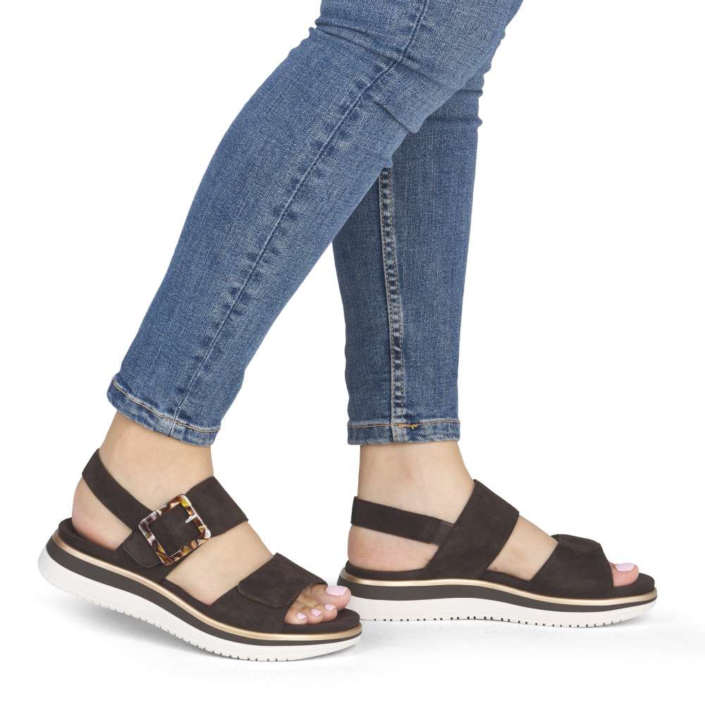 Obuv REMONTE představuje prémiovou řadu značky RIEKER, která se vyznačuje vysokou kvalitou použitých materiálů a precizním zpracováním. Tyto sandály RIEKER zaujmou již na první pohled svým stylovým designem a následně poskytovaným výjimečným komfortem, který oceníte při každém kroku. Hnědý kožený svršek působí nadčasově, díky čemuž sandály snadno zkombinujete s různými letními outfity. Jedinečným detailem, který okamžitě upoutá pozornost, je výrazná spona na pásku u kotníku, která dodává obuvi osobitý charakter. Oba pásky jsou vybaveny praktickým suchým zipem, který umožňuje rychlé a pohodlné obouvání, a zároveň zajišťuje optimální přizpůsobení noze. Díky tomu se sandály příjemně přizpůsobí tvaru chodidla a nabídnou maximální pohodlí při celodenním nošení. Vyjímatelná textilní stélka poskytuje nejen komfort při každém došlapu, ale také mimořádnou praktičnost. Možnost snadného vyjmutí a očištění zajišťuje, že obuv zůstává svěží, hygienická a připravená k dalšímu nošení – což oceníte zejména v horkých letních dnech. Vyšší podešev s atraktivním, moderním designem dodává sandálům stabilitu, přičemž esteticky zvýrazňuje jejich elegantní vzhled. Tyto sandály jsou ideální volbou pro každodenní nošení, volnočasové aktivity io něco elegantnější příležitosti, kde se chcete cítit stylově a zároveň pohodlně.