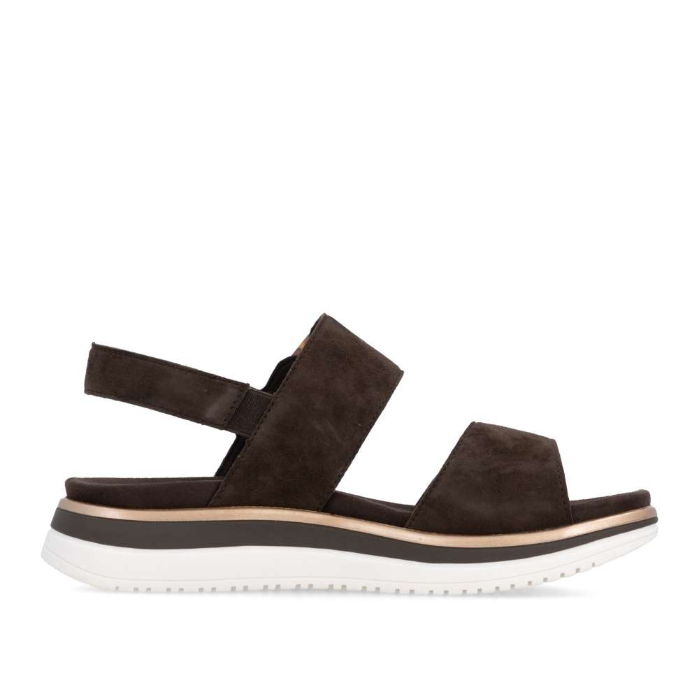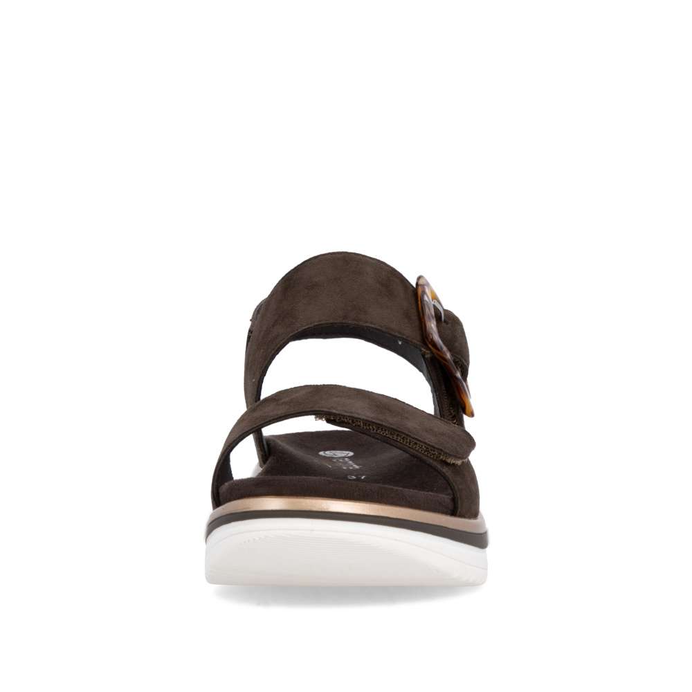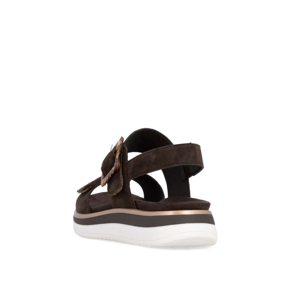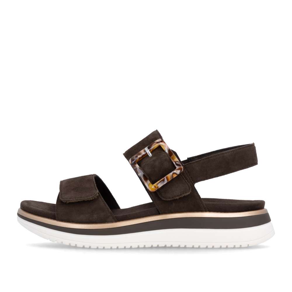 Obuv REMONTE představuje prémiovou řadu značky RIEKER, která se vyznačuje vysokou kvalitou použitých materiálů a precizním zpracováním. Tyto sandály RIEKER zaujmou již na první pohled svým stylovým designem a následně poskytovaným výjimečným komfortem, který oceníte při každém kroku. Hnědý kožený svršek působí nadčasově, díky čemuž sandály snadno zkombinujete s různými letními outfity. Jedinečným detailem, který okamžitě upoutá pozornost, je výrazná spona na pásku u kotníku, která dodává obuvi osobitý charakter. Oba pásky jsou vybaveny praktickým suchým zipem, který umožňuje rychlé a pohodlné obouvání, a zároveň zajišťuje optimální přizpůsobení noze. Díky tomu se sandály příjemně přizpůsobí tvaru chodidla a nabídnou maximální pohodlí při celodenním nošení. Vyjímatelná textilní stélka poskytuje nejen komfort při každém došlapu, ale také mimořádnou praktičnost. Možnost snadného vyjmutí a očištění zajišťuje, že obuv zůstává svěží, hygienická a připravená k dalšímu nošení – což oceníte zejména v horkých letních dnech. Vyšší podešev s atraktivním, moderním designem dodává sandálům stabilitu, přičemž esteticky zvýrazňuje jejich elegantní vzhled. Tyto sandály jsou ideální volbou pro každodenní nošení, volnočasové aktivity io něco elegantnější příležitosti, kde se chcete cítit stylově a zároveň pohodlně.