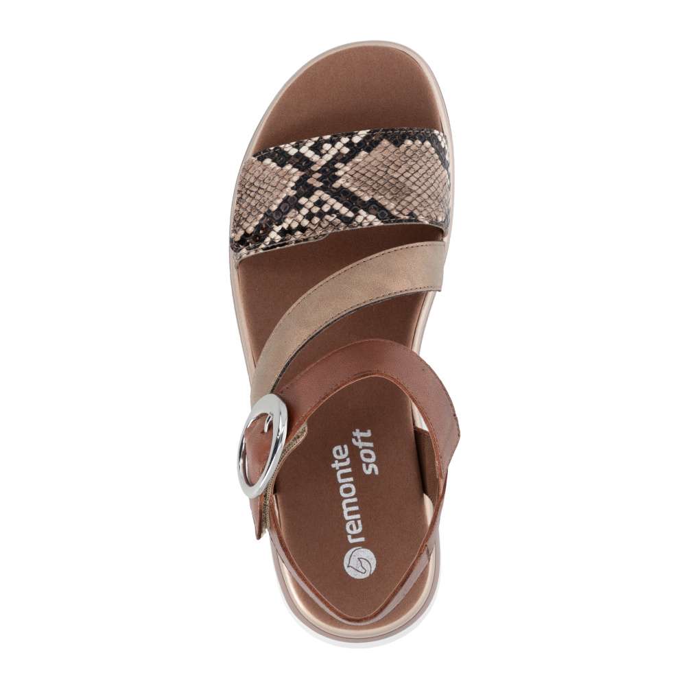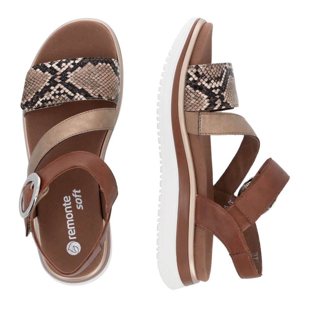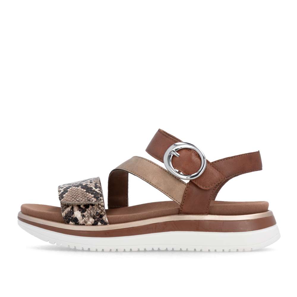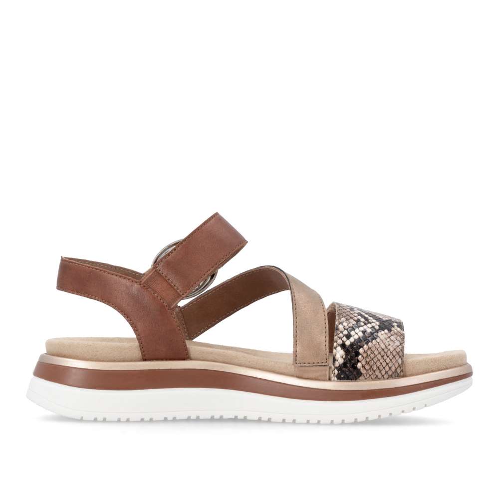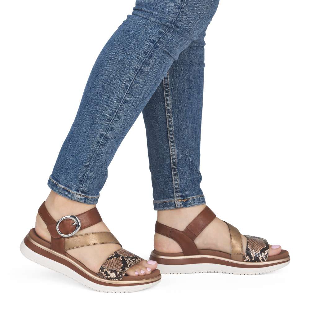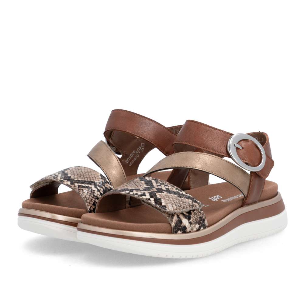 Obuv REMONTE představuje prémiovou řadu značky RIEKER, která se vyznačuje vysokou kvalitou použitých materiálů a precizním zpracováním. Tyto sandály RIEKER představují nezaměnitelnou kombinaci moderního stylu a pohodlí. Jejich výjimečný charakter podtrhuje působivá hra barev, odlesku a vzoru, tyto prvky spolu vytvářejí jedinečný vizuální efekt, který okamžitě oživí váš letní outfit. Obuv nabízí promyšlené řešení v podobě dvou nastavitelných pásků – jeden přes prsty a druhý u kotníku, oba umožňují přesné přizpůsobení chodidlu, což výrazně zvyšuje komfort a stabilitu při chůzi. Pásek u kotníku navíc zdobí výrazná spona, která sandálům dodává stylový akcent a jemný nádech elegance. Vyjímatelná textilní stélka poskytuje nejen oporu při každém kroku, ale také praktickou výhodu v podobě snadné údržby. Můžete ji snadno vyjmout a vyčistit, což zajišťuje, že sandály zůstanou svěží a pohodlné i při každodenním nošení. Vyšší a pevná podešev poskytuje jistotu při chůzi a zároveň podtrhuje stylový vzhled sandálů. Tyto sandály RIEKER spojují esteticky atraktivní design, praktická řešení a vysokou úroveň pohodlí. Jsou ideální volbou pro ženy, které hledají stylový doplněk pro letní dny, volnočasové aktivity či každodenní příležitosti, bez kompromisů mezi krásou a komfortem.