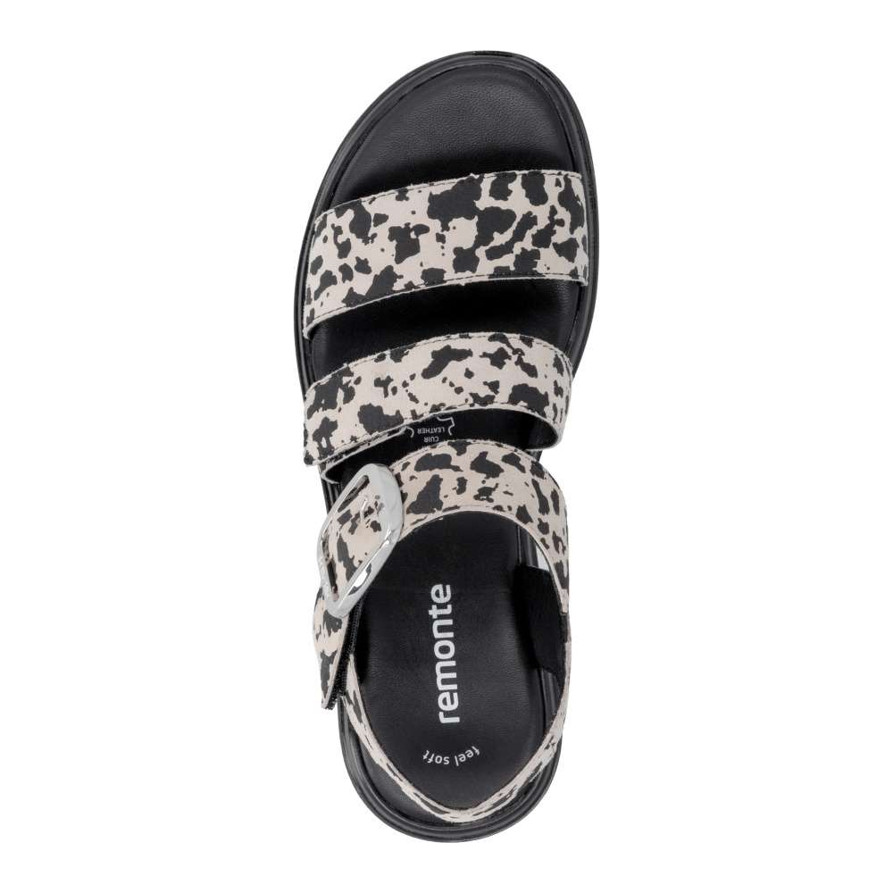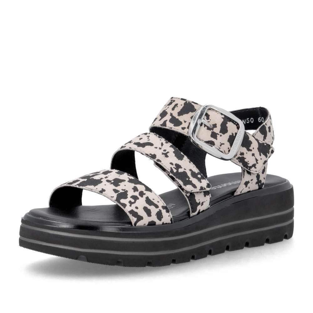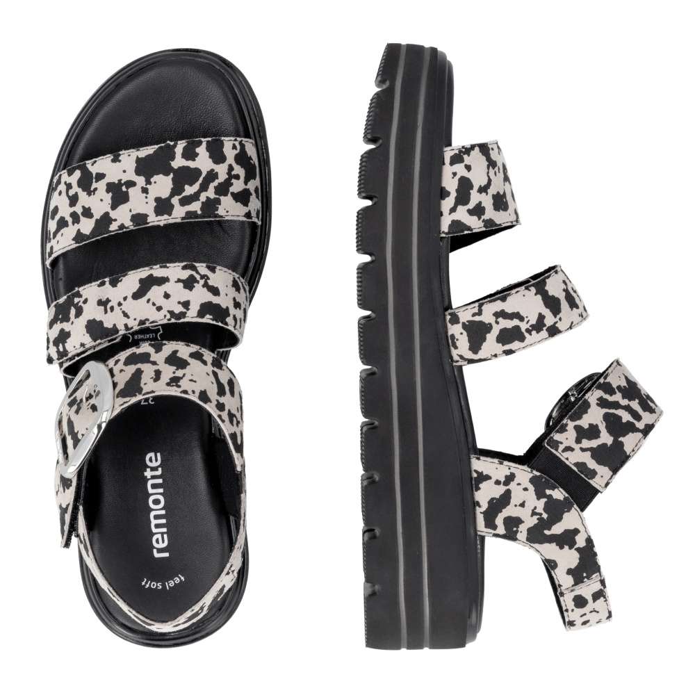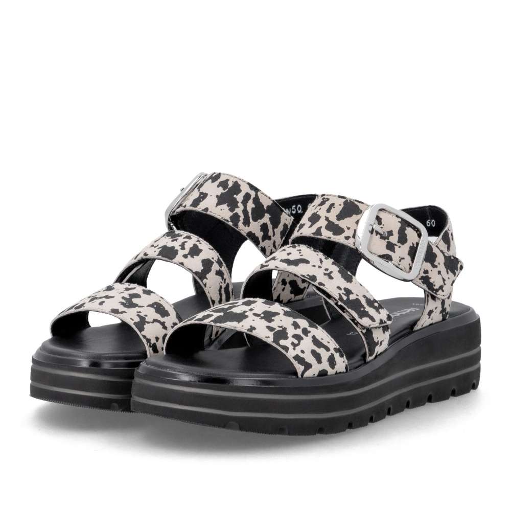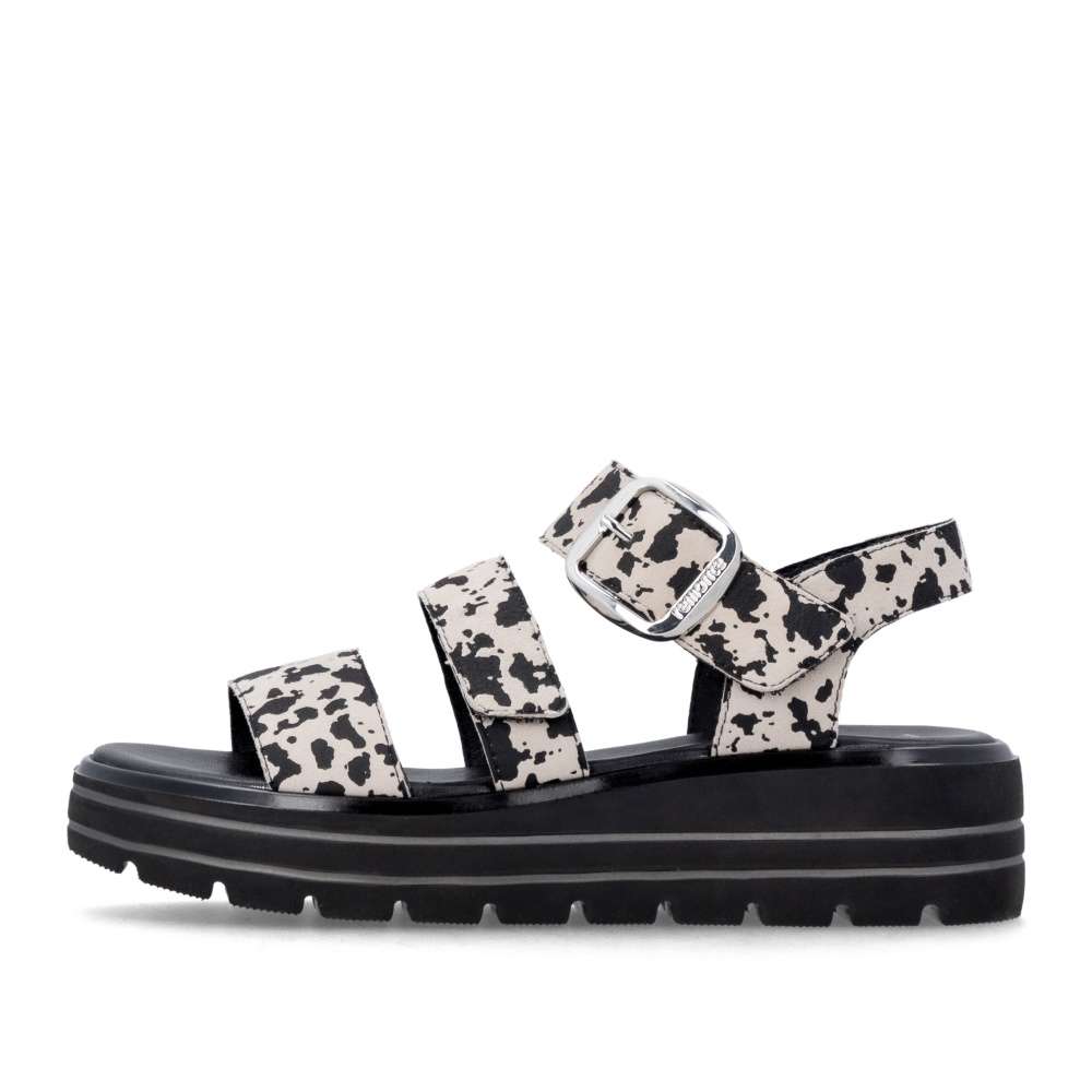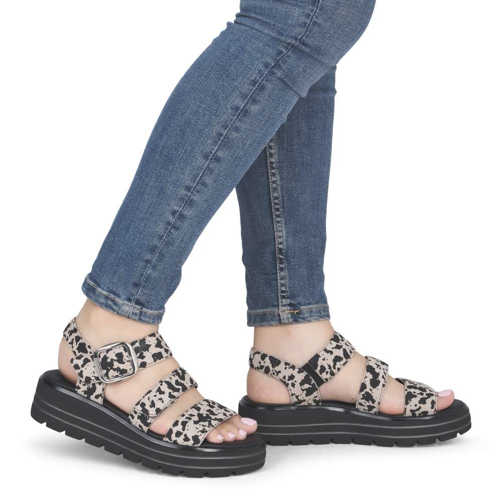 Obuv REMONTE představuje prémiovou řadu značky RIEKER, která se vyznačuje vysokou kvalitou použitých materiálů a precizním zpracováním. Tyto sandály zaujmou efektním vzorem na kožených řemíncích, který dodává obuvi originální vzhled. Pásky jsou navrženy tak, aby opticky zvýraznily nohu, zároveň poskytovaly pohodlné uchycení chodidla. Pásek přes prsty je pevný, aby zajistil stabilitu při každém kroku, zatímco další dva pásky se suchým zipem umožňují individuální nastavení přesně podle tvaru vaší nohy. Dekorační spona stříbrné barvy působí výrazně a dodává sandálům stylový akcent. Kožená stélka vás příjemně překvapí svojí pohodlností a vyšší podešev nejenže zajišťuje jistotu, ale dodává sandálům moderní vzhled. Kvalitní zpracování, funkční řešení a působivé detaily dělají z tohoto modelu skvělého společníka na letní dny – ať už se chystáte do práce, na pochůzky nebo na procházku městem.