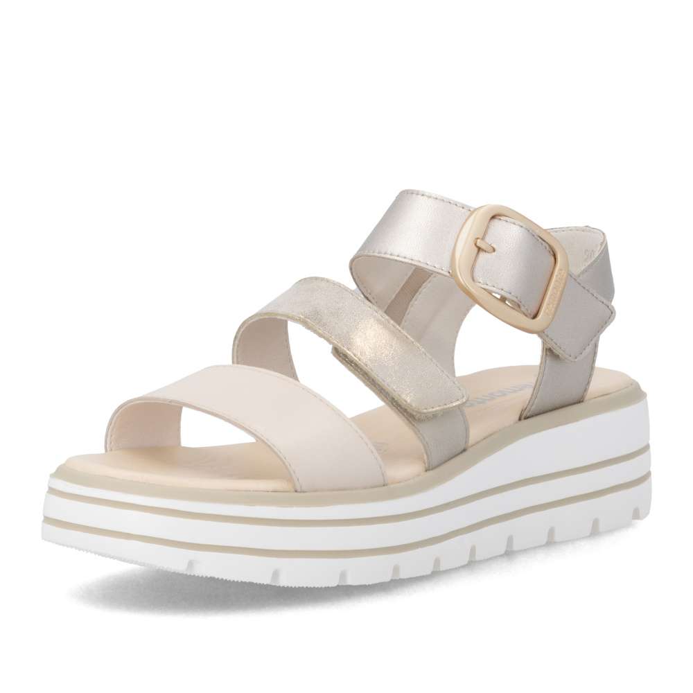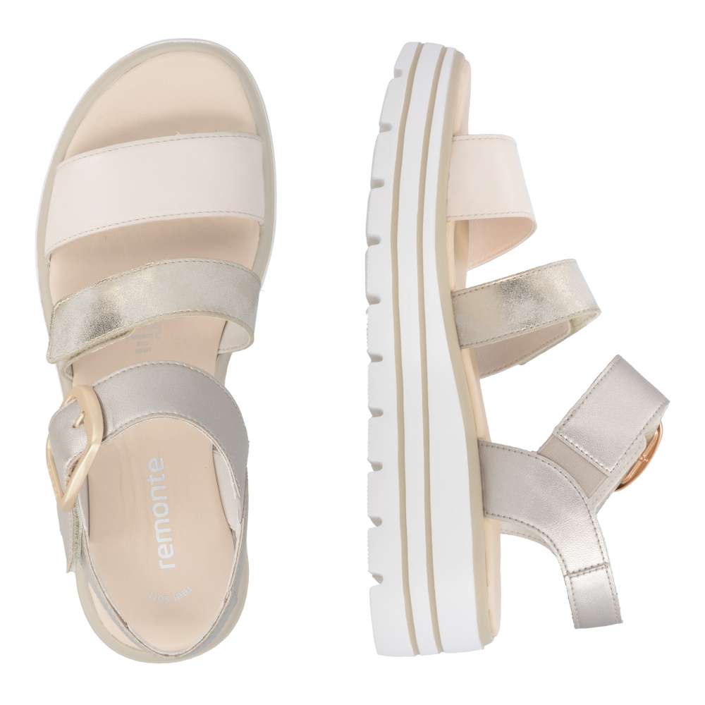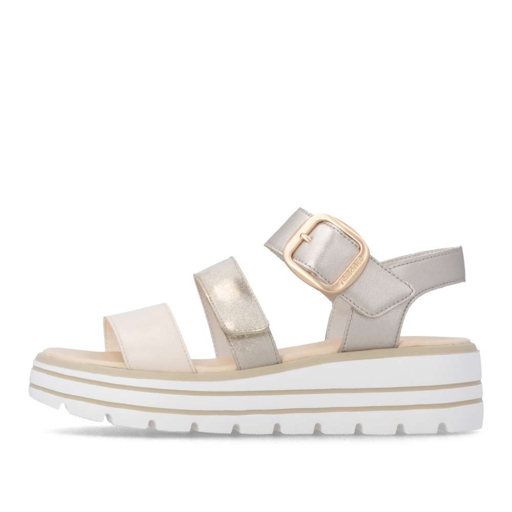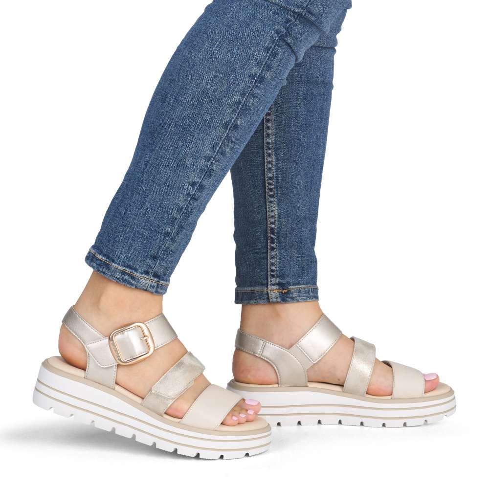 Obuv REMONTE představuje prémiovou řadu značky RIEKER, která se vyznačuje vysokou kvalitou použitých materiálů a precizním zpracováním. Tyto sandály zaujmou působivou kombinací barev a metalických odlesků na kožených řemíncích, které dodávají obuvi originální a módní vzhled. Pásky jsou navrženy tak, aby opticky zvýraznily nohu, zároveň poskytovaly pohodlné uchycení chodidla. Pásek přes prsty je pevný, aby zajistil stabilitu při každém kroku, zatímco další dva pásky se suchým zipem umožňují individuální nastavení přesně podle tvaru vaší nohy. Dekorační spona působí výrazně a dodává sandálům stylový akcent. Kožená stélka vás příjemně překvapí svojí pohodlností a vyšší podešev nejenže zajišťuje jistotu, ale dodává sandálům moderní vzhled. Kvalitní zpracování, funkční řešení a působivé detaily dělají z tohoto modelu skvělého společníka na letní dny – ať už se chystáte do práce, na pochůzky nebo na procházku městem.