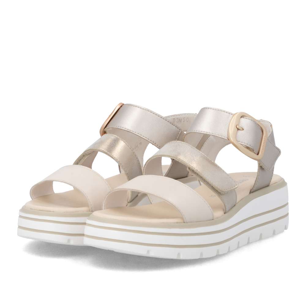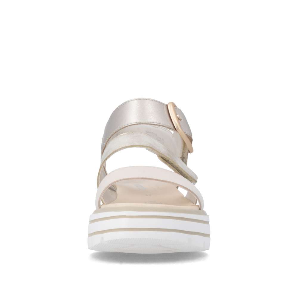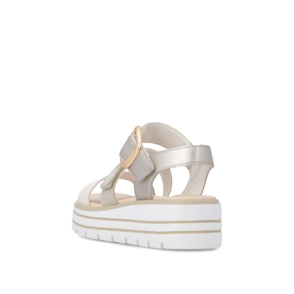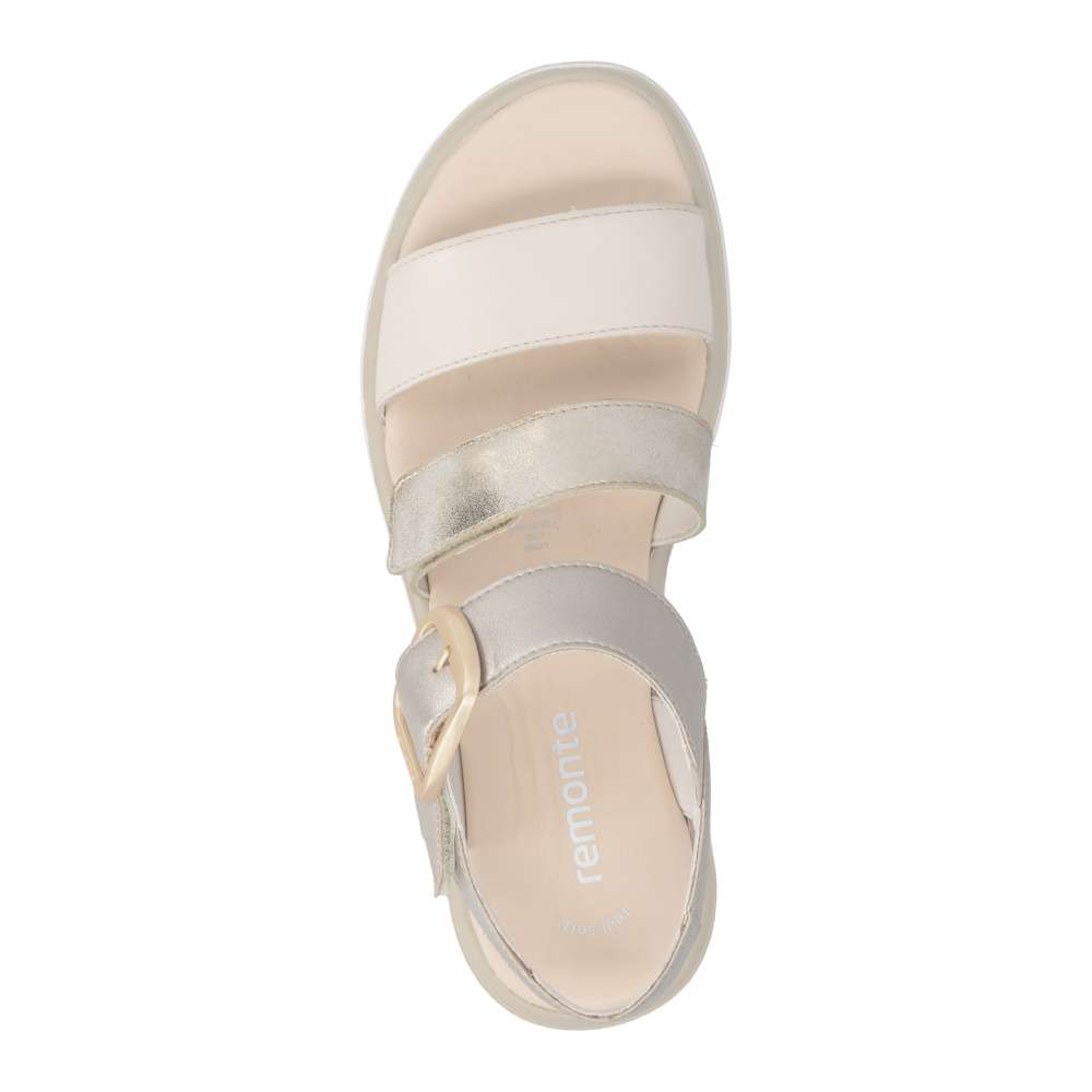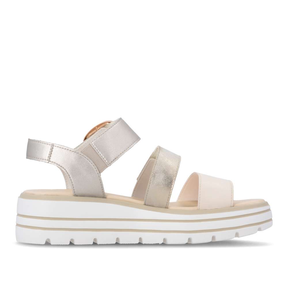 Obuv REMONTE představuje prémiovou řadu značky RIEKER, která se vyznačuje vysokou kvalitou použitých materiálů a precizním zpracováním. Tyto sandály zaujmou působivou kombinací barev a metalických odlesků na kožených řemíncích, které dodávají obuvi originální a módní vzhled. Pásky jsou navrženy tak, aby opticky zvýraznily nohu, zároveň poskytovaly pohodlné uchycení chodidla. Pásek přes prsty je pevný, aby zajistil stabilitu při každém kroku, zatímco další dva pásky se suchým zipem umožňují individuální nastavení přesně podle tvaru vaší nohy. Dekorační spona působí výrazně a dodává sandálům stylový akcent. Kožená stélka vás příjemně překvapí svojí pohodlností a vyšší podešev nejenže zajišťuje jistotu, ale dodává sandálům moderní vzhled. Kvalitní zpracování, funkční řešení a působivé detaily dělají z tohoto modelu skvělého společníka na letní dny – ať už se chystáte do práce, na pochůzky nebo na procházku městem.