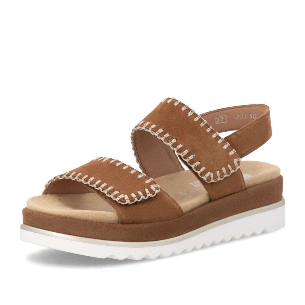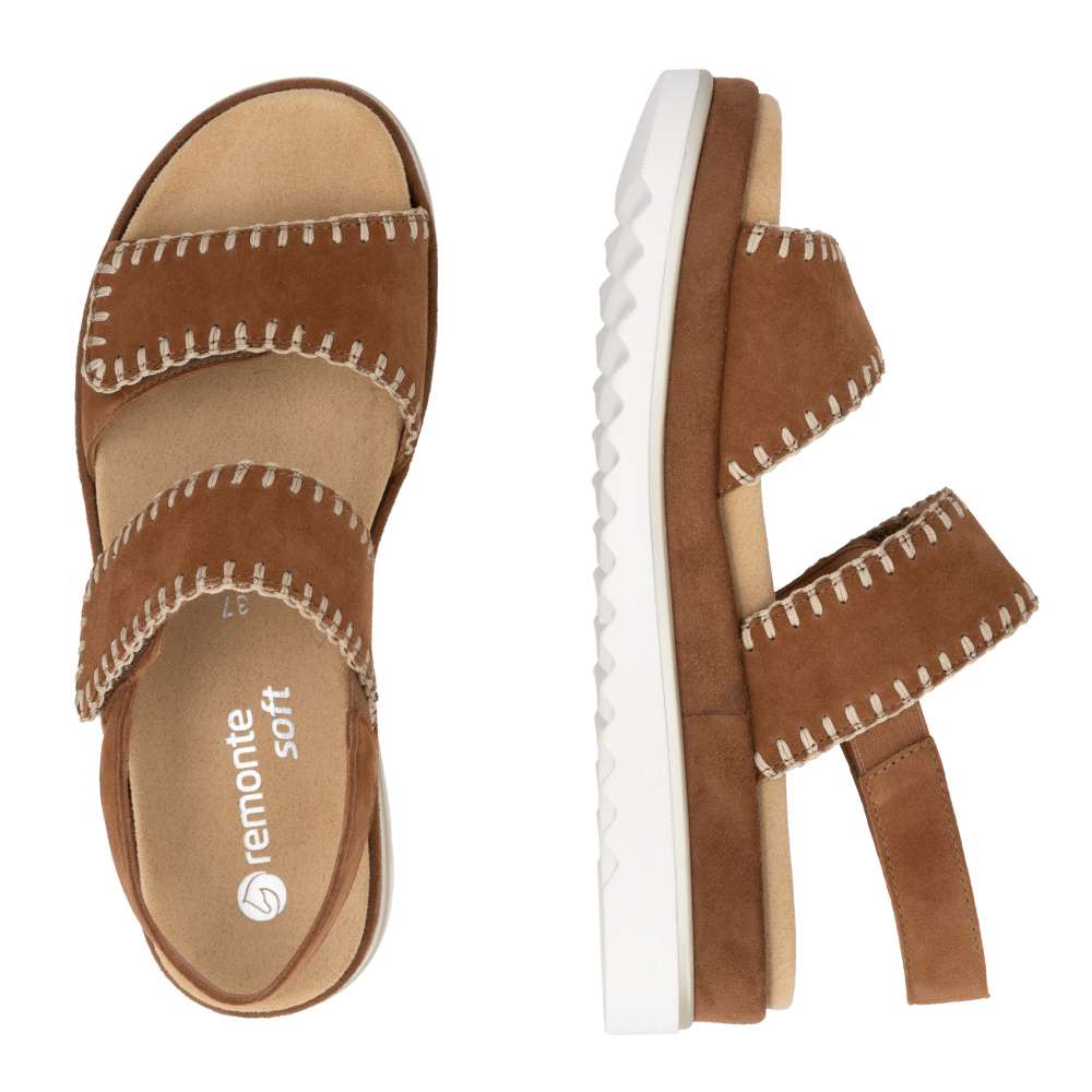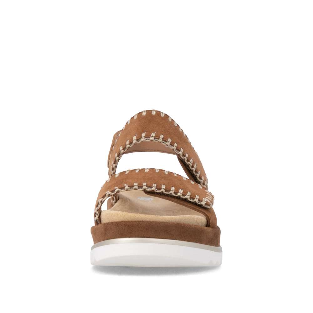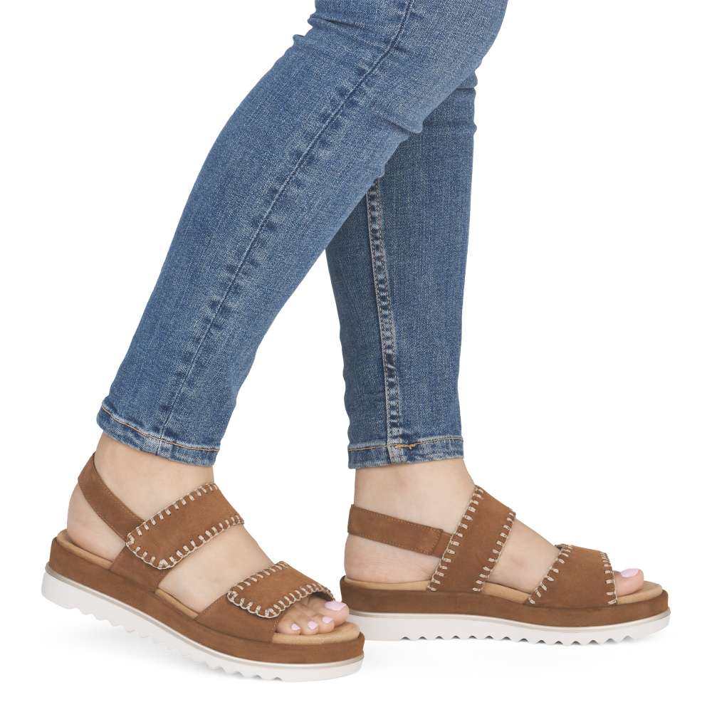 Obuv REMONTE představuje prémiovou řadu značky RIEKER, která se vyznačuje vysokou kvalitou použitých materiálů a precizním zpracováním. Tyto sandály zaujmou hnědým koženým svrškem s výrazným šitím po obvodu pásků, které dodává obuvi stylový vzhled. Pásek přes nárt a prsty je opatřen suchým zipem, který umožňuje snadné přizpůsobení obuvi tvaru vaší nohy a zajišťuje pevné uchycení. Zadní pásek je pevný a stabilní, čímž dodává obuvi potřebnou podporu a zajišťuje pohodlnou chůzi. Vyjímatelná textilní stélka je příjemná na dotek a tvarovaná tak, aby poskytovala komfort při delším nošení a usnadnila údržbu sandálů. Vyšší podešev nejen poskytuje oporu při každém kroku, ale její moderní design dodává obuvi jedinečný vzhled a zvýrazňuje charakter tohoto modelu. Díky kombinaci kvalitního zpracování, pohodlných materiálů a promyšlených detailů jsou tyto sandály ideální pro každodenní nošení i speciální letní příležitosti - ať už se chystáte do práce, na nákupy, procházku městem nebo setkání s přáteli. Tento model spojuje komfort, styl a lehkost každého kroku, což z něj činí skvělého společníka na letní dny.
