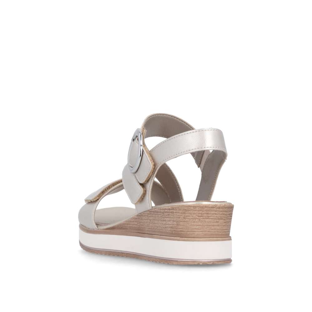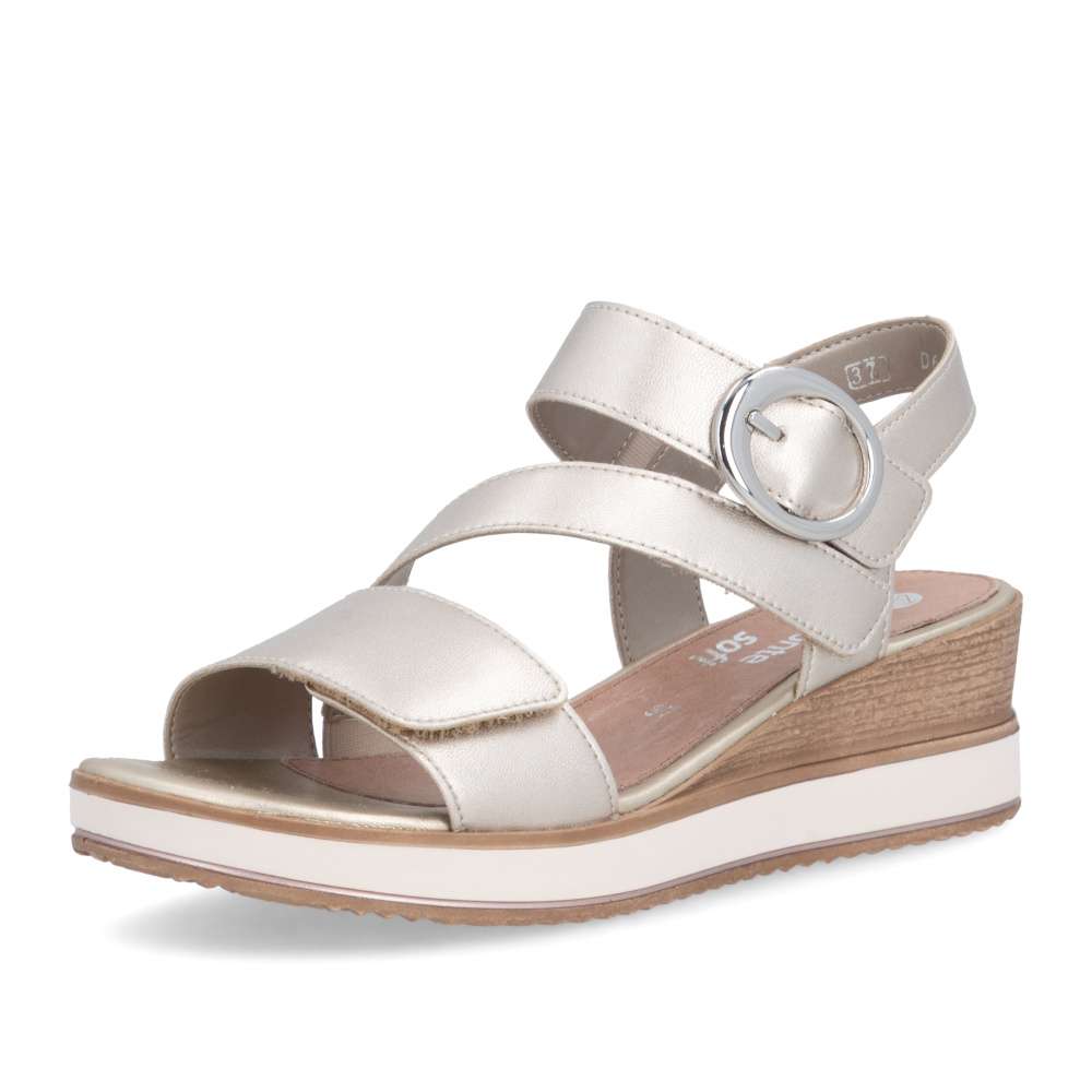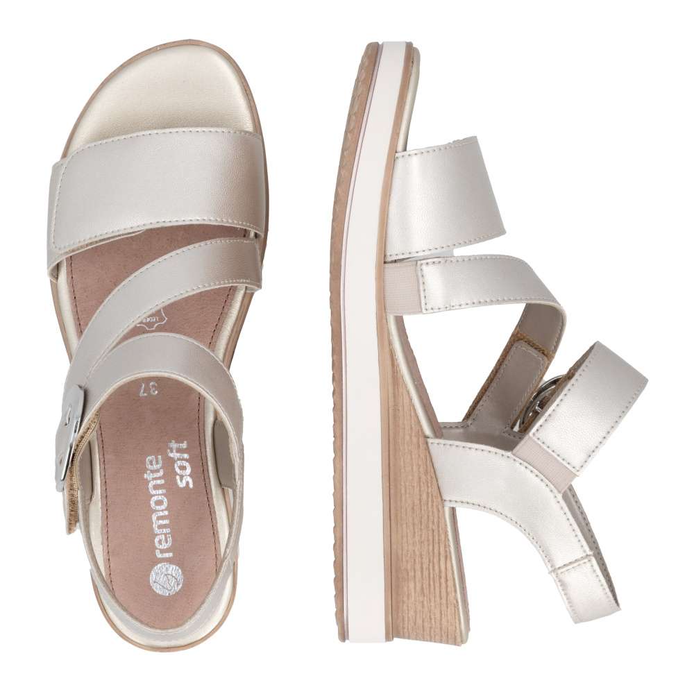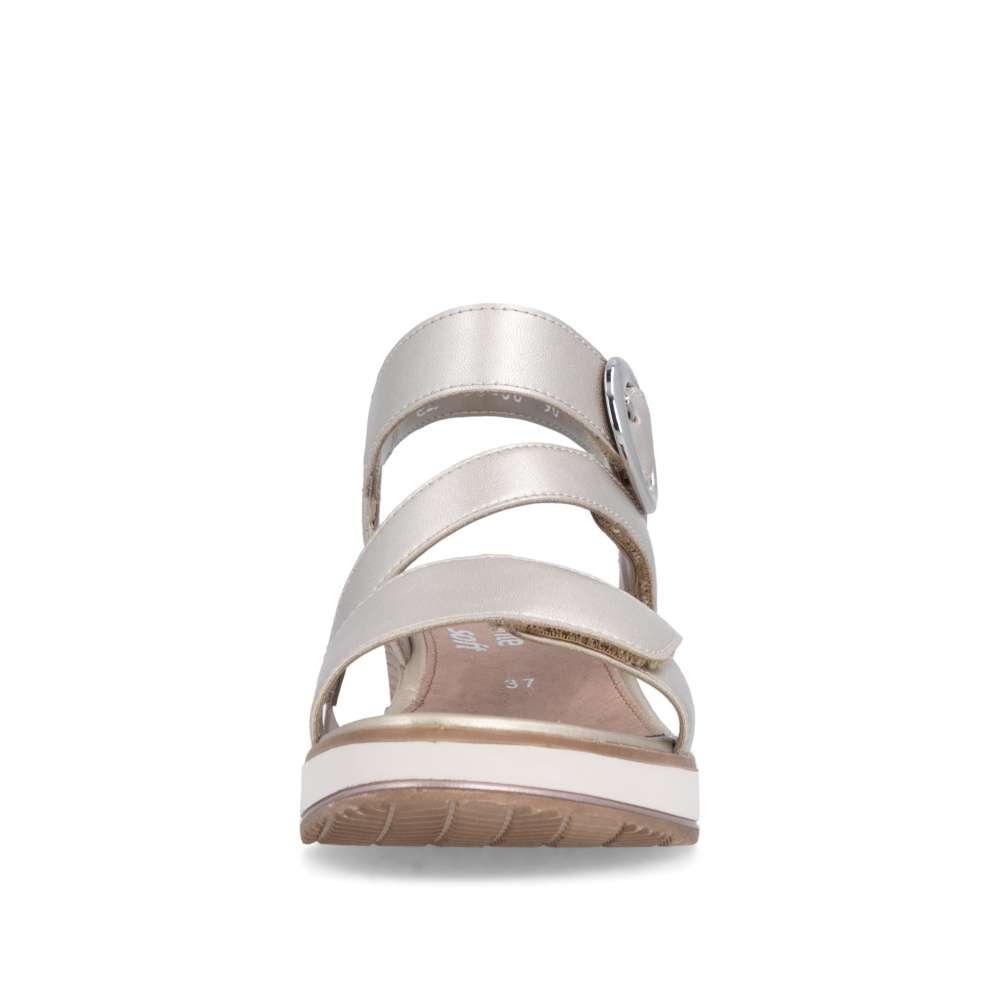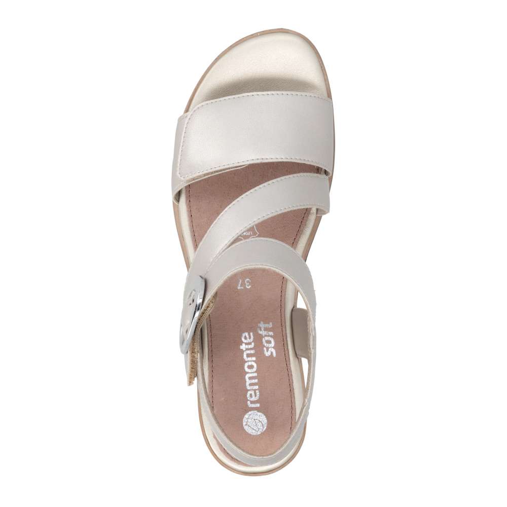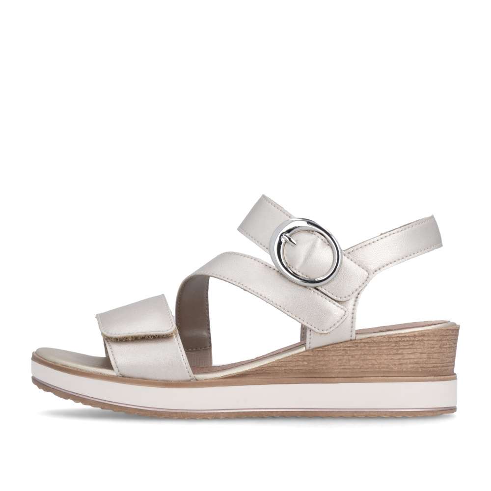 Obuv REMONTE představuje prémiovou řadu značky RIEKER, která se vyznačuje vysokou kvalitou použitých materiálů a precizním zpracováním. Tyto kožené sandály RIEKER s působivými odlesky jsou spojením elegantního designu a praktické funkčnosti. Svršek je tvořen pásky vytvářejícími vizuálně zajímavý a působivý vzhled, který okamžitě přitáhne pozornost. Pásek u kotníku je doplněn výraznou stříbrnou sponou, která dodává sandálům luxusní detail. Praktické suché zipy umožňují snadné obouvání a zároveň zajišťuje, že sandály perfektně padnou na nohu. Stélka poskytuje příjemný došlap každým krokem a vyšší podešev jemně zvýrazní ženský půvab. Sandály RIEKER jsou skvělou volbou pro různé příležitosti – od procházek městem, přes každodenní nošení do práce, až po elegantní letní večery.