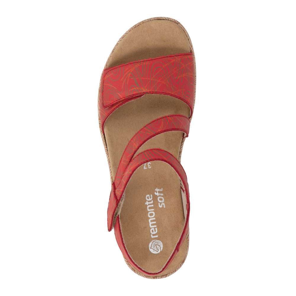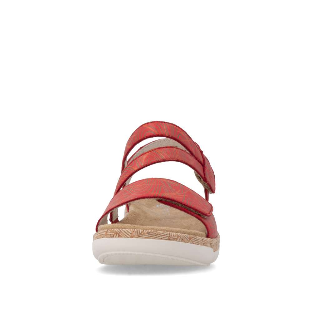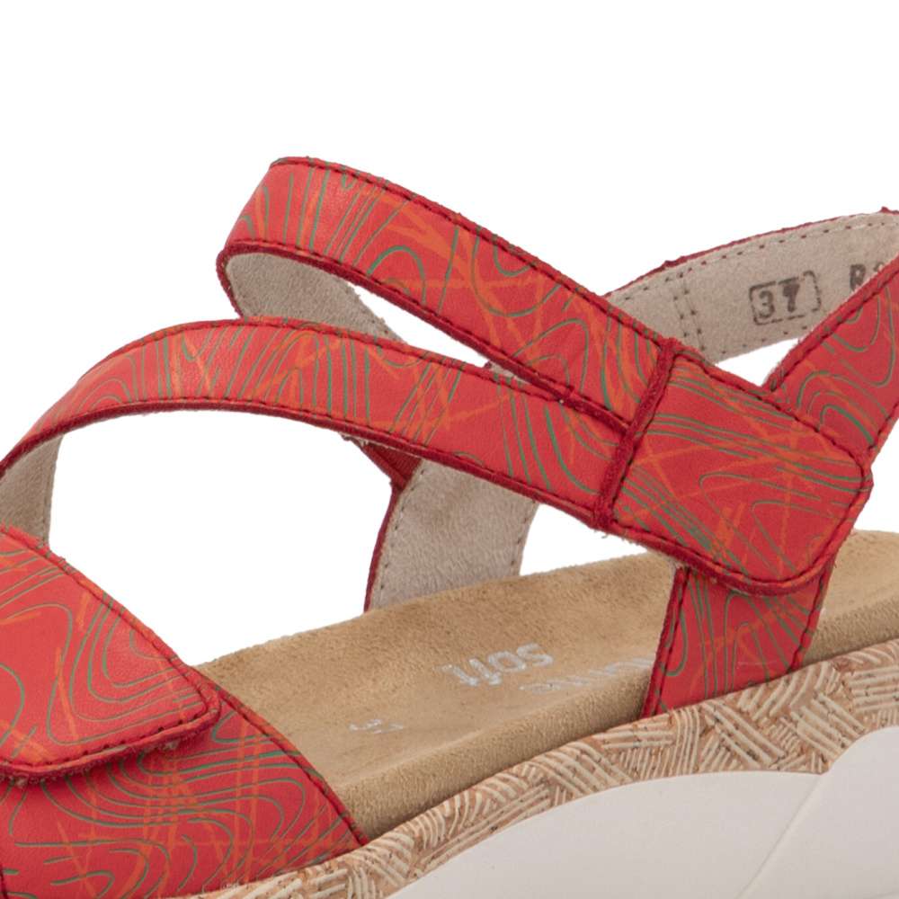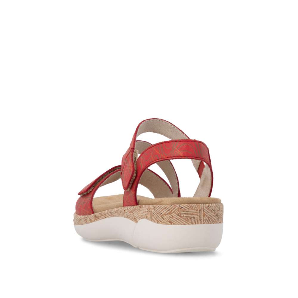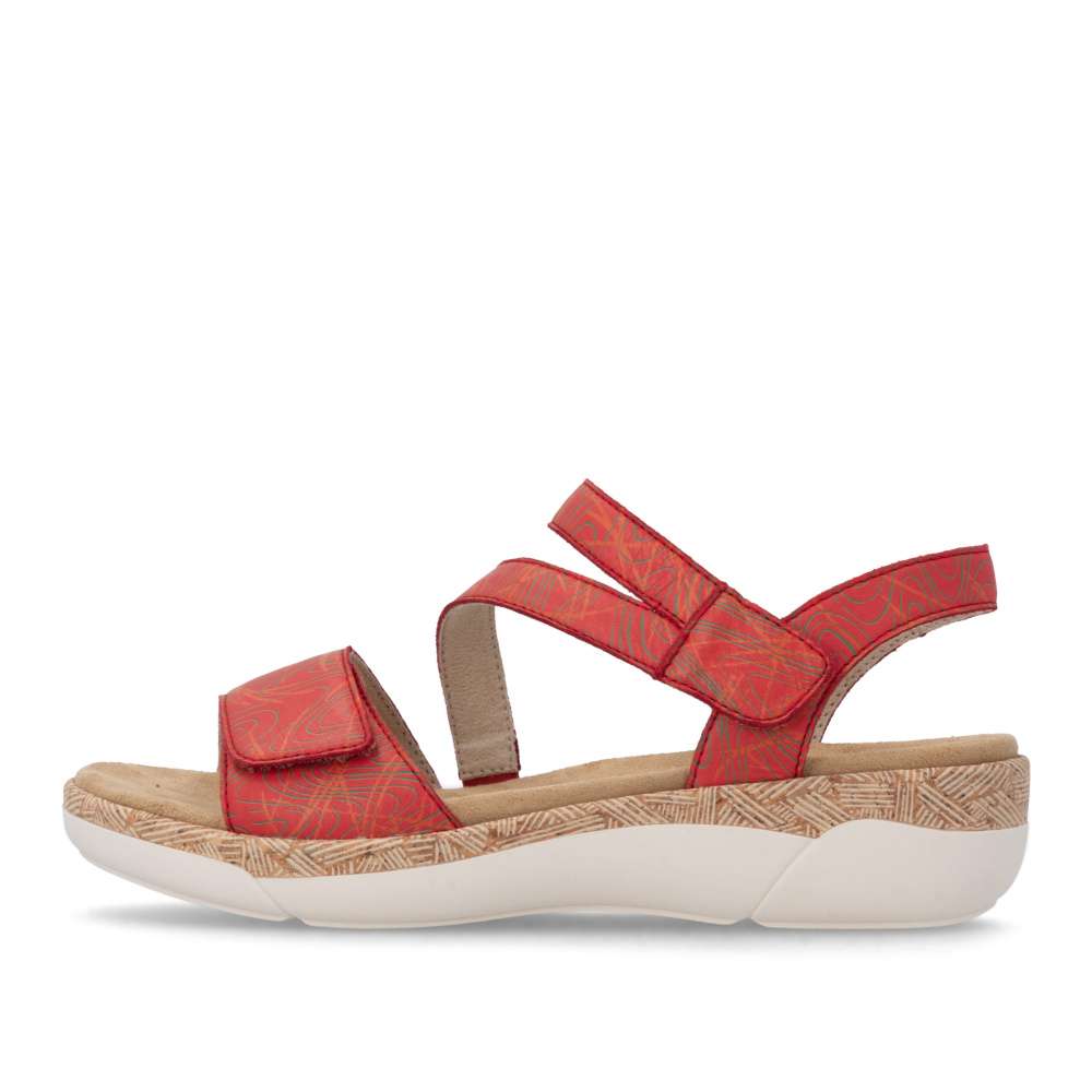 Obuv REMONTE představuje prémiovou řadu značky RIEKER, která se vyznačuje vysokou kvalitou použitých materiálů a precizním zpracováním. Tyto sandály vynikají unikátním designem pásků v působivé červené barvě dekorované liniemi vzoru, který kombinuje moderní vzhled s maximálním komfortem. Zapínání pomocí suchých zipů na řemíncích u nártu a v oblasti prstů umožňuje snadné obouvání a zároveň dokonalé přizpůsobení boty tvaru nohy. Vyjímatelná stélka zajišťuje celodenní komfort a příjemný došlap, zatímco podešev v precizním zpracování dodává sandálům trendy charakter, který podtrhuje jejich jedinečný styl. Tyto sandály jsou ideální pro teplé dny, kdy chcete být stylová a zároveň se cítit pohodlně při procházkách městem, na volnočasových aktivitách nebo letních výletech.