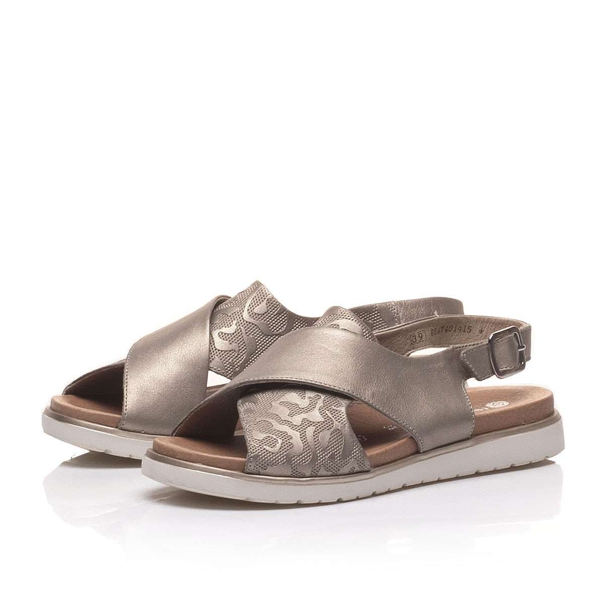 Dámské sandále v bronzové barvě s překříženými pásky přes nárt, jeden hladký a druhý vzorovaný. Ty jim dodávají elegantní a zajímavý vzhled. Pro nazouvání slouží pásek kolem kotníku se zapínám na suchý zip. Obuv se skvěle hodí do všedních letních dní jak k džínům, tak k šatům.