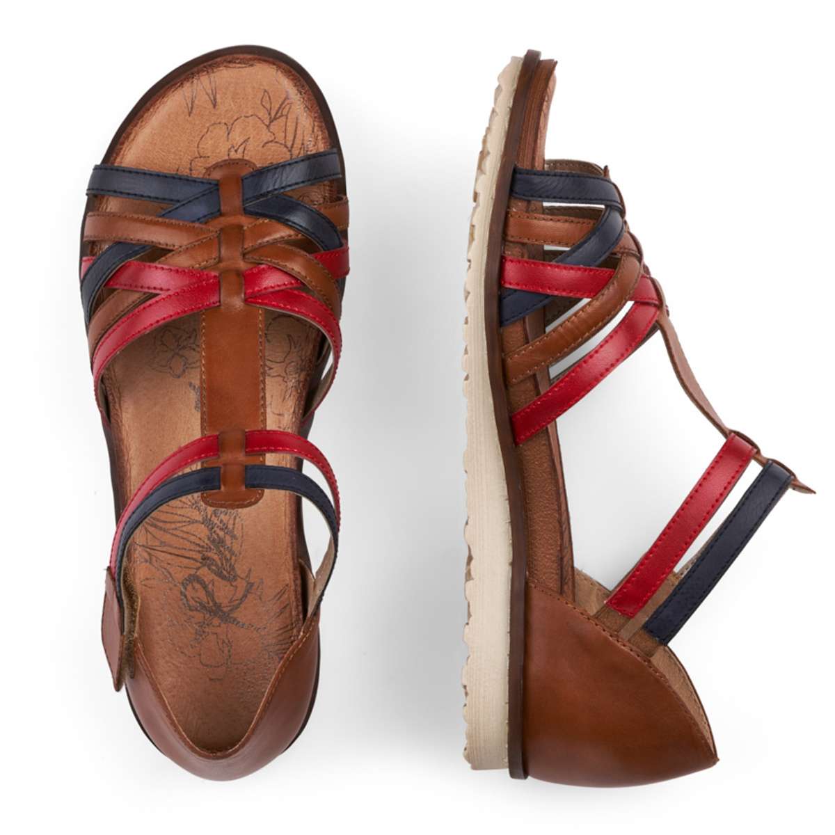 Dámské sandály mají kulatou špičku a hladký povrch. Zdobené jsou střídáním barev a křížením předních pásků. Na vnější straně je suchý zip pro snadnou úpravu boty přímo k Vaší noze. S tímto modelem se budete cítit příjemně a elegantně v každé situaci.