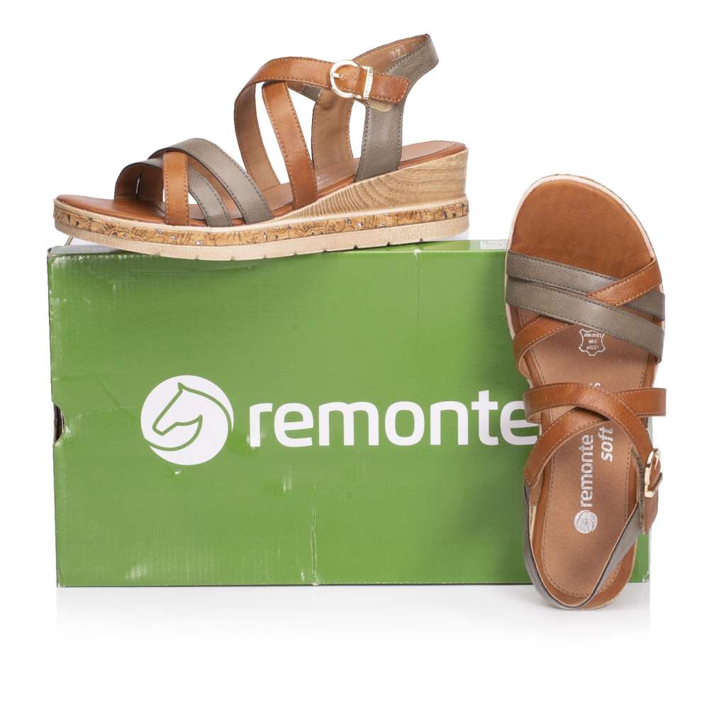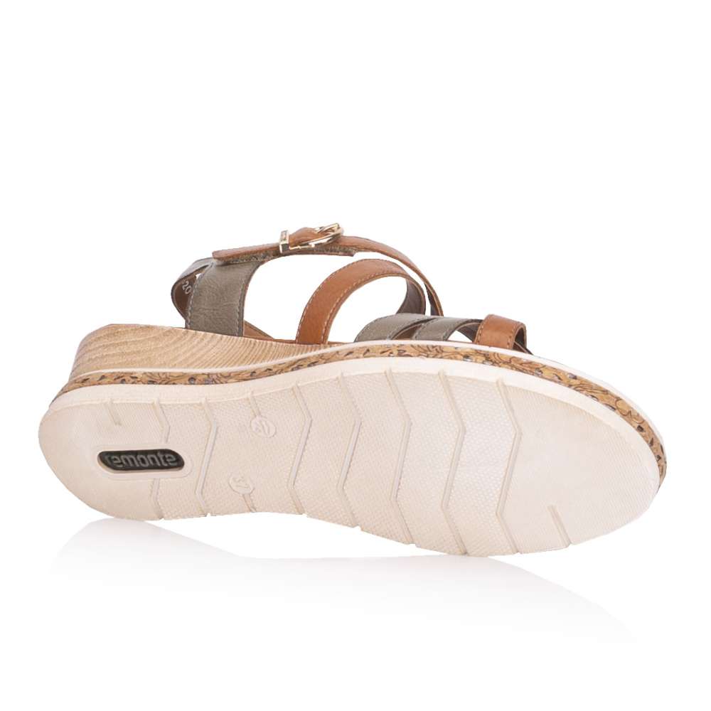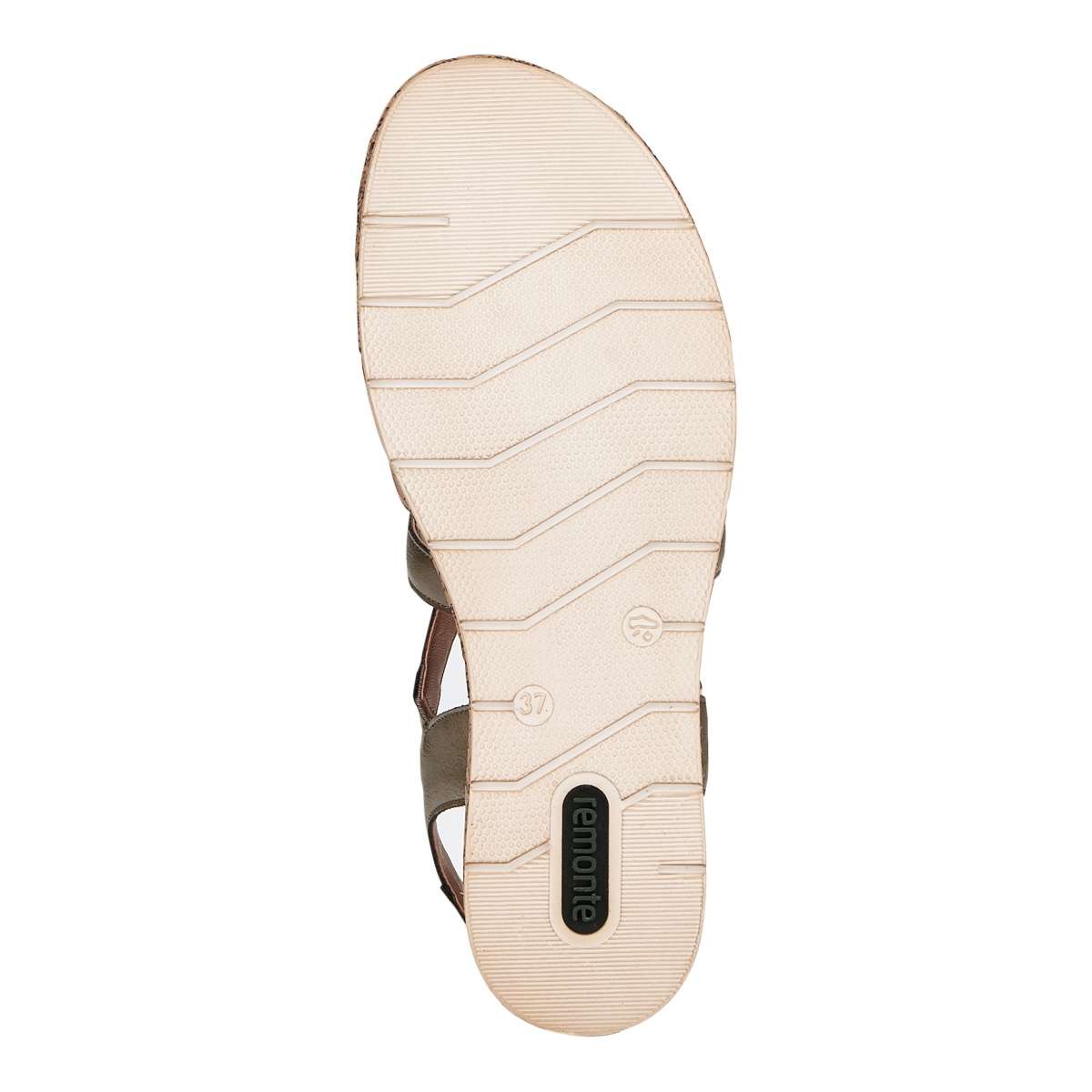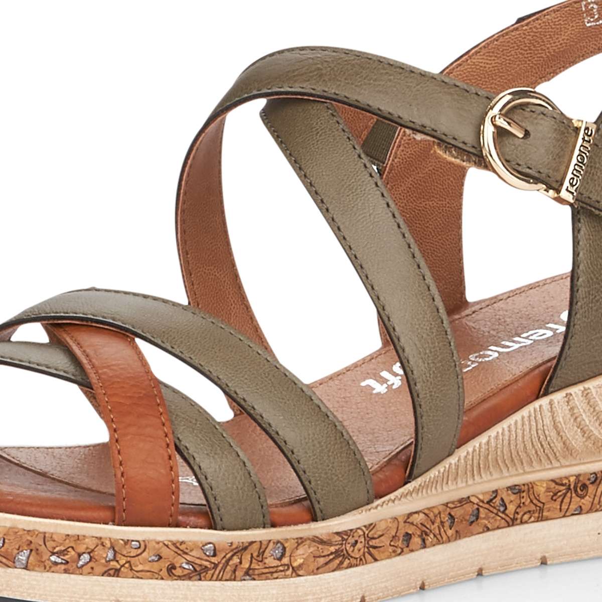 Dámské letní sandálky značky REMONTE (vyšší řada značky Rieker) Vás na první pohled zaujmou svým propletením nártových pásků a ozdobným korkem v podešvi.