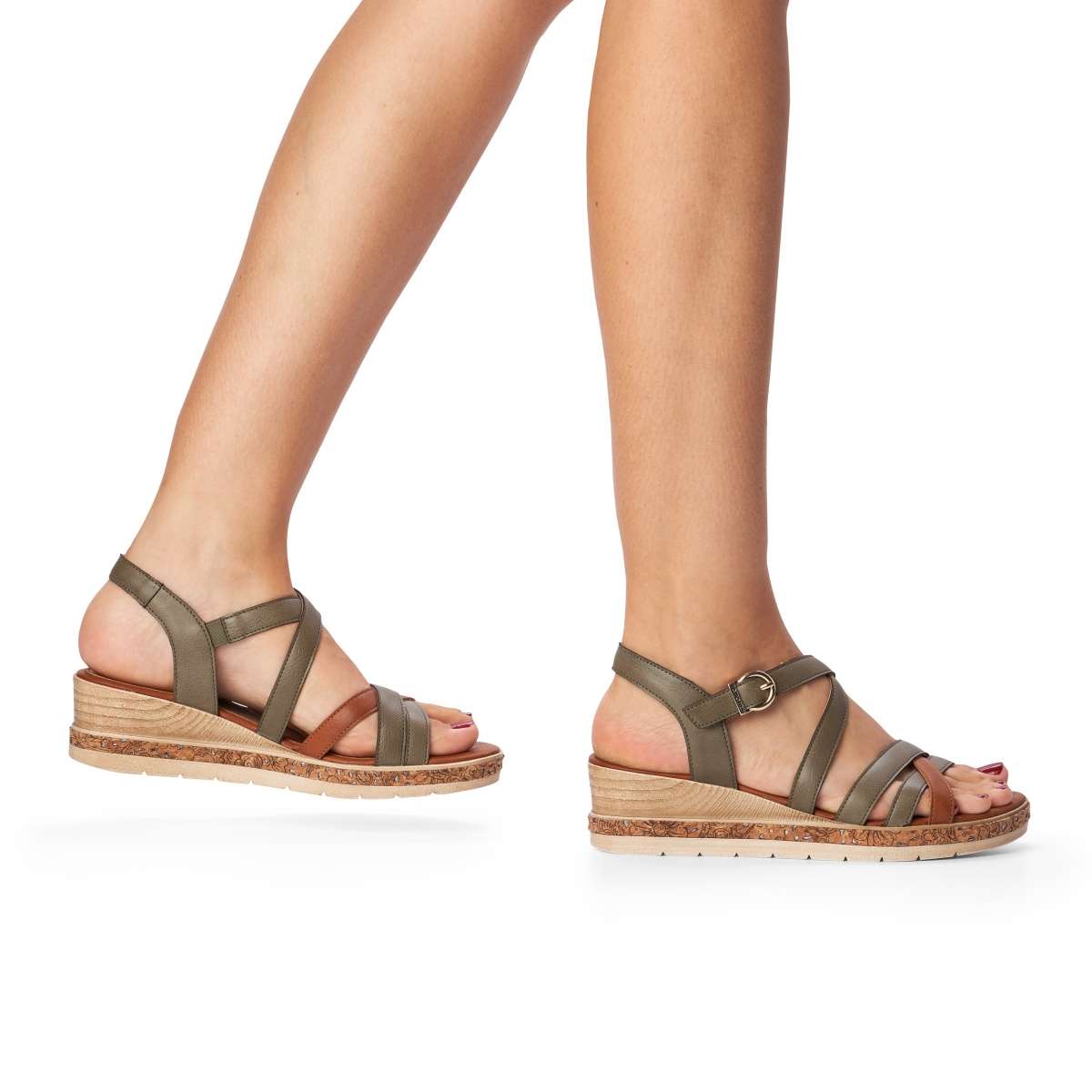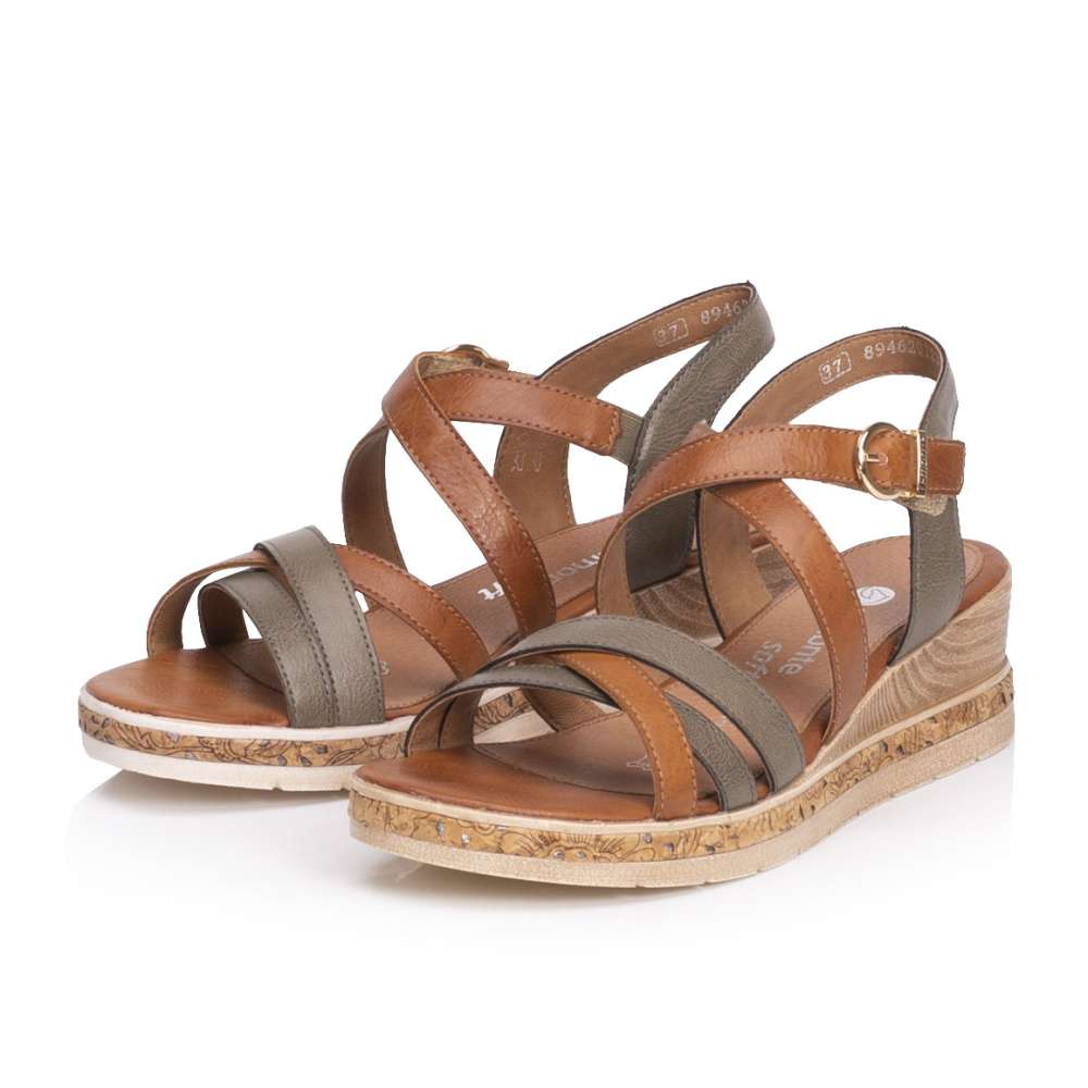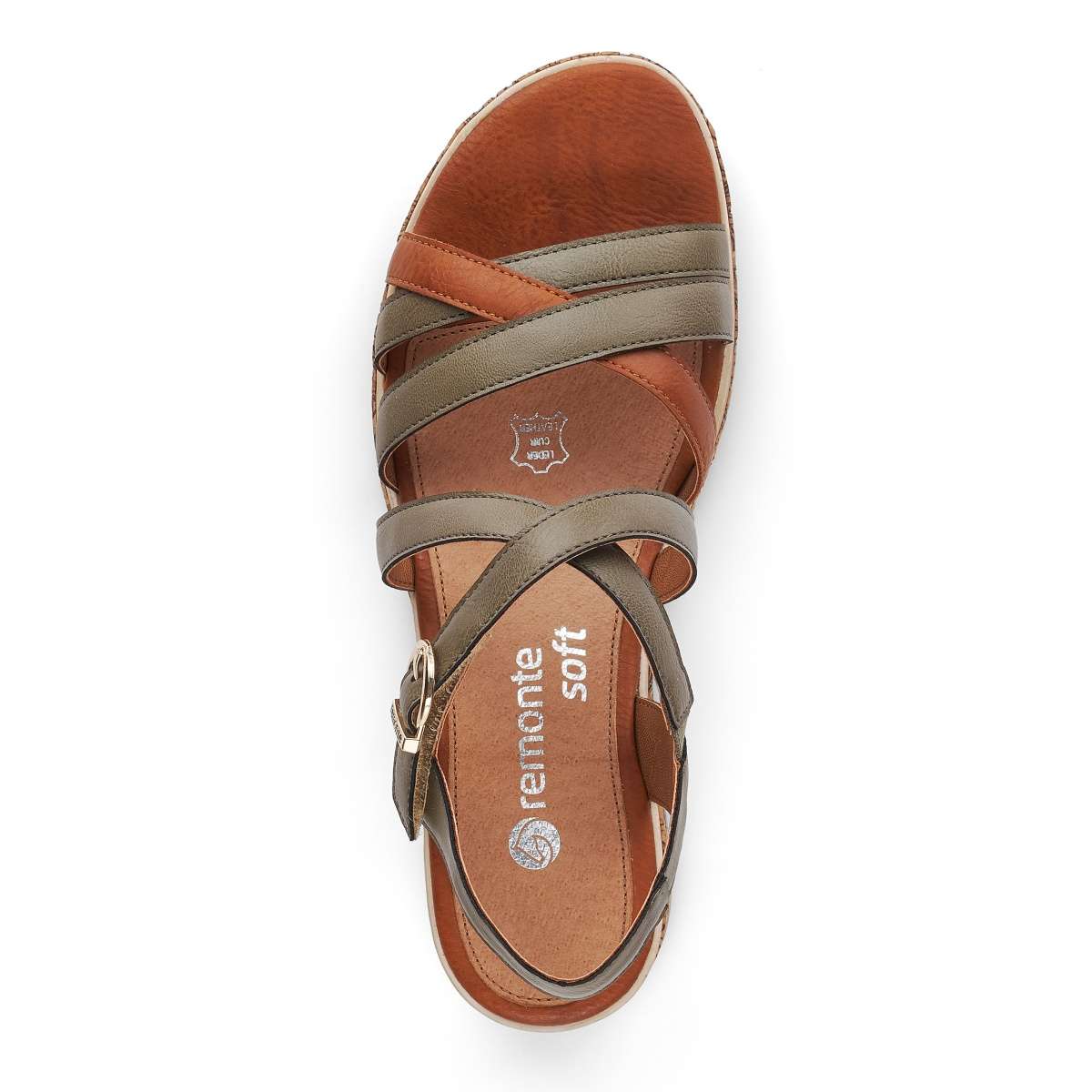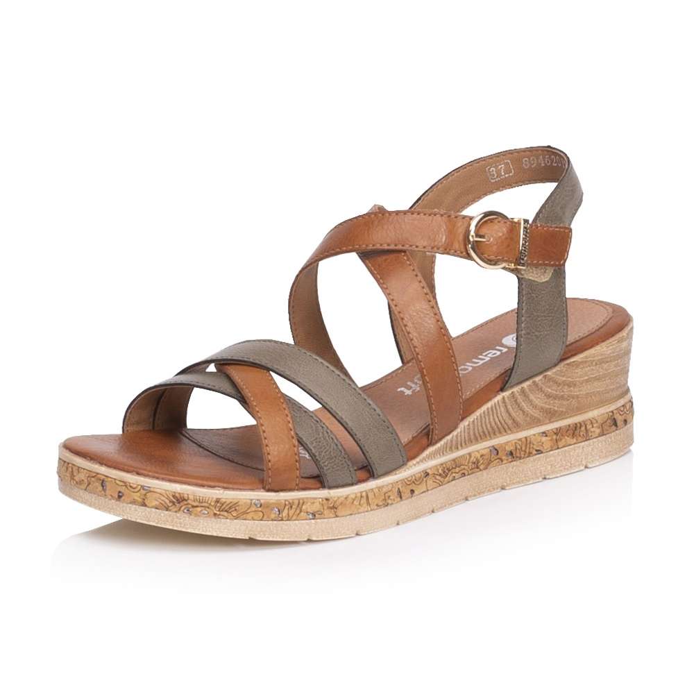 Dámské letní sandálky značky REMONTE (vyšší řada značky Rieker) Vás na první pohled zaujmou svým propletením nártových pásků a ozdobným korkem v podešvi.