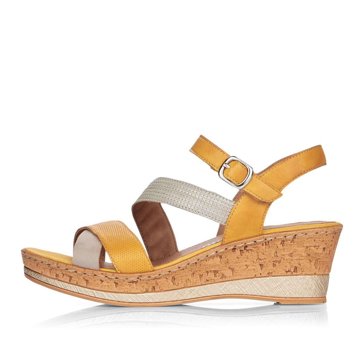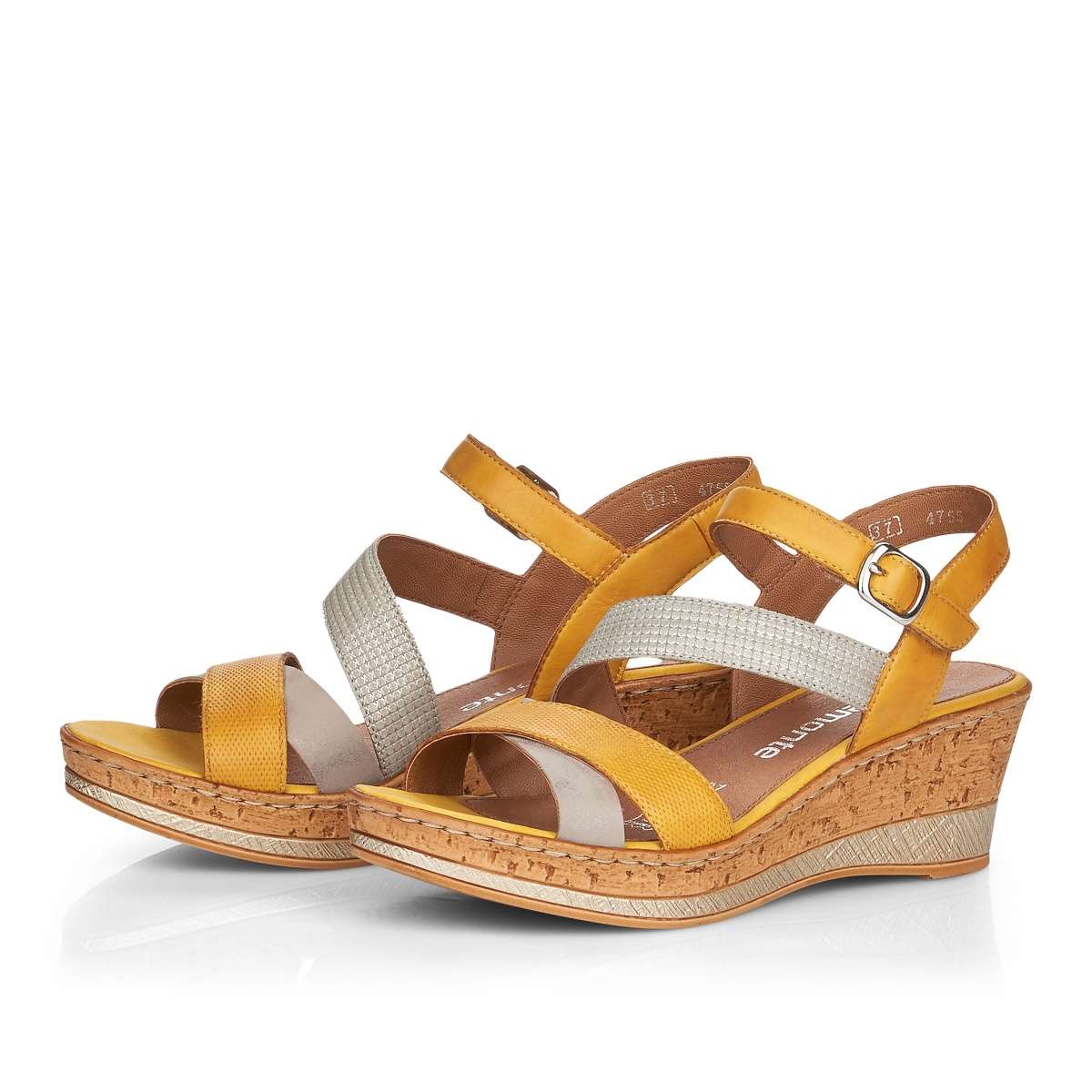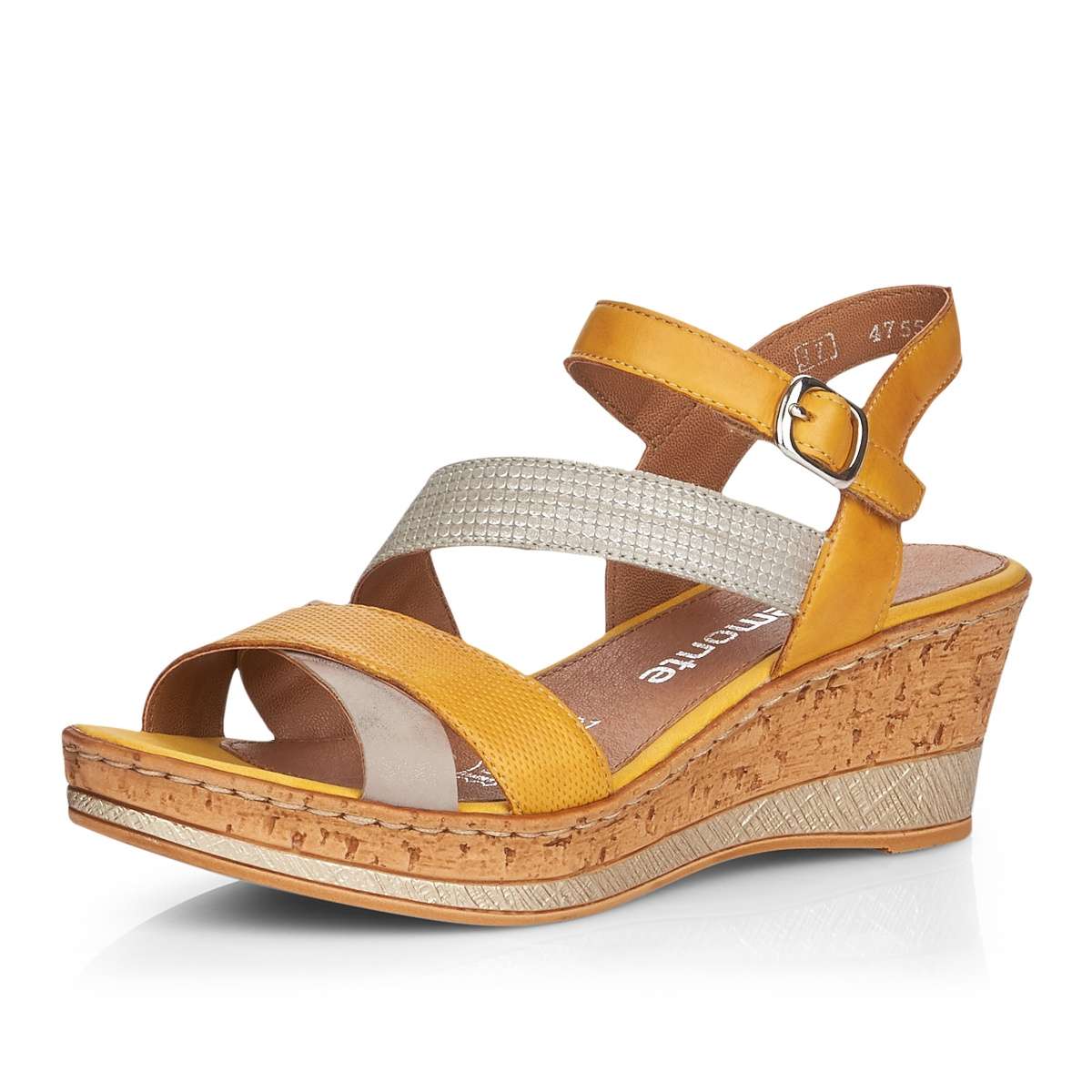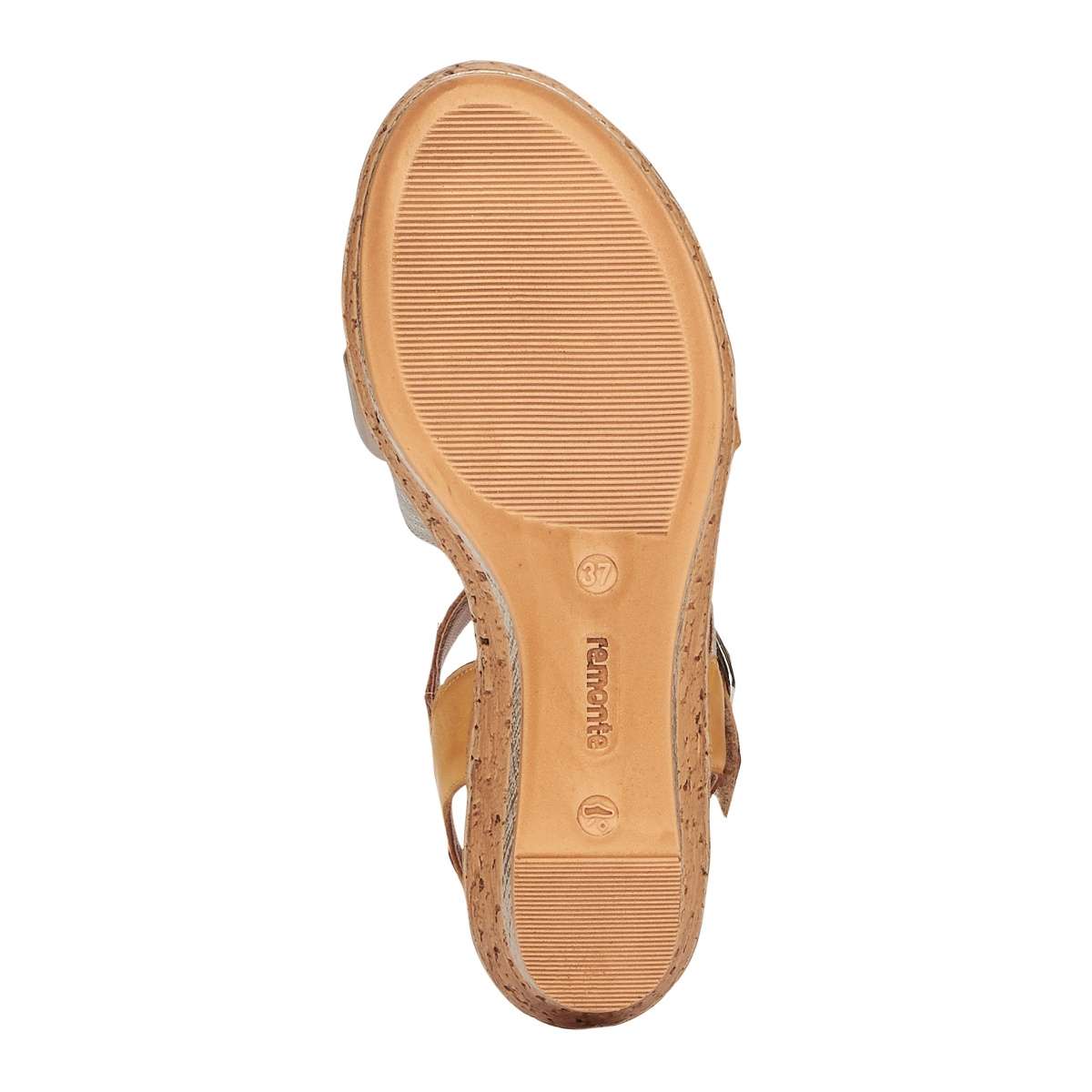 Dámské letní sandálky značky REMONTE (vyšší řada značky Rieker) jsou jedinečným modelem díky propleteným páskům s kombinací barev v nártové části a také imitací korku v podešvi.