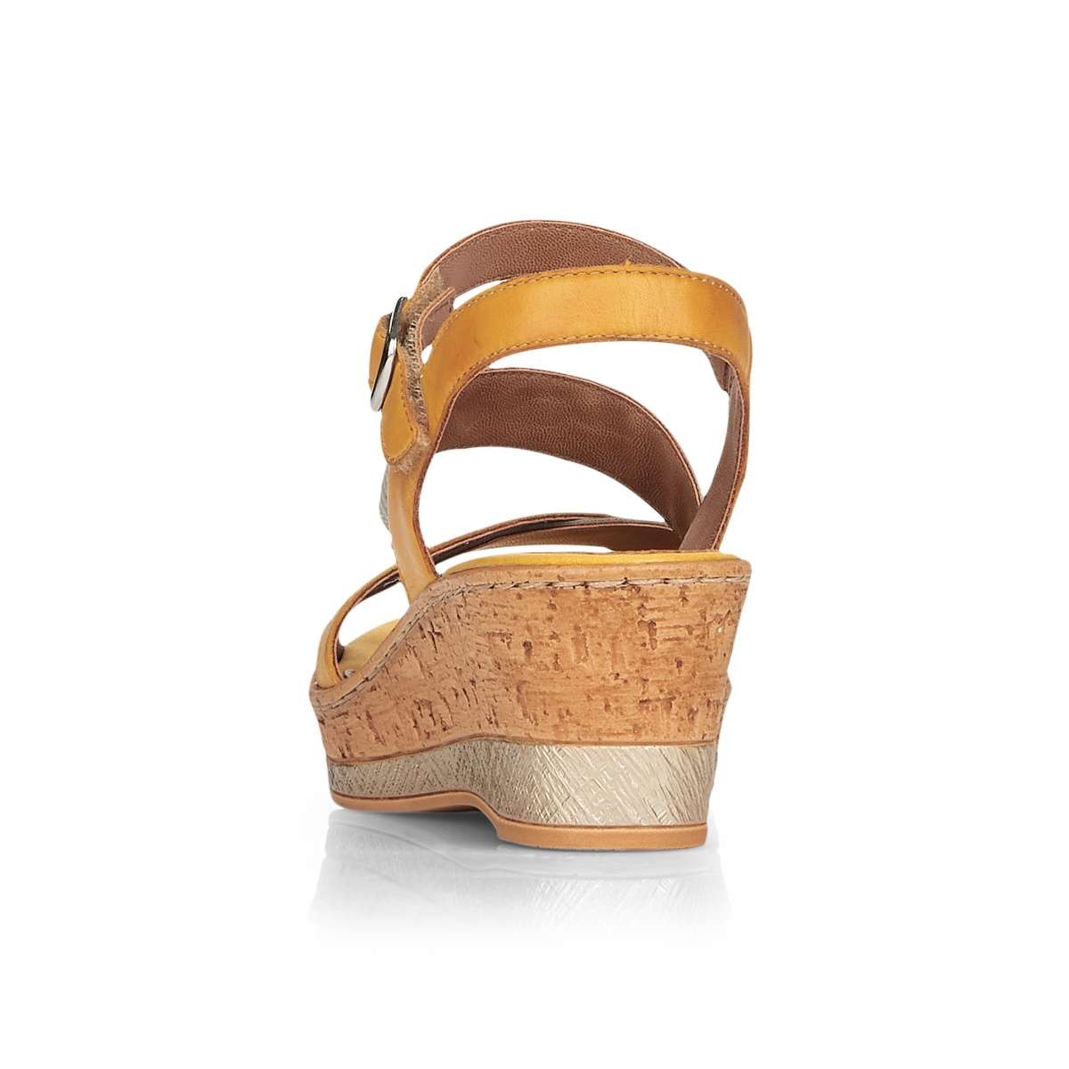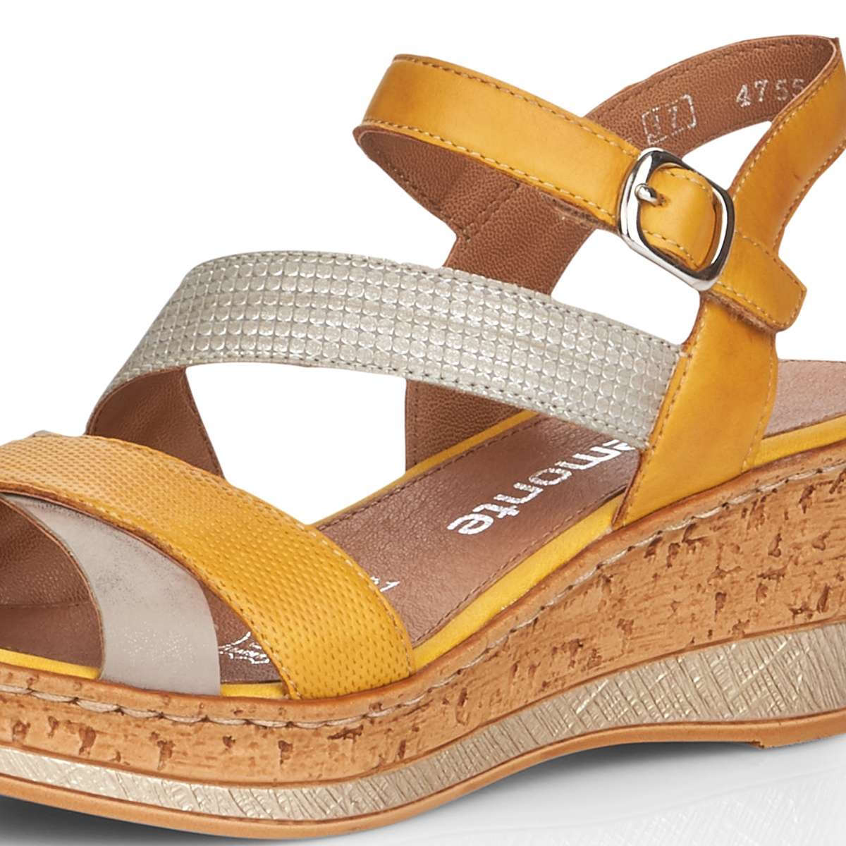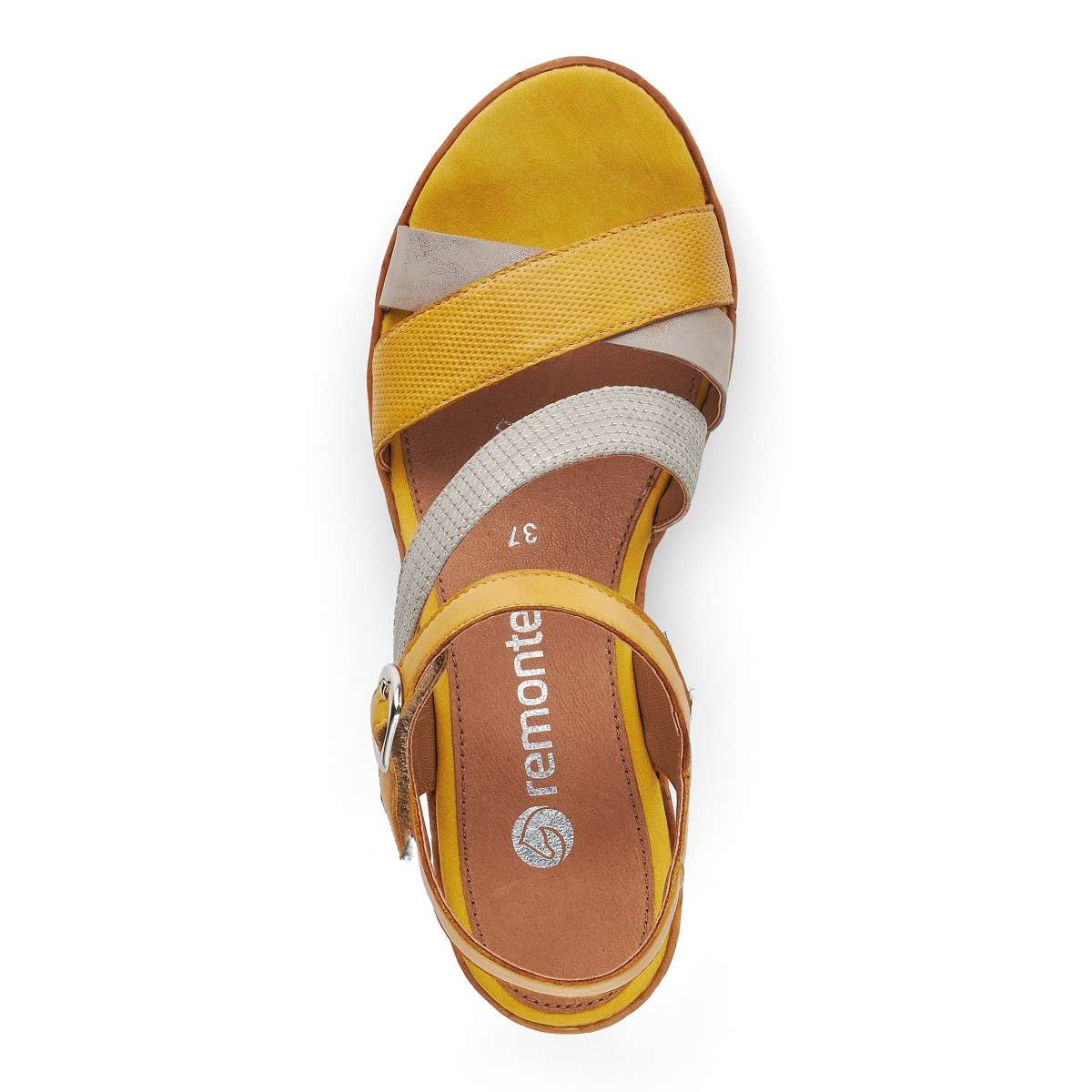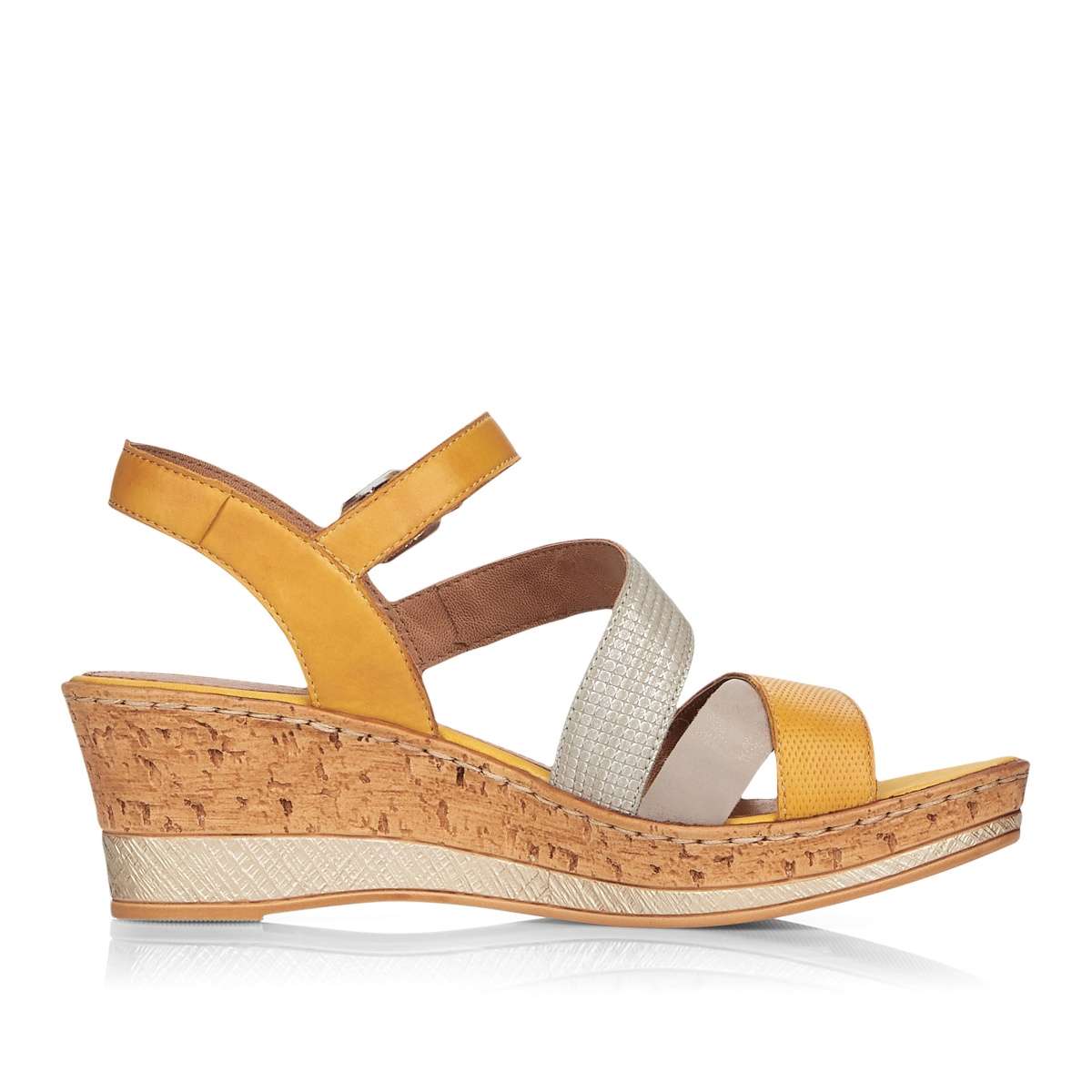 Dámské letní sandálky značky REMONTE (vyšší řada značky Rieker) jsou jedinečným modelem díky propleteným páskům s kombinací barev v nártové části a také imitací korku v podešvi.