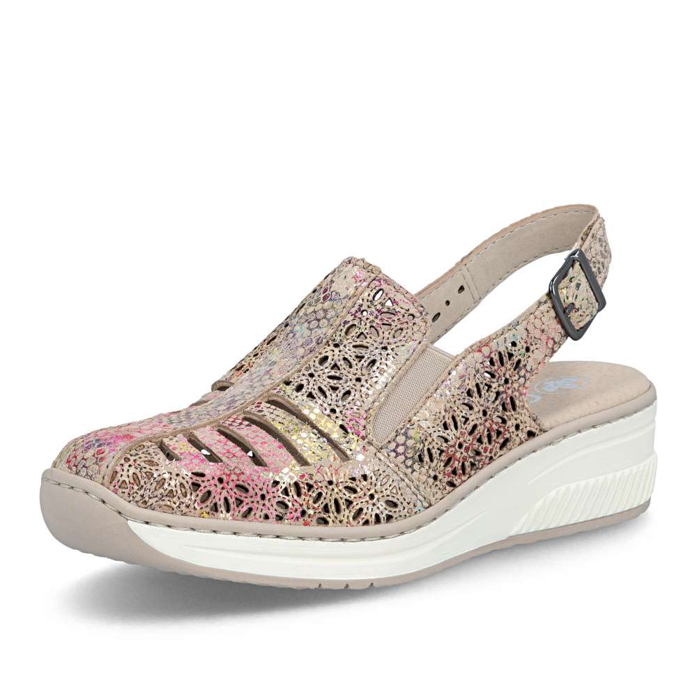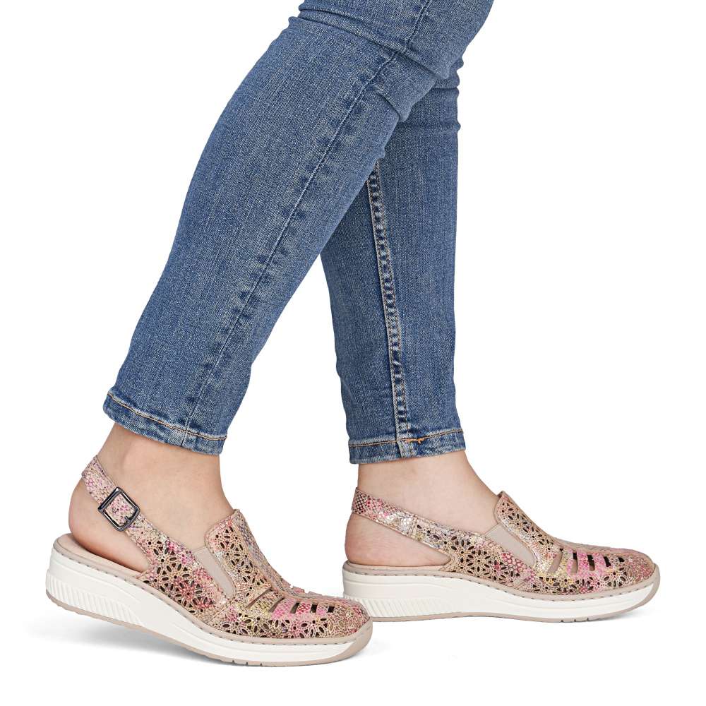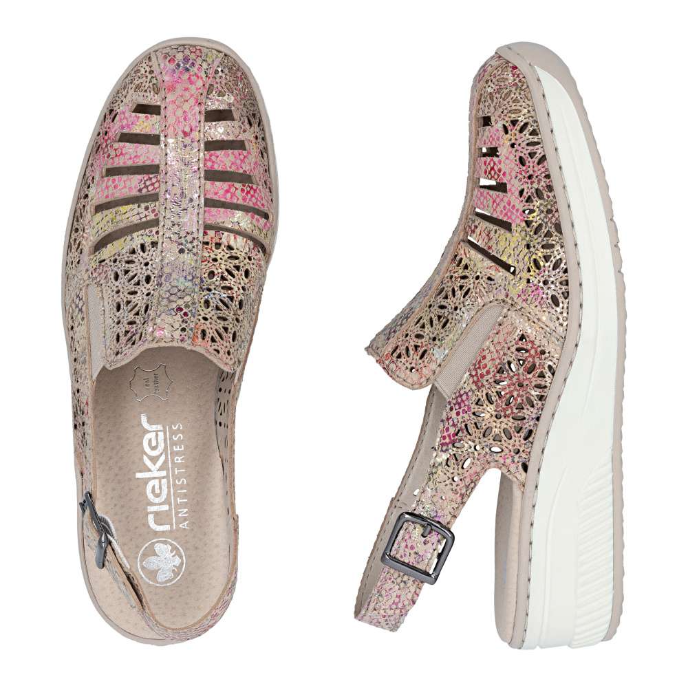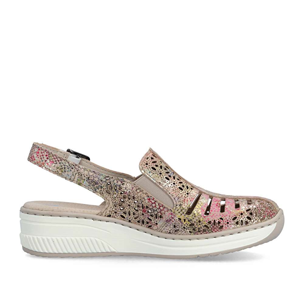 Tyto kožené sandály RIEKER jsou ztělesněním letní elegance a bezkonkurenčního pohodlí. Svršek zdobí vzor perforace a barevný potisk, které dohromady vytvářejí efektní vizuální vzhled. O perfektní přizpůsobení boty tvaru chodidla se starají pružné gumičky na nártu a zadní pásek s nastavitelnou sponou, které zaručují stabilitu a pohodlí při každém kroku. Měkká kožená stélka obklopí chodidlo luxusním komfortem, zatímco vyšší podešev s tlumením nárazů podporuje přirozený pohyb. Tyto sandály jsou ideální volbou pro ženy, které chtějí spojit moderní a stylový vzhled s maximálním komfortem. Každý krok v nich působí lehce, elegantně a sebevědomě, přičemž vaše nohy si zároveň užívají pocitu dokonalého pohodlí.