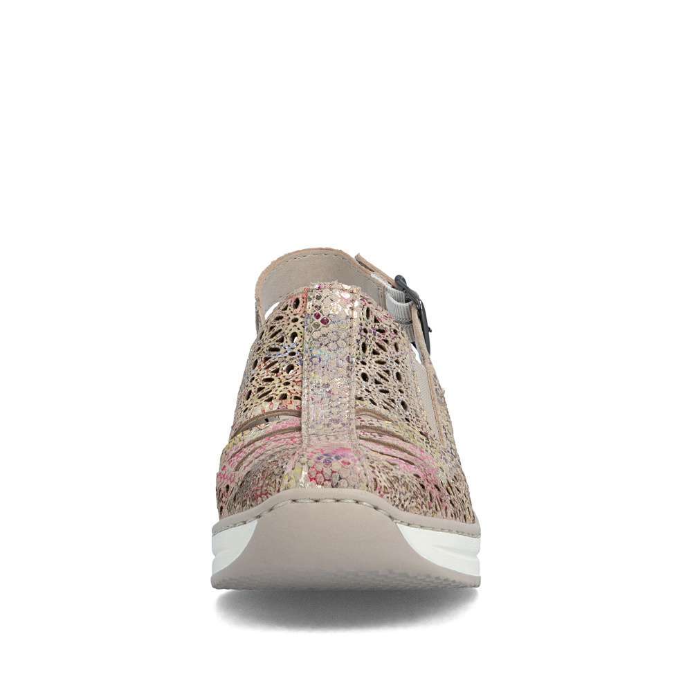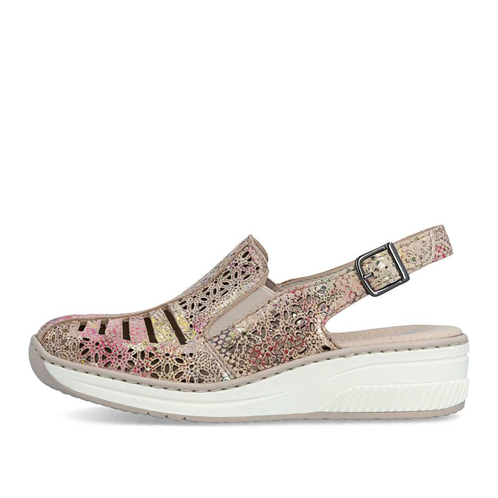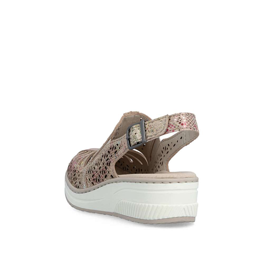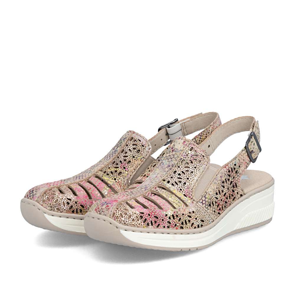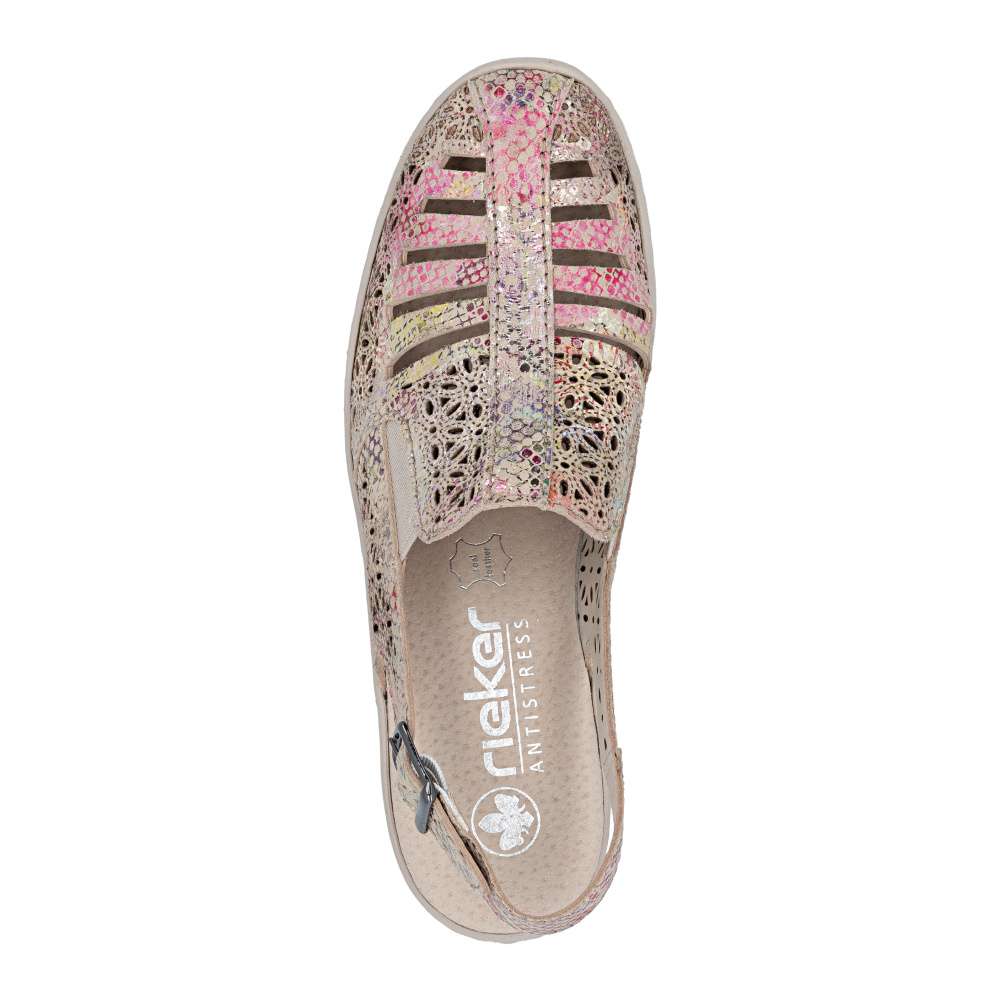 Tyto kožené sandály RIEKER jsou ztělesněním letní elegance a bezkonkurenčního pohodlí. Svršek zdobí vzor perforace a barevný potisk, které dohromady vytvářejí efektní vizuální vzhled. O perfektní přizpůsobení boty tvaru chodidla se starají pružné gumičky na nártu a zadní pásek s nastavitelnou sponou, které zaručují stabilitu a pohodlí při každém kroku. Měkká kožená stélka obklopí chodidlo luxusním komfortem, zatímco vyšší podešev s tlumením nárazů podporuje přirozený pohyb. Tyto sandály jsou ideální volbou pro ženy, které chtějí spojit moderní a stylový vzhled s maximálním komfortem. Každý krok v nich působí lehce, elegantně a sebevědomě, přičemž vaše nohy si zároveň užívají pocitu dokonalého pohodlí.