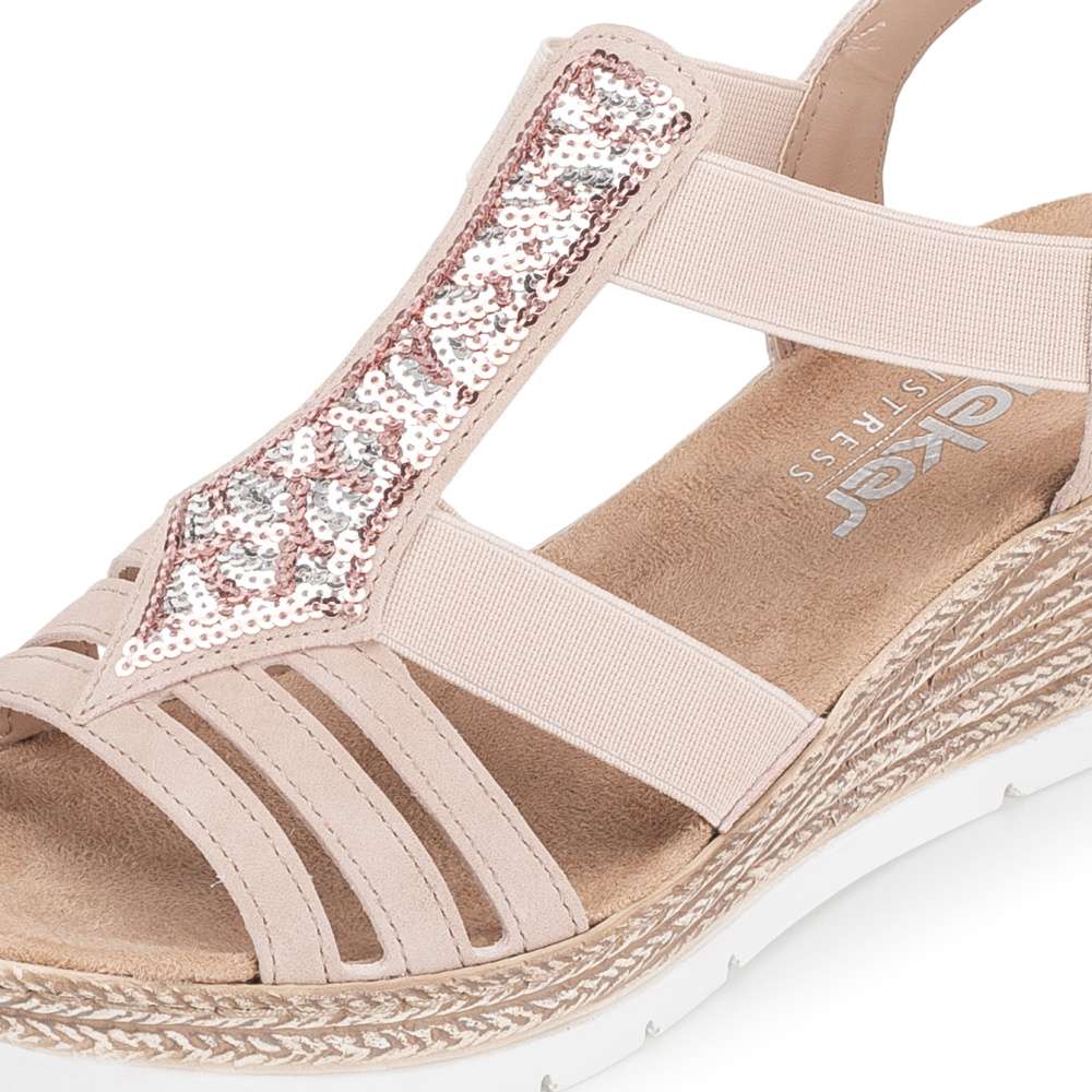 Sandály značky RIEKER dokonale doplní váš letní outfit a zaujmou originálním, nepřehlédnutelným vzhledem. Výrazné odlesky zdobeného nártového pásku vytvářejí jedinečný design, který působí žensky a elegantně. Svršek tvoří harmonická kombinace pevných a pružných řemínků, které zajistí snadné obouvání a dokonale se přizpůsobí tvaru vaší nohy. Klínový podpatek jemně zvýrazní vaši siluetu a dodá vám sebevědomí při každém kroku. Podešev zároveň tlumí nárazy při došlapu a poskytuje příjemné pohodlí během celého dne. Tento stylový model využijete na procházky městem, do práce i na letní setkání - skvěle se hodí ke kalhotám i k sukni a stane se vaším oblíbeným společníkem během celé sezóny.