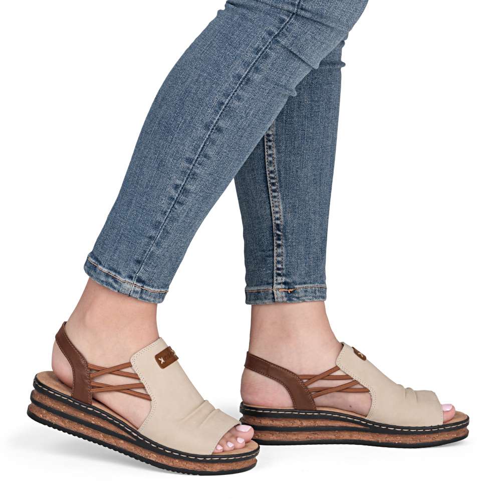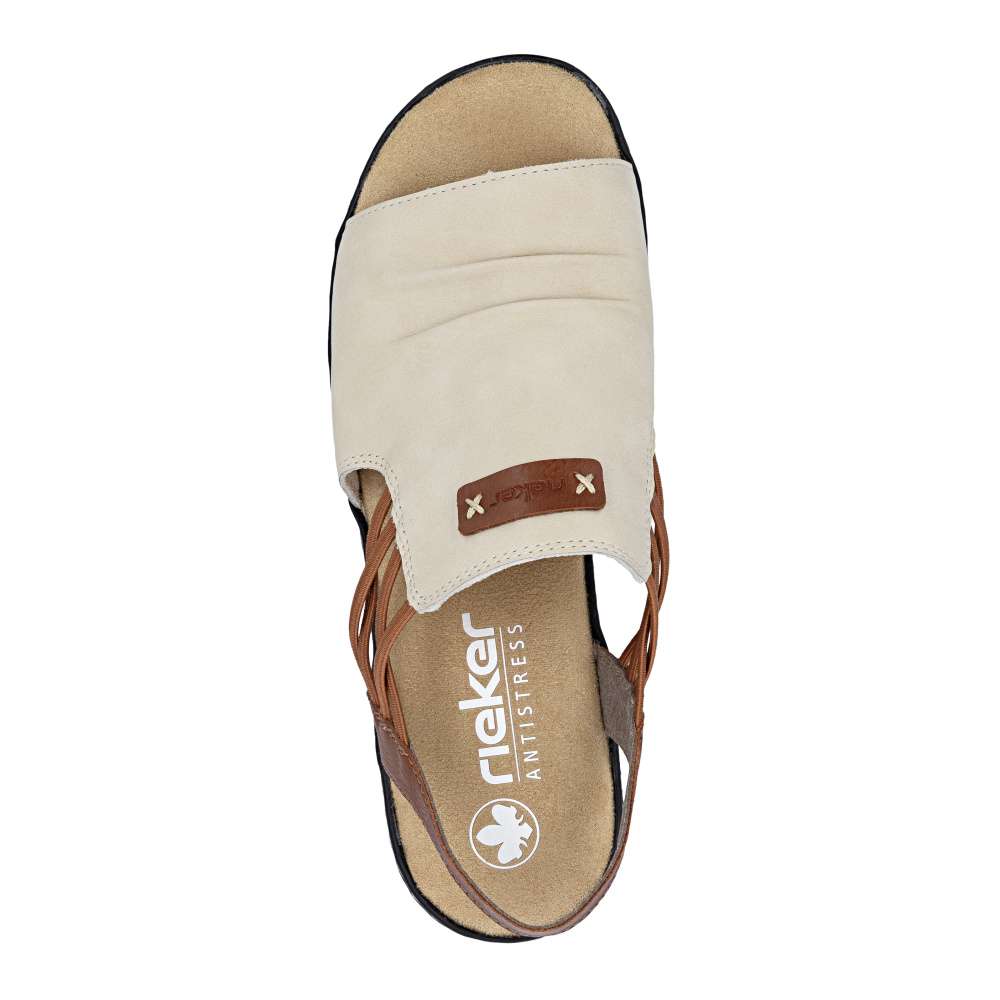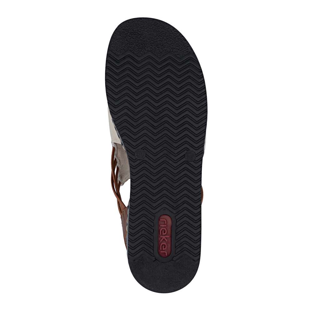 Dámské sandály značky RIEKER se širokým nártovým páskem jsou ideální volbou pro ženy, které upřednostňují čistý design spojený s maximálním pohodlím. Elegantní řasení na nártu spolu s našitým logem značky dodává sandálům vkusný detail. Pružné gumičky po stranách přirozeně spojují přední a zadní část obuvi a zajišťují snadné obouvání i perfektní přizpůsobení chodidlu. Vyšší podešev efektivně tlumí nárazy při chůzi a přispívá ke stabilnímu kroku, zatímco příjemná textilní stélka se postará o komfort i během celodenního nošení. Tento model je ideálním společníkem pro letní dny – ať už do města, do práce nebo pro volný čas – a nabízí typický komfort a nenucenou eleganci značky RIEKER.