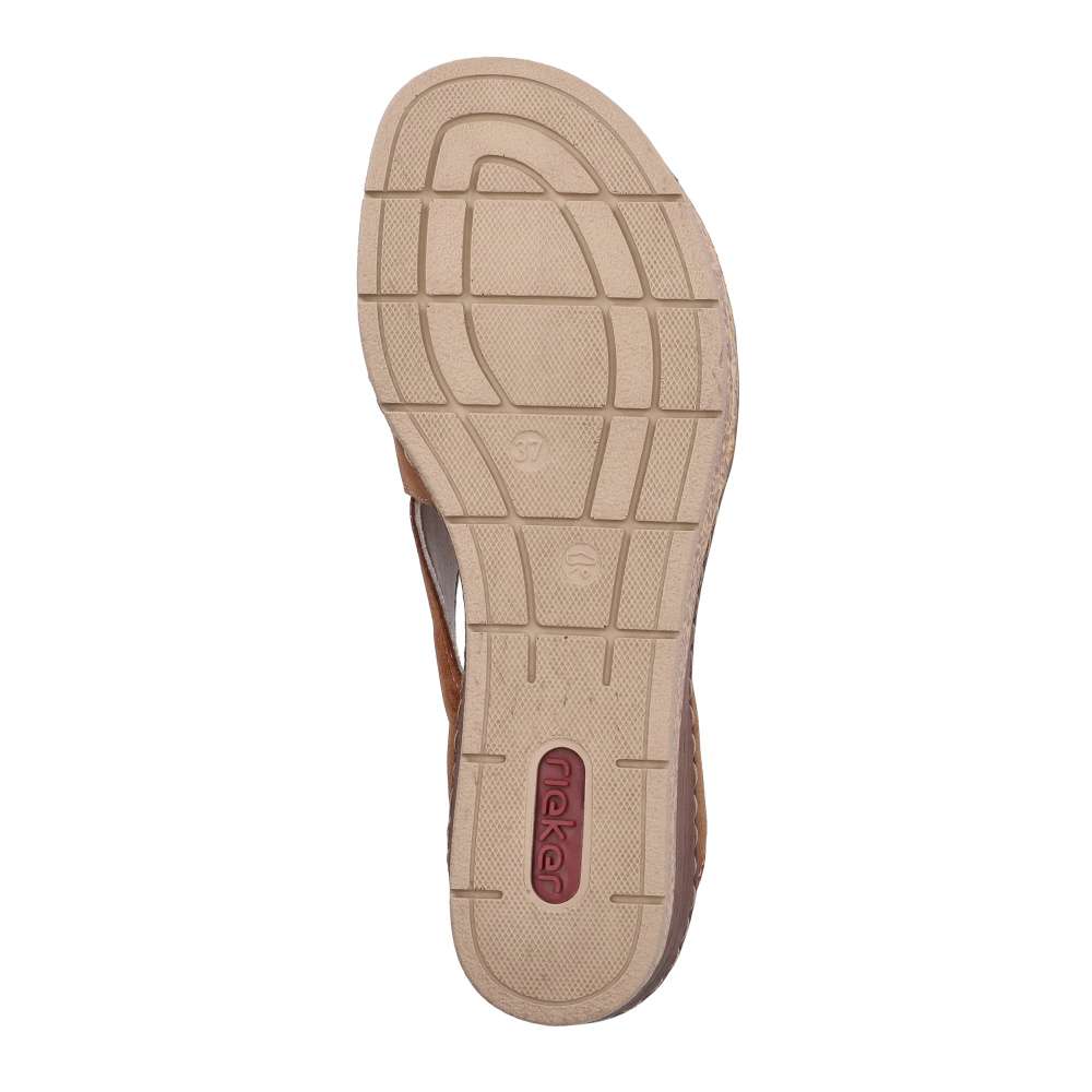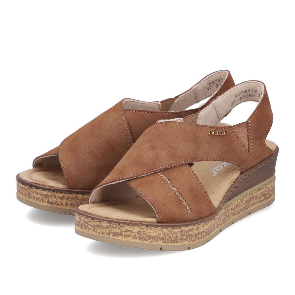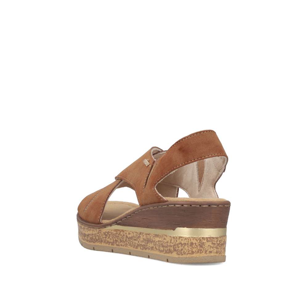 Sandály RIEKER v hnědém odstínu budou výrazným prvkem každého letního outfitu. Jejich design zaujme efektně přeloženými širokými pásky v přední části, které působí moderně a minimalistické logo dodává punc originality. Po stranách kotníku jsou vsazeny pružné gumičky, které usnadňují obouvání a zároveň se přizpůsobí tvaru nohy pro maximální pohodlí. Příjemná textilní stélka zajistí komfort během nošení. Vysoký klínový podpatek opticky prodlouží postavu, dodá vám sebevědomí a zároveň poskytne stabilnější oporu než klasický podpatek. Tyto sandály jsou ideální volbou pro ženy, které chtějí zaujmout, cítit se pohodlně a dodat svému stylu výrazný módní akcent.