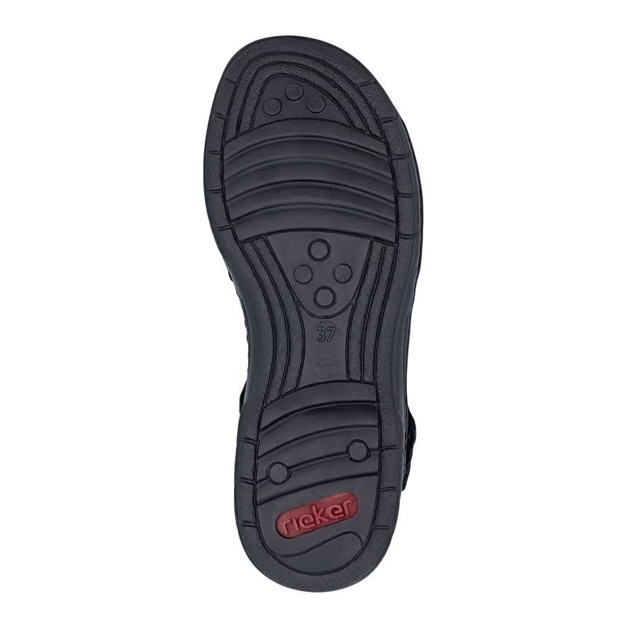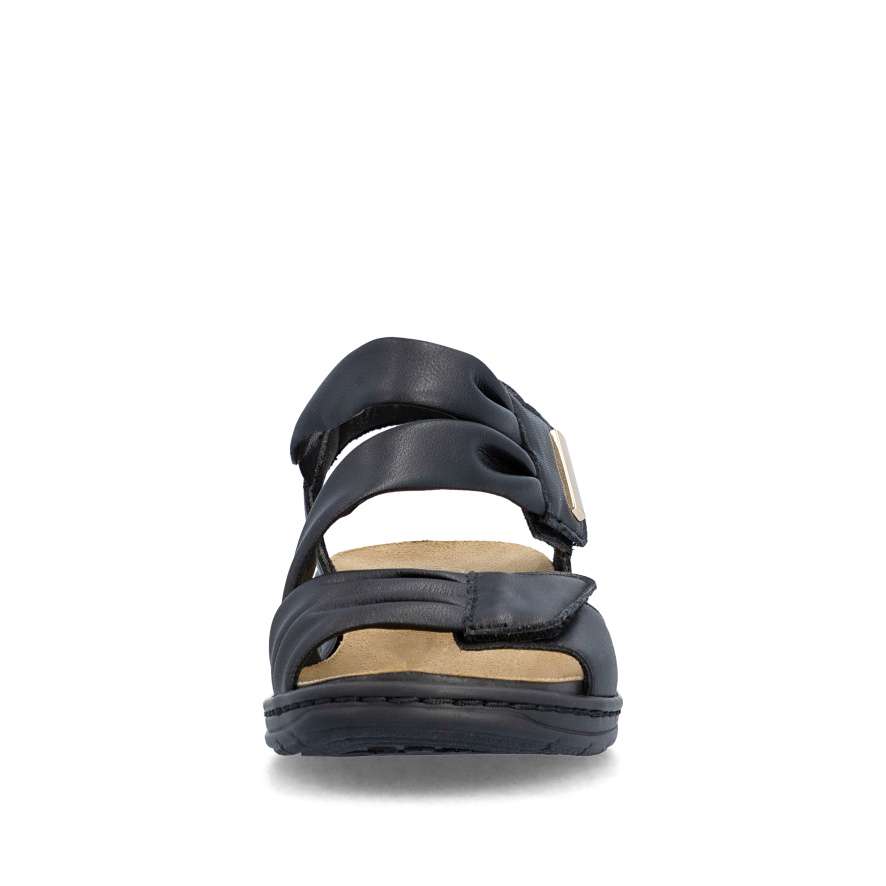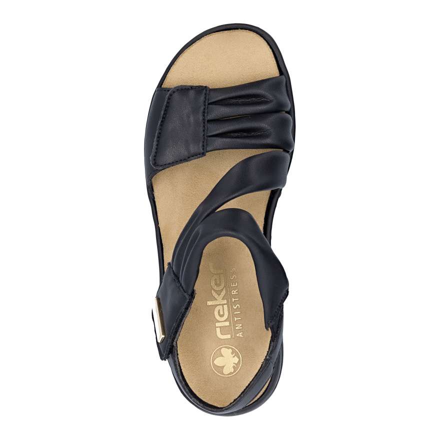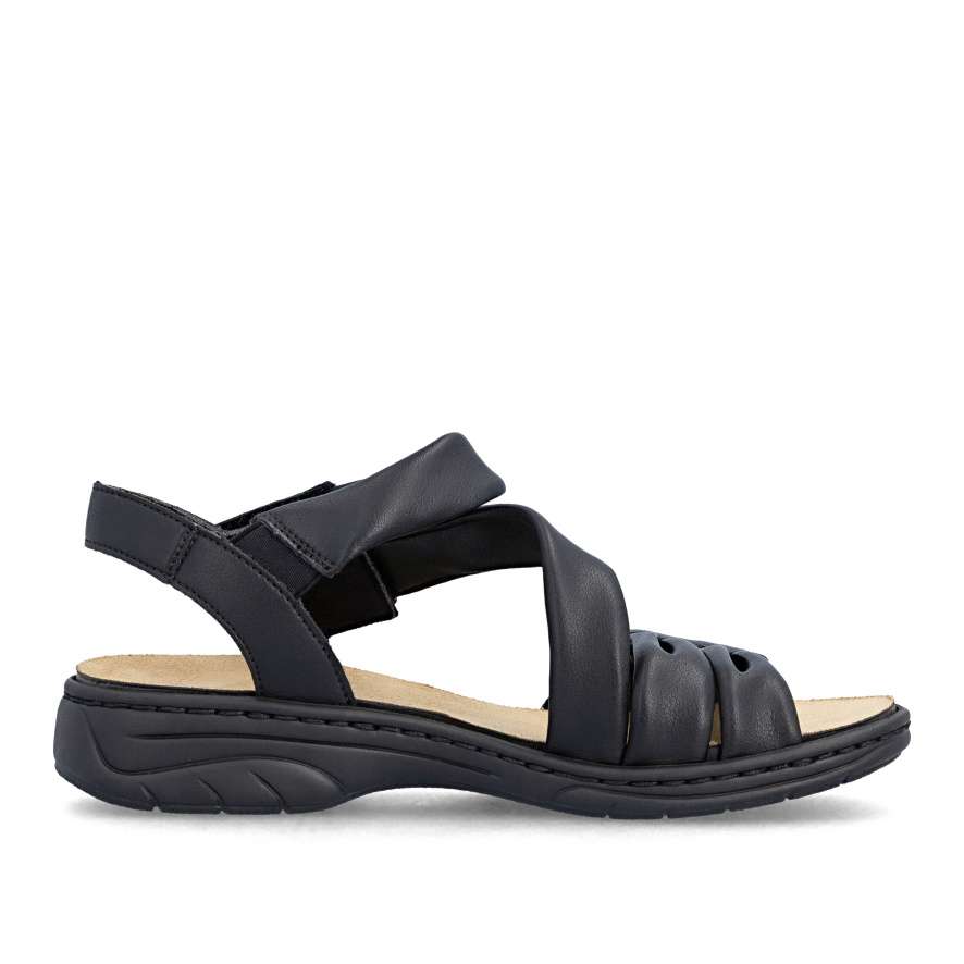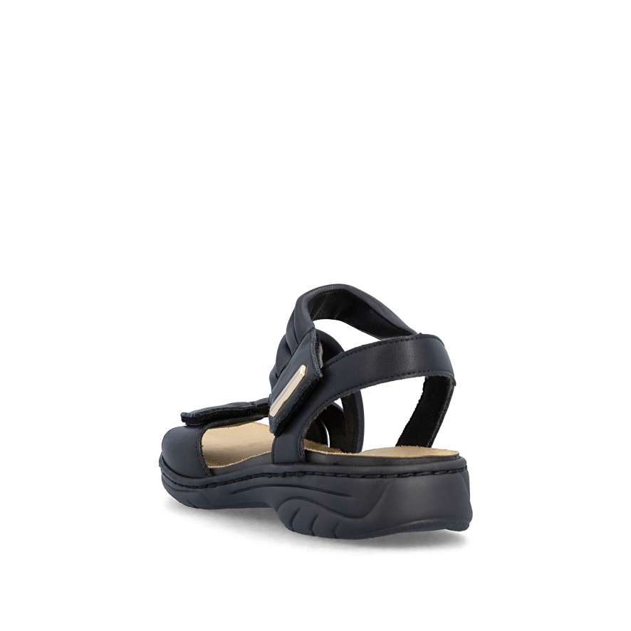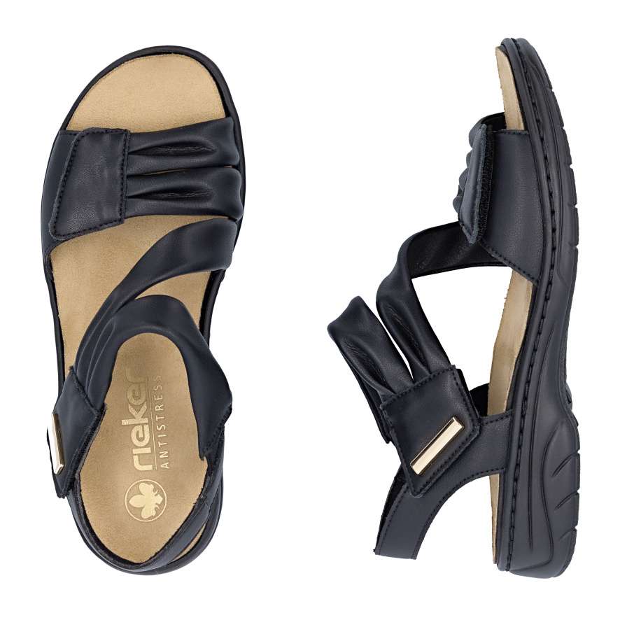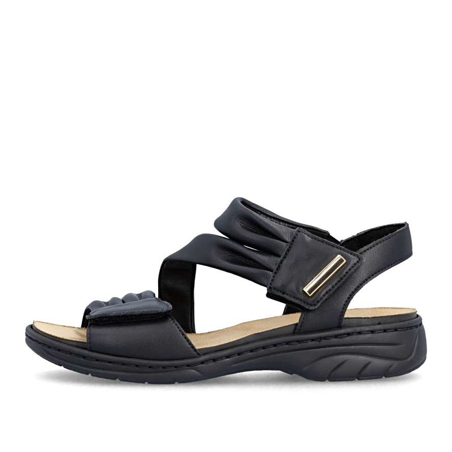 Tyto kožené sandály RIEKER v elegantním černém odstínu jsou dokonalým ztělesněním ženského stylu a pohodlí. Půvabně vrstvené pásky svršku vytvářejí jemně rafinovaný vzhled a zlatá aplikace u kotníku krásně zvýrazní váš letní outfit. Pásky se suchým zipem umožňují rychlé obutí a zároveň se přizpůsobí tvaru nohy pro maximální komfort. Příjemná stélka se postará o příjemný pocit při každém kroku a flexibilní podešev s technologií tlumení nárazů zajistí pohodlnou chůzi po celý den. Tyto sandály budou ideální volba pro letní dny, kdy chcete vypadat stylově a zároveň se cítit dokonale pohodlně.