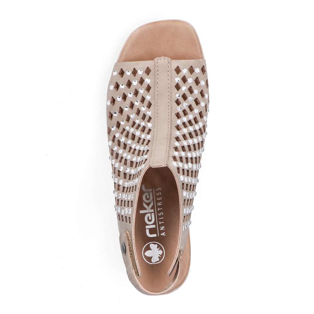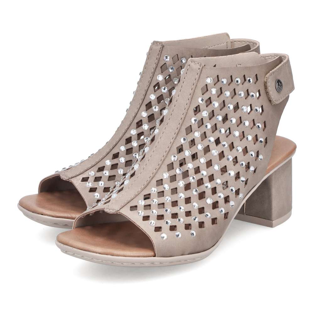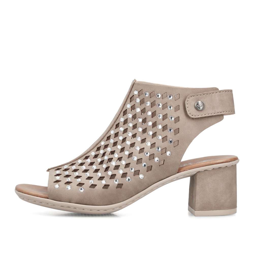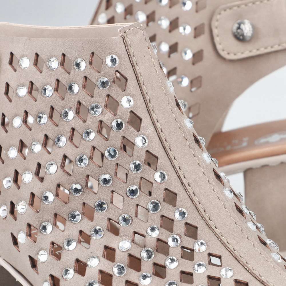 Béžové sandály RIEKER okouzlí jemnou povrchovou perforací a působivými lesklými aplikacemi rozesetými po celém svršku, které modelu dodávají jedinečnost. Elegantní kombinace detailů vytváří harmonický design ideální pro letní dny plné stylu. Praktický pásek v oblasti paty se suchým zipem umožňuje snadné obutí a přesné přizpůsobení dle vašich potřeb. Komfortní stélka se postará o příjemný došlap, zatímco podešev vybavená technologií Antistress zajistí účinné tlumení nárazů při chůzi. Ženskou siluetu jemně zvýrazní široký podpatek, který dodává stabilitu i eleganci zároveň. Tyto sandály jsou dokonalým doplňkem, který podtrhne váš půvab a pohodlně vás bude provázet během celého dne.