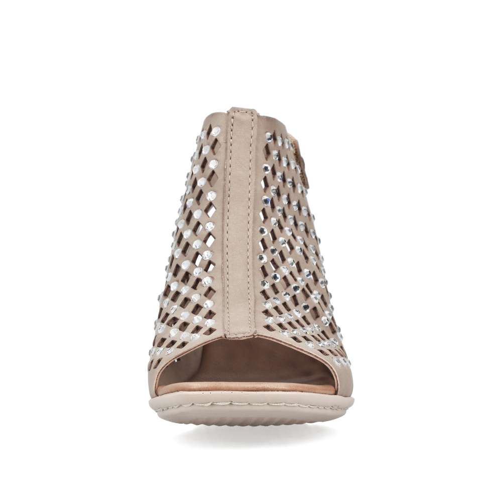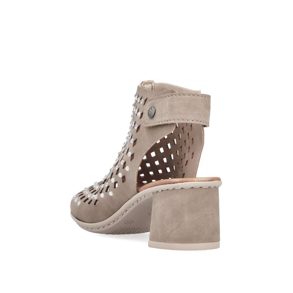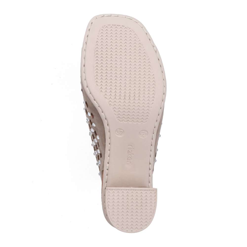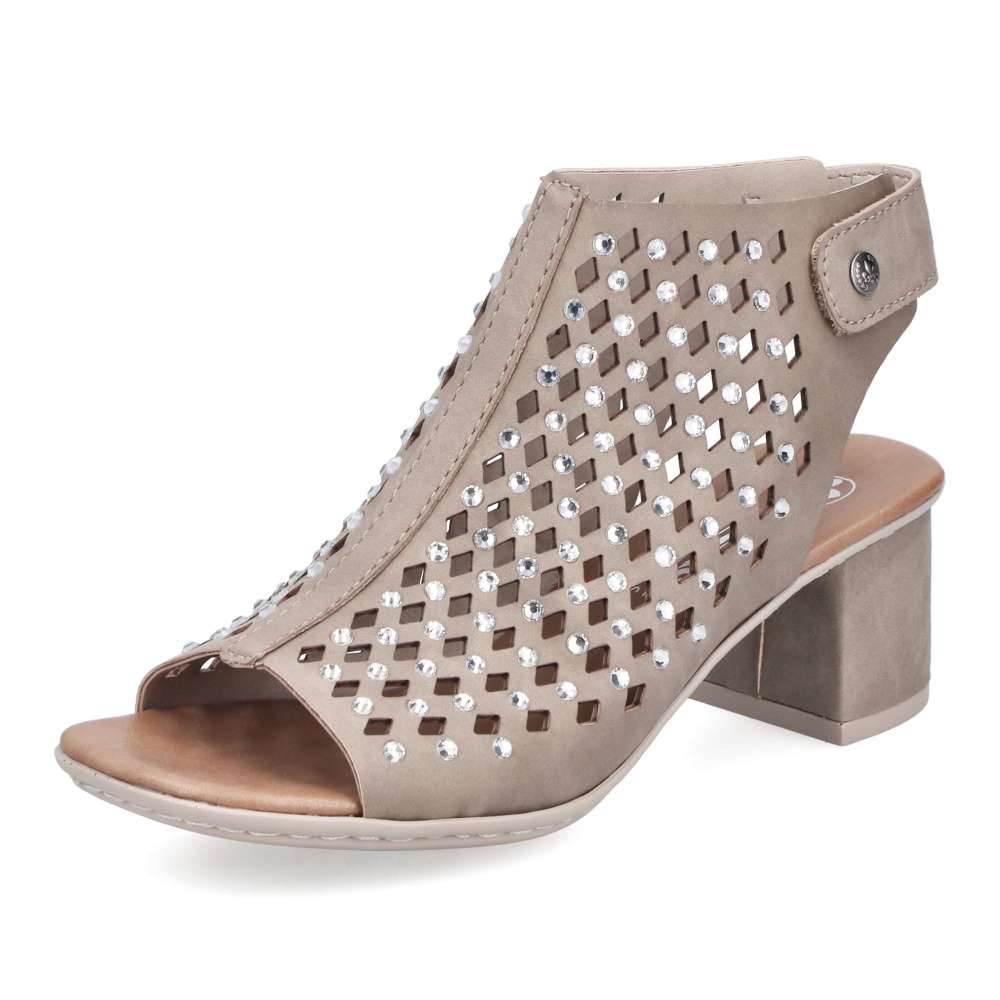Béžové sandály RIEKER okouzlí jemnou povrchovou perforací a působivými lesklými aplikacemi rozesetými po celém svršku, které modelu dodávají jedinečnost. Elegantní kombinace detailů vytváří harmonický design ideální pro letní dny plné stylu. Praktický pásek v oblasti paty se suchým zipem umožňuje snadné obutí a přesné přizpůsobení dle vašich potřeb. Komfortní stélka se postará o příjemný došlap, zatímco podešev vybavená technologií Antistress zajistí účinné tlumení nárazů při chůzi. Ženskou siluetu jemně zvýrazní široký podpatek, který dodává stabilitu i eleganci zároveň. Tyto sandály jsou dokonalým doplňkem, který podtrhne váš půvab a pohodlně vás bude provázet během celého dne.