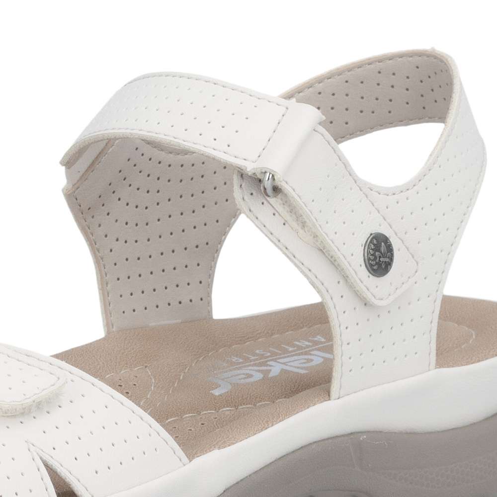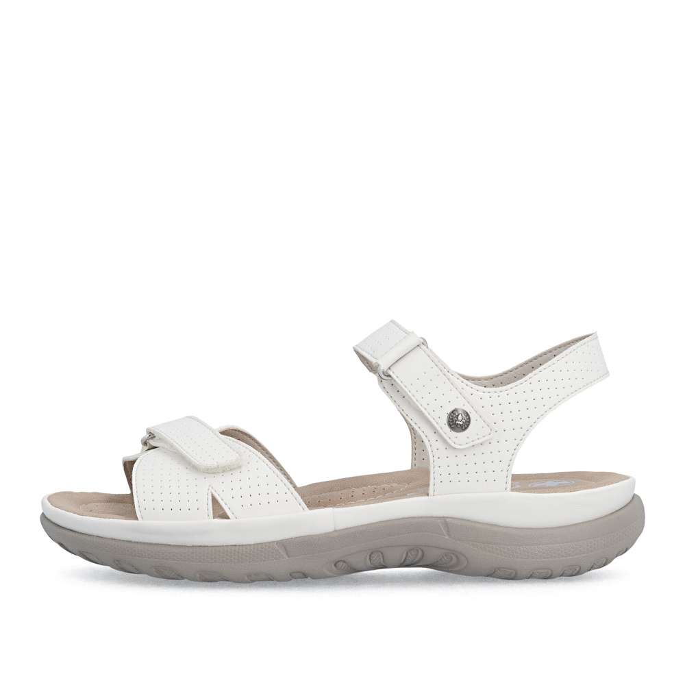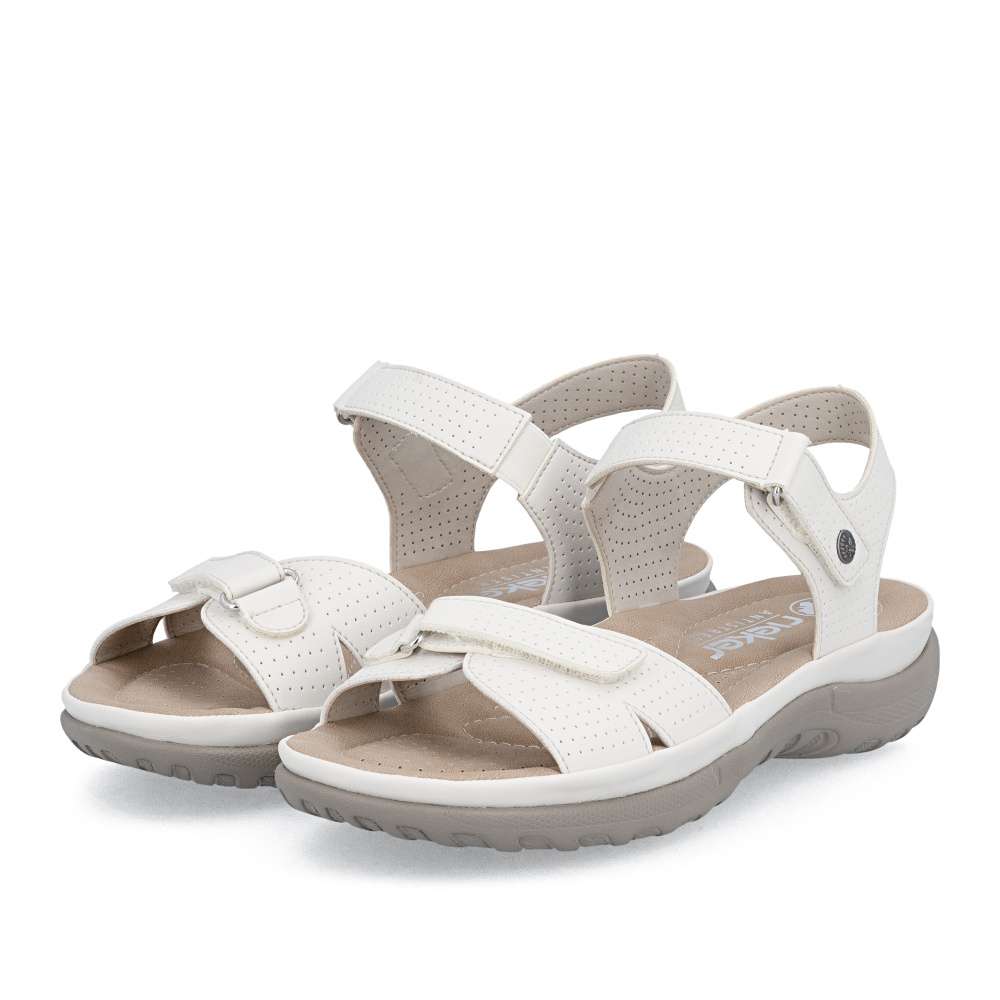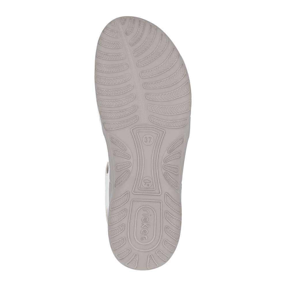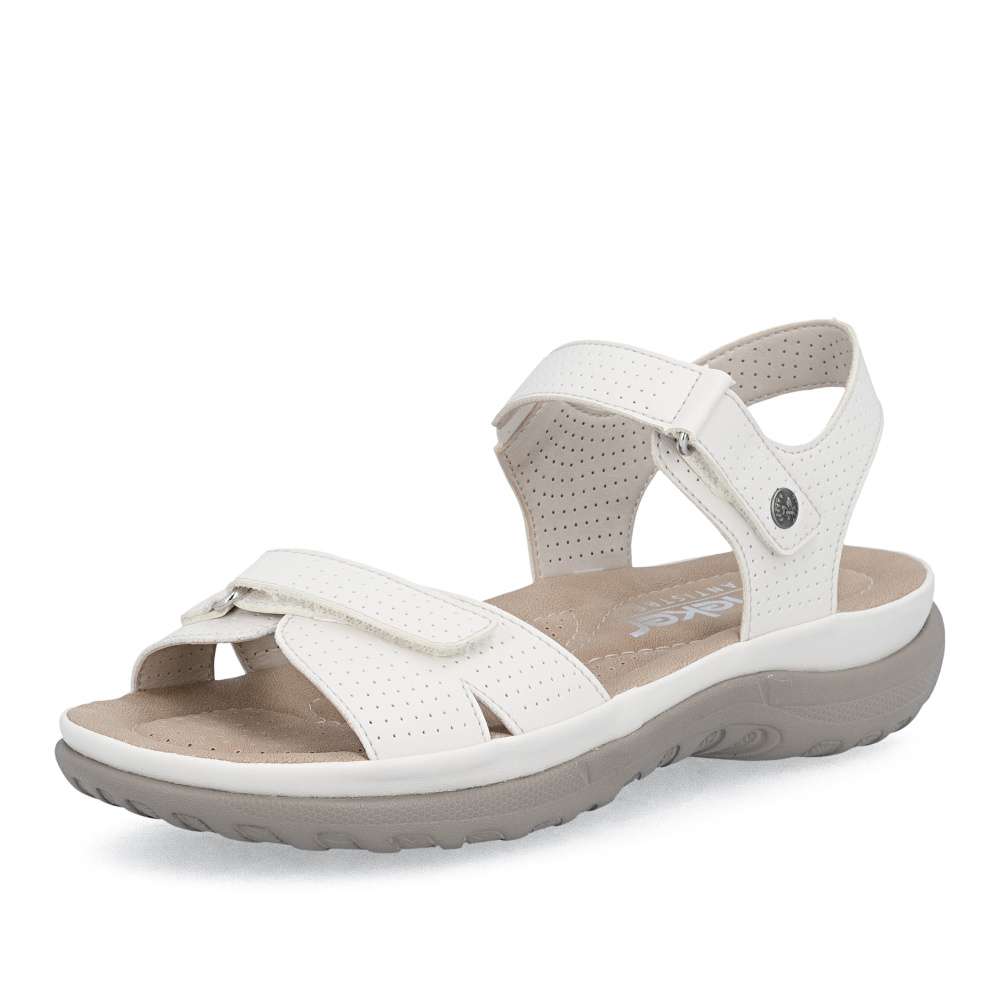 Nadčasový styl sandálů RIEKER ocení každá praktická žena, světlý svršek působí svěže a univerzálně, přičemž jej decentně dekoruje minimalistický vzor. Pásky jsou precizně poskládané tak, aby vytvářely harmonický vzhled a zároveň poskytovaly stabilitu. Jsou vybaveny praktickým suchým zipem, díky kterému si sandály jednoduše přizpůsobíte podle svých potřeb a zajistíte si pohodlné obutí. Příjemná stélka se postará o komfort při každém kroku a podešev efektivně tlumí nárazy při chůzi, čímž zvyšuje pohodlí během celodenního nošení. Tento model je ideální volbou pro běžné dny i volnočasové aktivity, kdy chcete vypadat stylově a cítit se komfortně.
