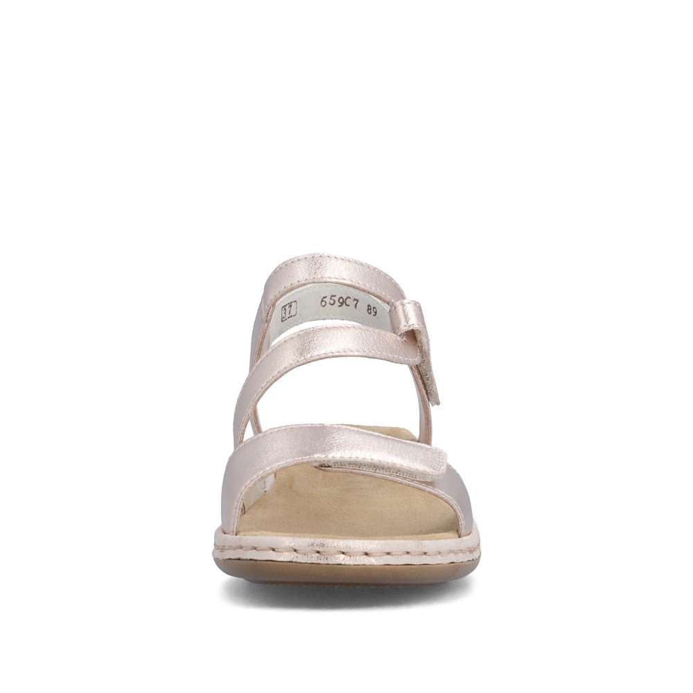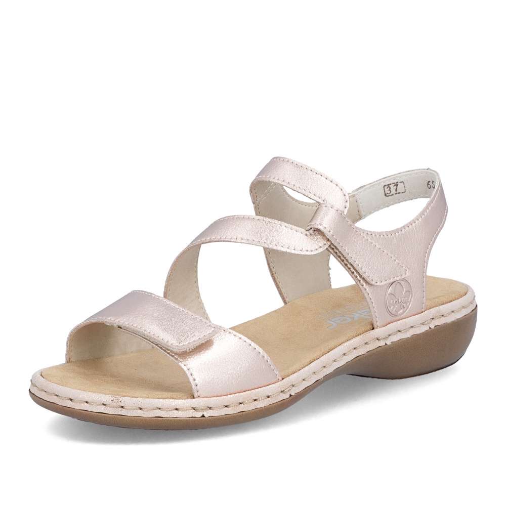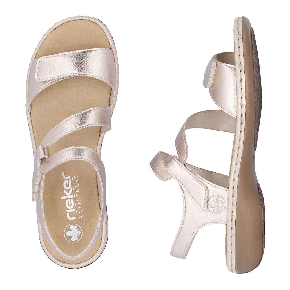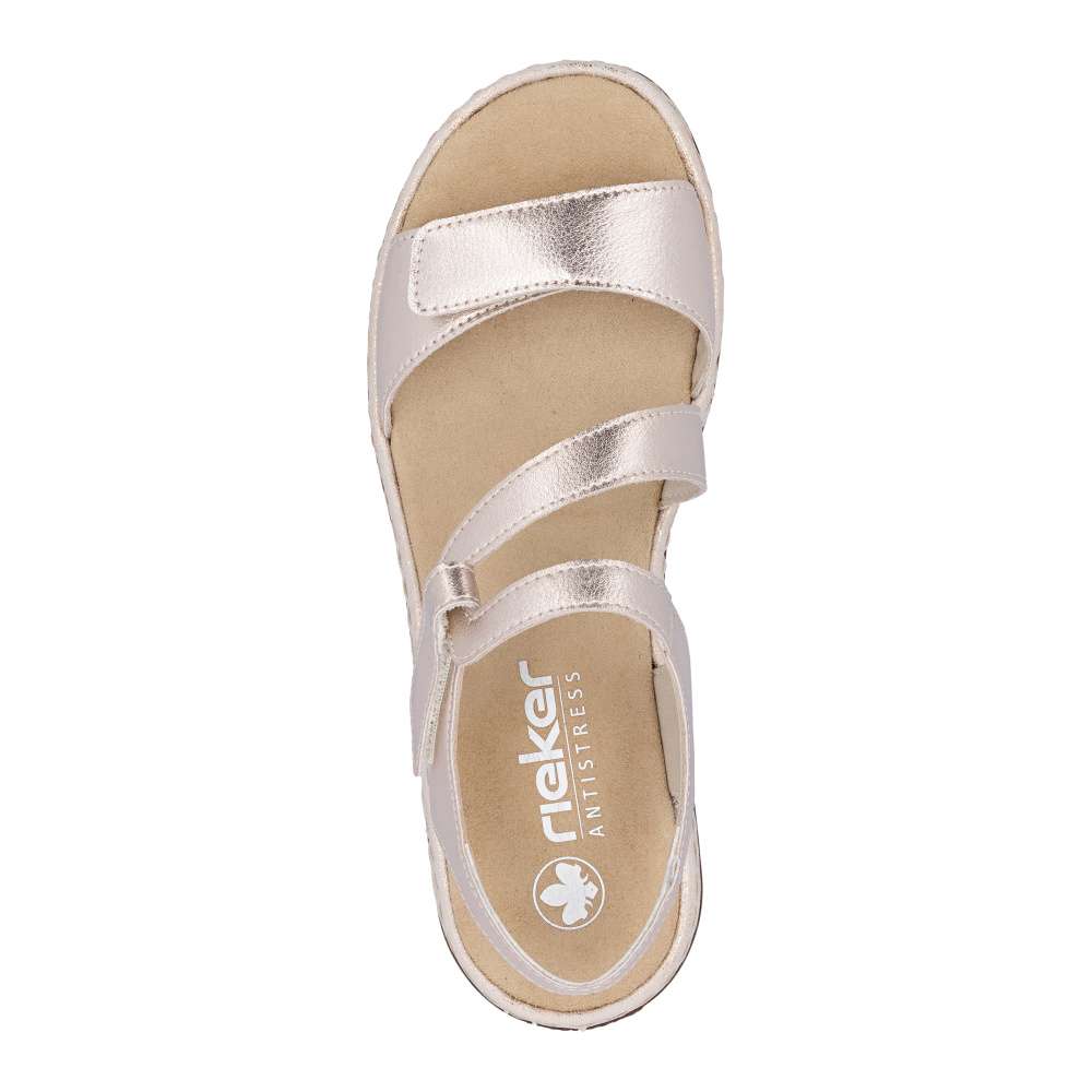 Tyto kožené sandály RIEKER vynikají svojí jedinečností díky důmyslně poskládaným páskům svršku s působivými odlesky. Design je výrazný a letně působící, ideální pro horké letní dny. Kombinace stylového vzhledu a komfortu, který nabízí příjemná stélka a nárazy tlumící podešev, činí tento model ideálním pro letní dny. Jednoduché nazutí je zajištěno pásky opatřenými suchým zipem pro rychlou manipulaci a dokonalé upravení potřebám každé z Vás. Tyto sandály skvěle propojují pohodlí s módním vzhledem a jsou ideální pro každodenní nošení během letních měsíců.