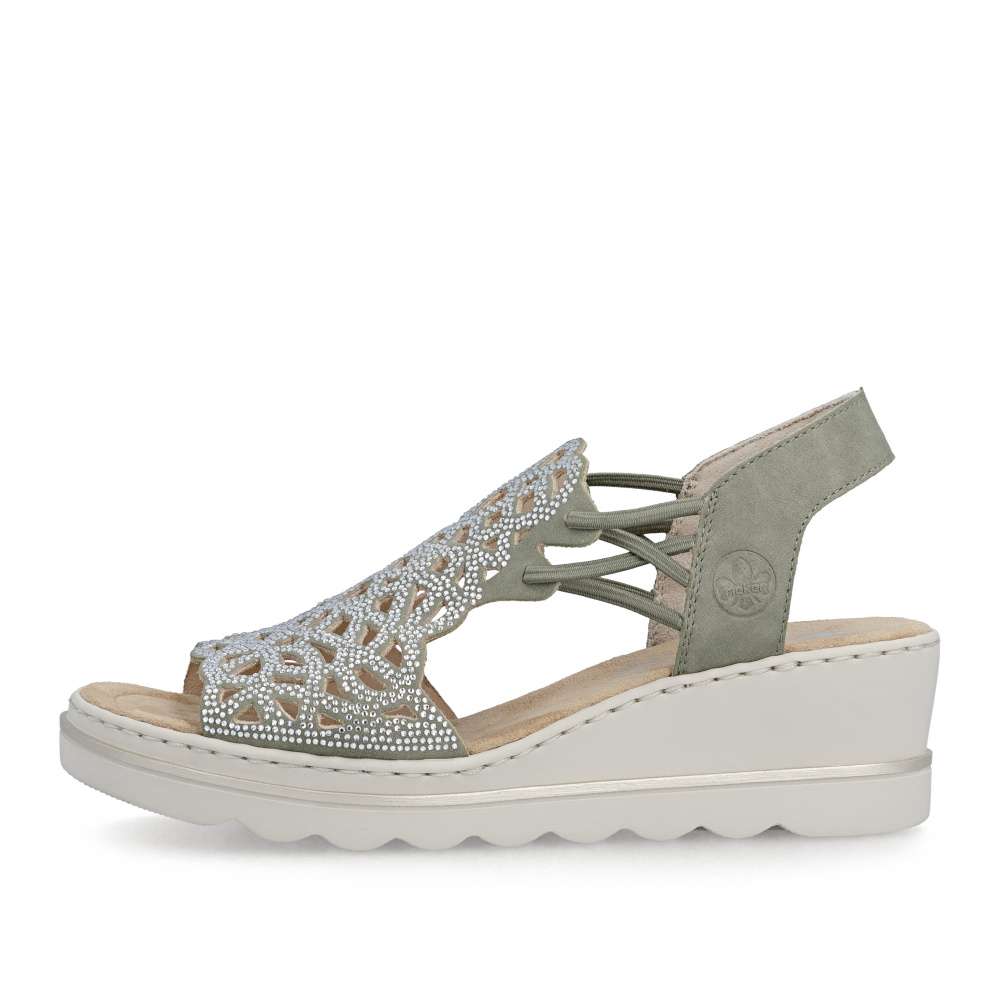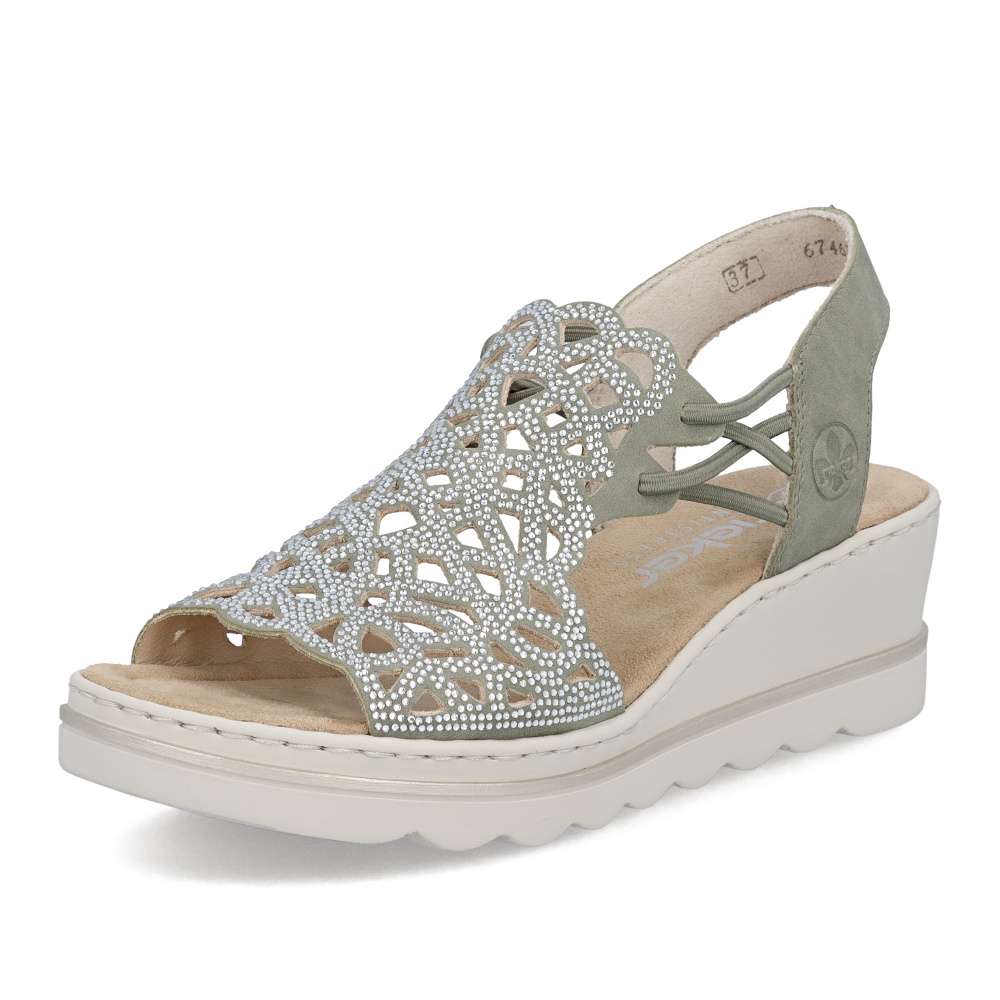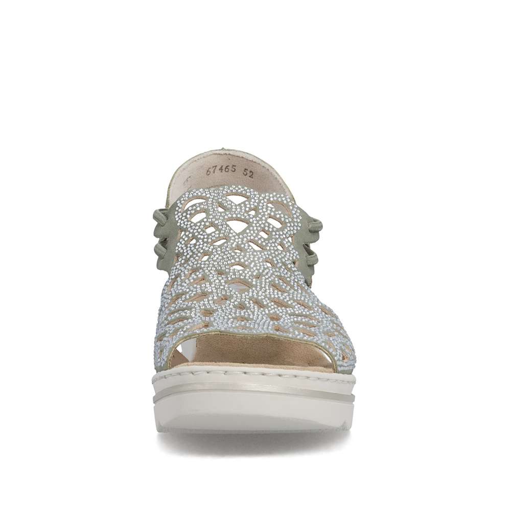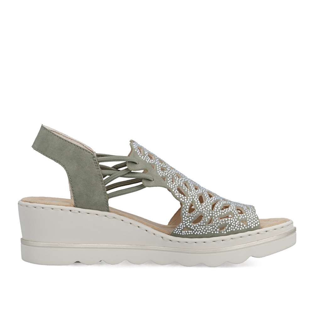 Sandálům RIEKER v zeleném odstínu zkrátka neodoláte! Zdobí je elegantní perforace doplněná třpytivými kamínky, které dodávají botám jemný lesk a elegantní výraz. Díky bočním gumičkám se snadno obouvají a skvěle drží na noze. Vyšší podešev nejen stylově vypadá, ale také efektivně tlumí nárazy při chůzi a příjemná stélka přináší příjemný došlap, díky těmto komfortním prvkům jsou tyto sandály ideální pro celodenní nošení. Výborně se hodí jak pro všední dny, tak pro speciální příležitosti, kdy chcete vypadat elegantně a cítit se pohodlně.
