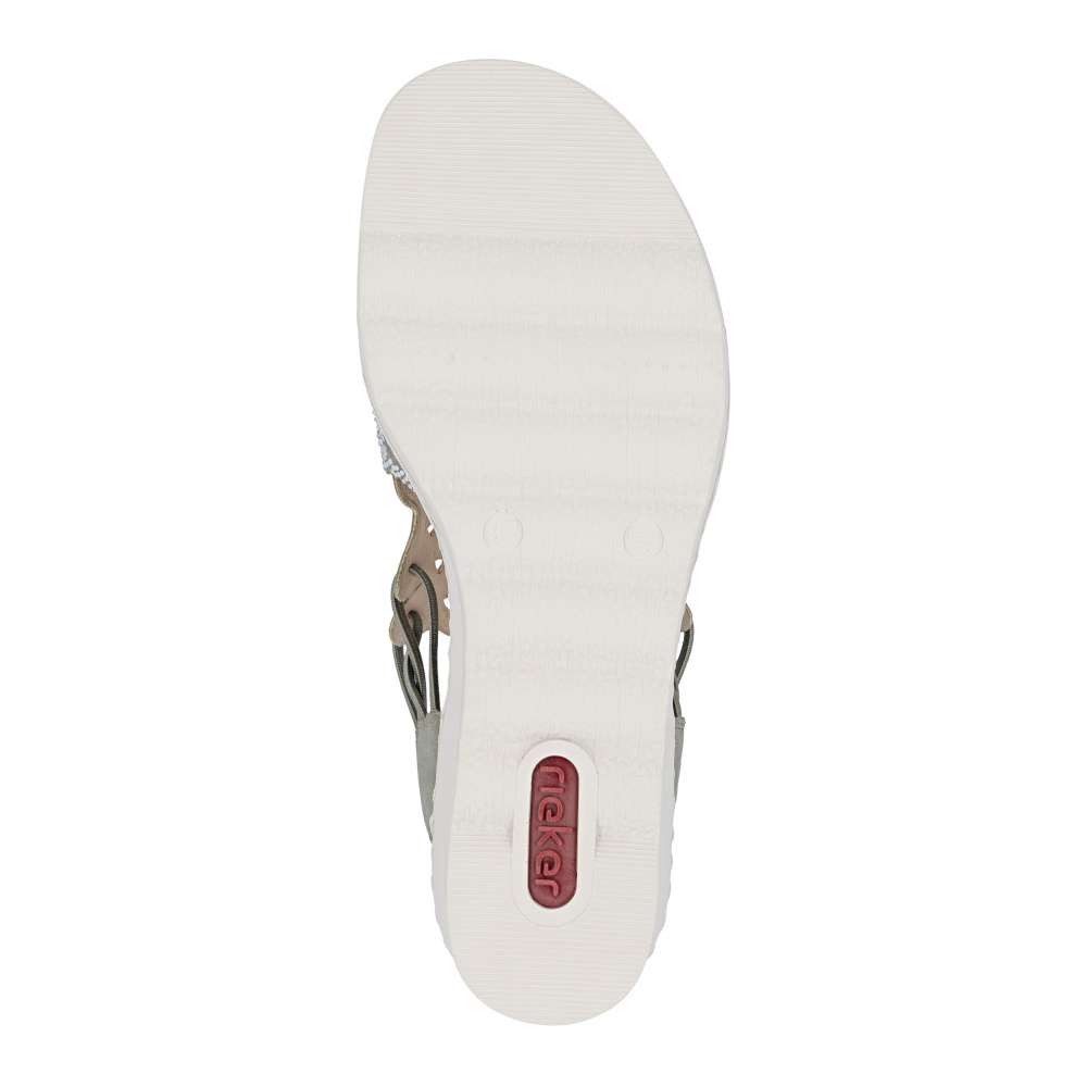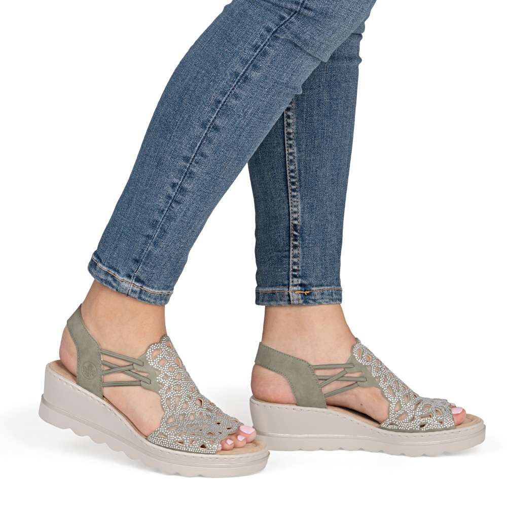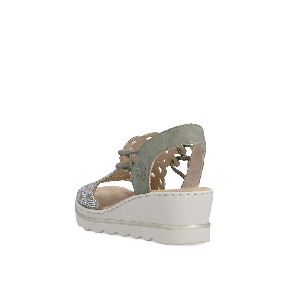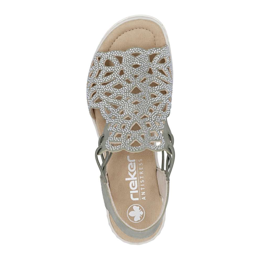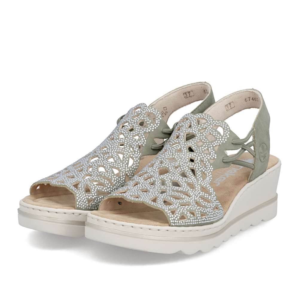 Sandálům RIEKER v zeleném odstínu zkrátka neodoláte! Zdobí je elegantní perforace doplněná třpytivými kamínky, které dodávají botám jemný lesk a elegantní výraz. Díky bočním gumičkám se snadno obouvají a skvěle drží na noze. Vyšší podešev nejen stylově vypadá, ale také efektivně tlumí nárazy při chůzi a příjemná stélka přináší příjemný došlap, díky těmto komfortním prvkům jsou tyto sandály ideální pro celodenní nošení. Výborně se hodí jak pro všední dny, tak pro speciální příležitosti, kdy chcete vypadat elegantně a cítit se pohodlně.