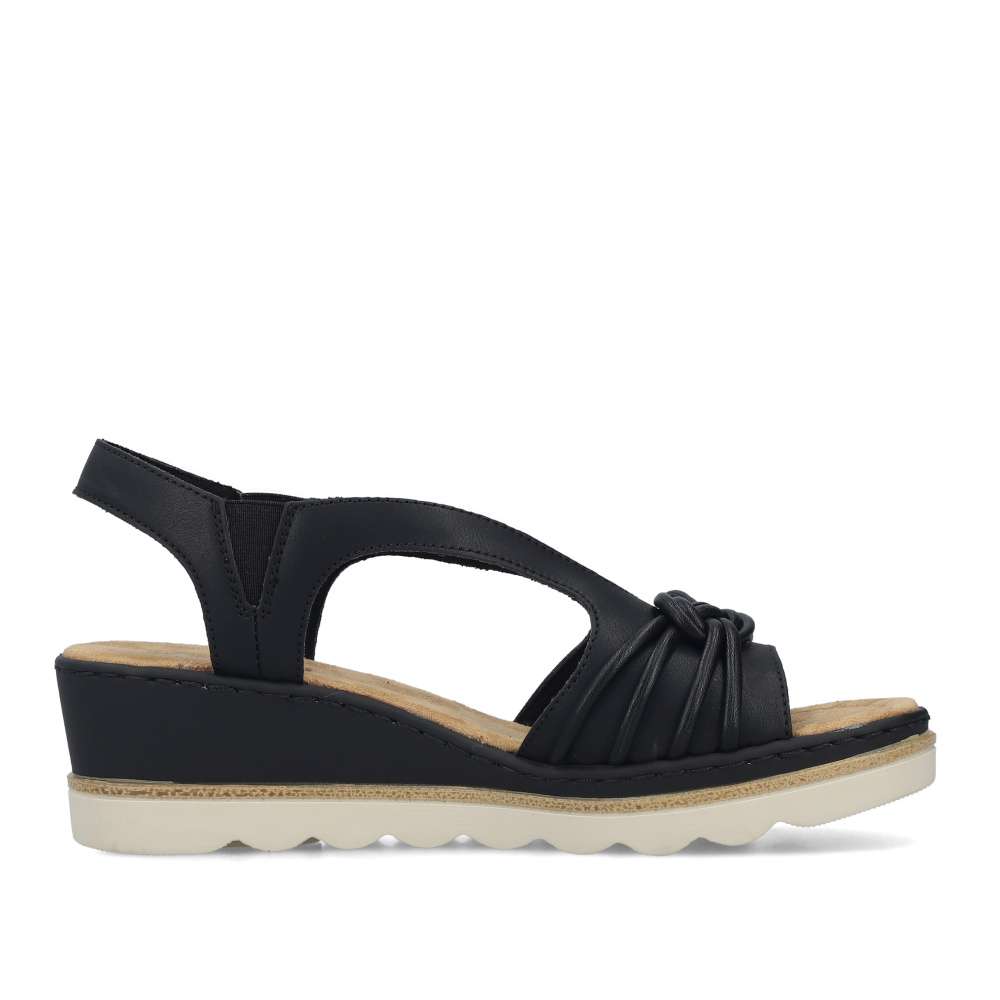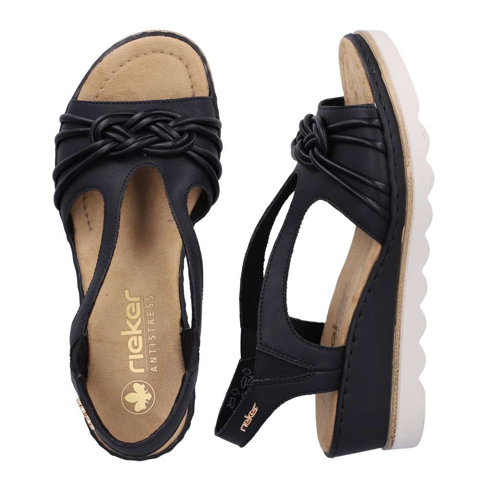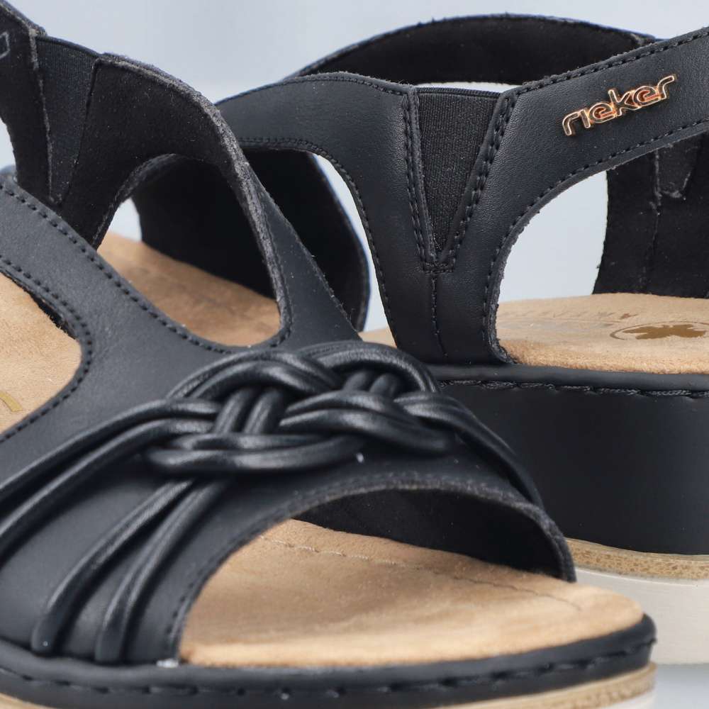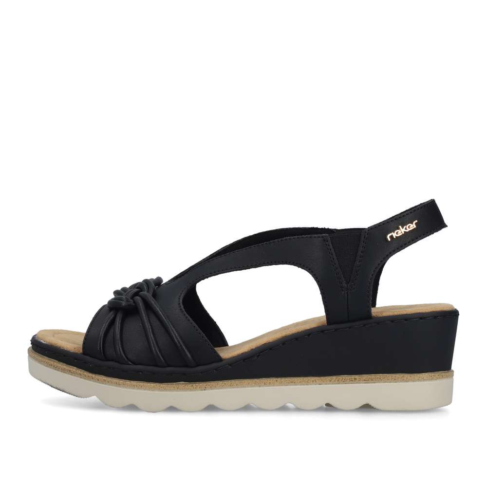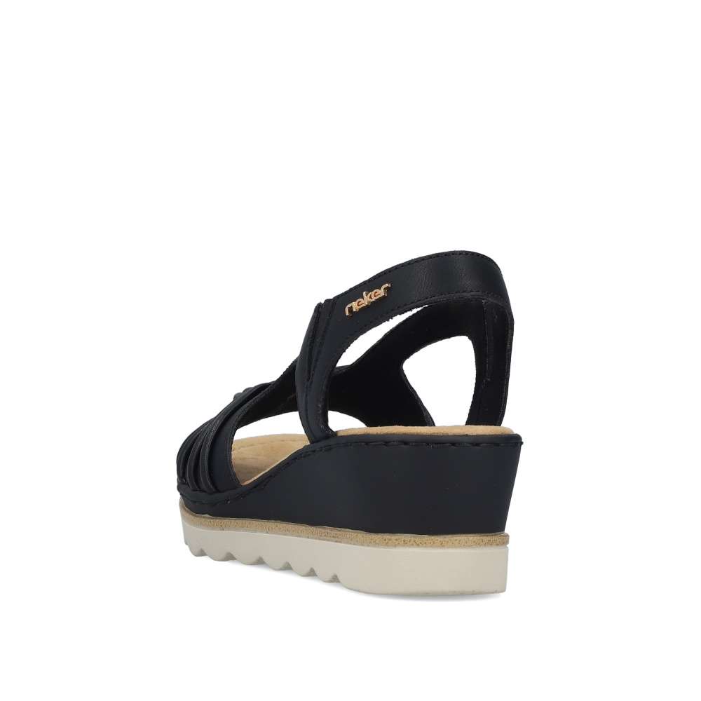 Půvabně ženský a zároveň výrazně atraktivní vzhled přinášejí tyto černé sandály značky RIEKER, které okouzlí na první pohled. Přední řemínek zdobí stylová aplikace, zatímco zadní pásek je doplněn logem značky v elegantní zlaté barvě. Vsazené gumičky po stranách kotníku zabezpečují dokonalé přizpůsobení chodidlu a pohodlné obouvání bez námahy. Měkká textilní stélka poskytuje příjemný pocit při každém kroku a postará se o celodenní komfort. Klínový podpatek v působivém designu nejen krásně zvýrazní siluetu, ale zároveň efektivně tlumí nárazy při chůzi, čímž zvyšuje stabilitu i pohodlí. Tento model je ideální volbou pro ženy, které chtějí zazářit stylem bez kompromisů v pohodlí.