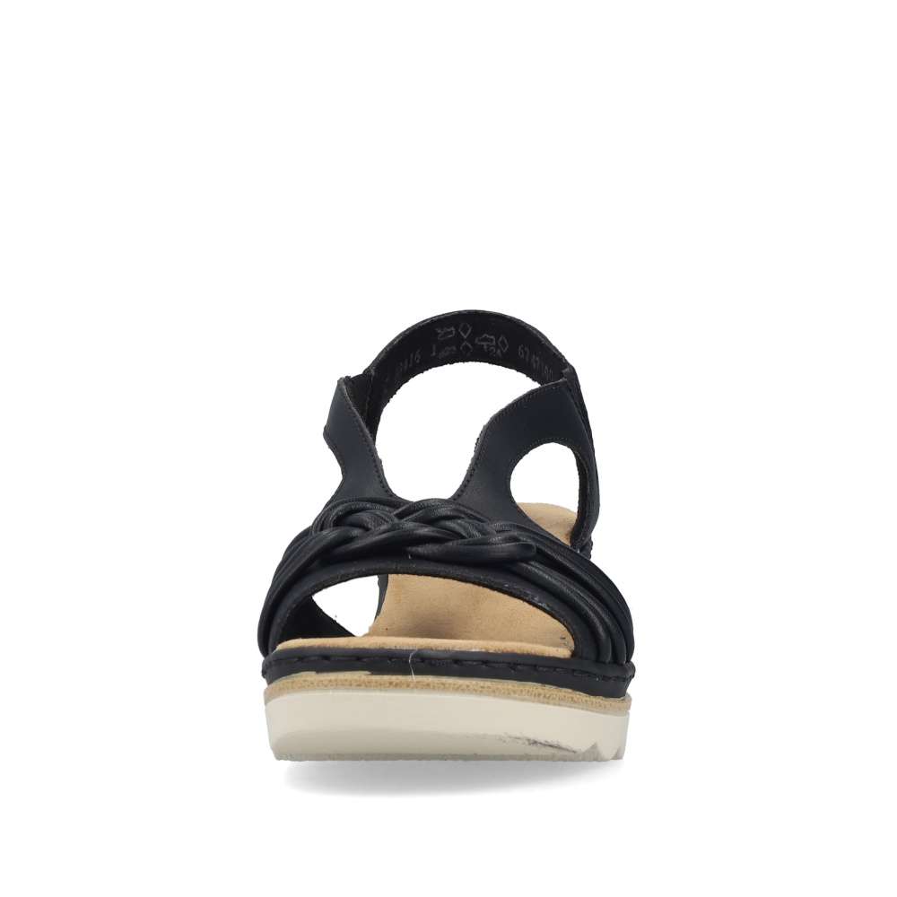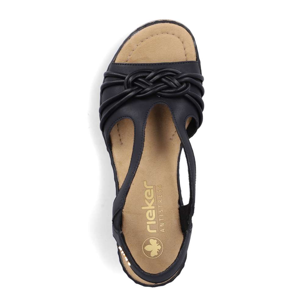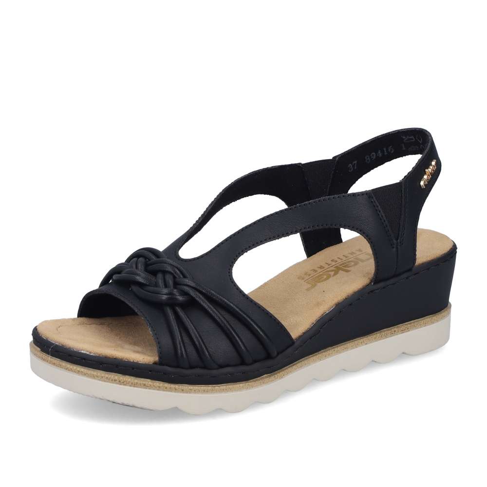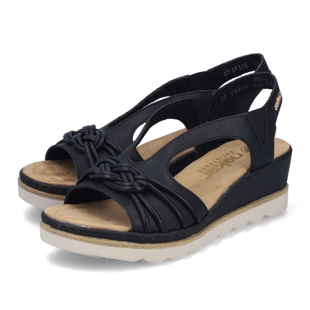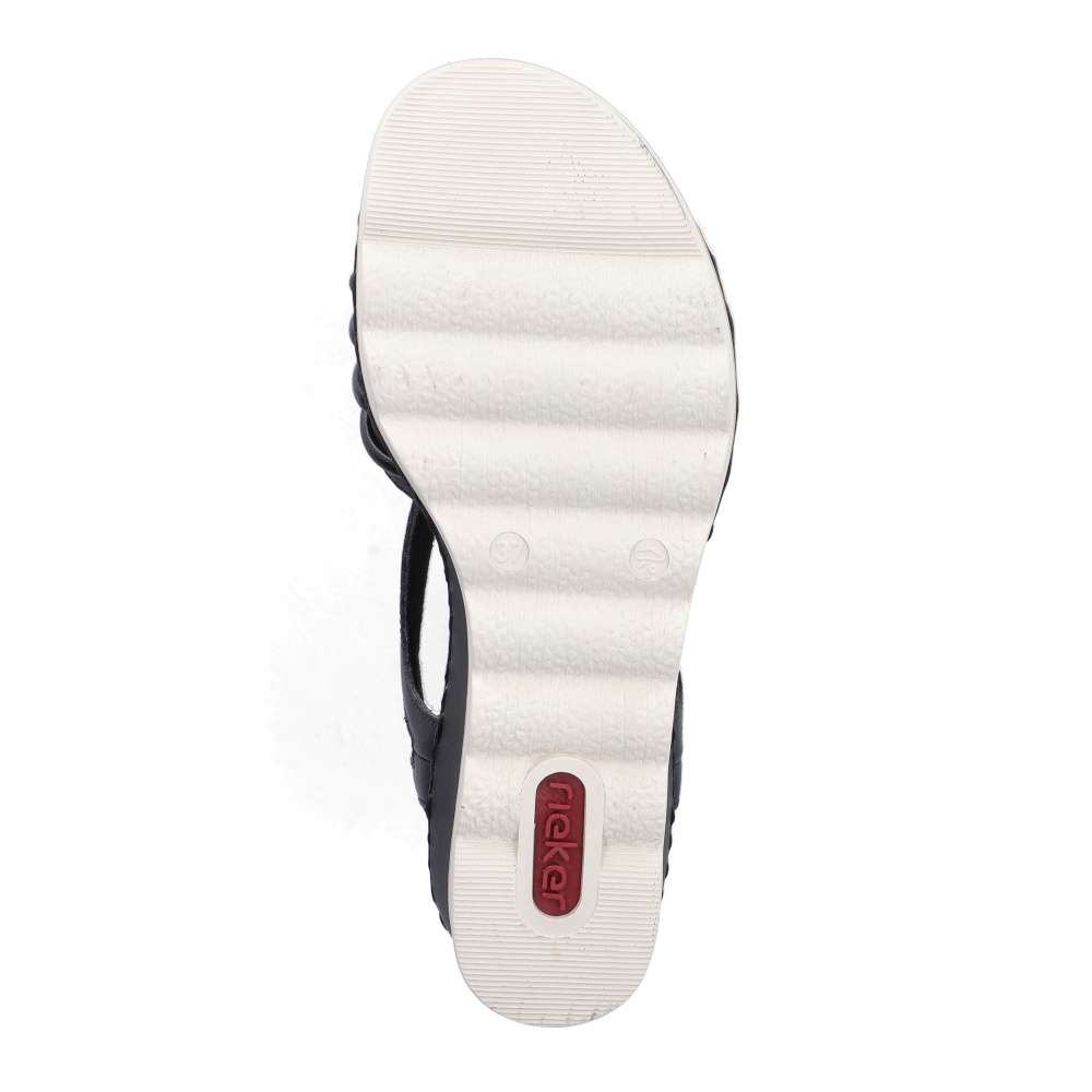 Půvabně ženský a zároveň výrazně atraktivní vzhled přinášejí tyto černé sandály značky RIEKER, které okouzlí na první pohled. Přední řemínek zdobí stylová aplikace, zatímco zadní pásek je doplněn logem značky v elegantní zlaté barvě. Vsazené gumičky po stranách kotníku zabezpečují dokonalé přizpůsobení chodidlu a pohodlné obouvání bez námahy. Měkká textilní stélka poskytuje příjemný pocit při každém kroku a postará se o celodenní komfort. Klínový podpatek v působivém designu nejen krásně zvýrazní siluetu, ale zároveň efektivně tlumí nárazy při chůzi, čímž zvyšuje stabilitu i pohodlí. Tento model je ideální volbou pro ženy, které chtějí zazářit stylem bez kompromisů v pohodlí.