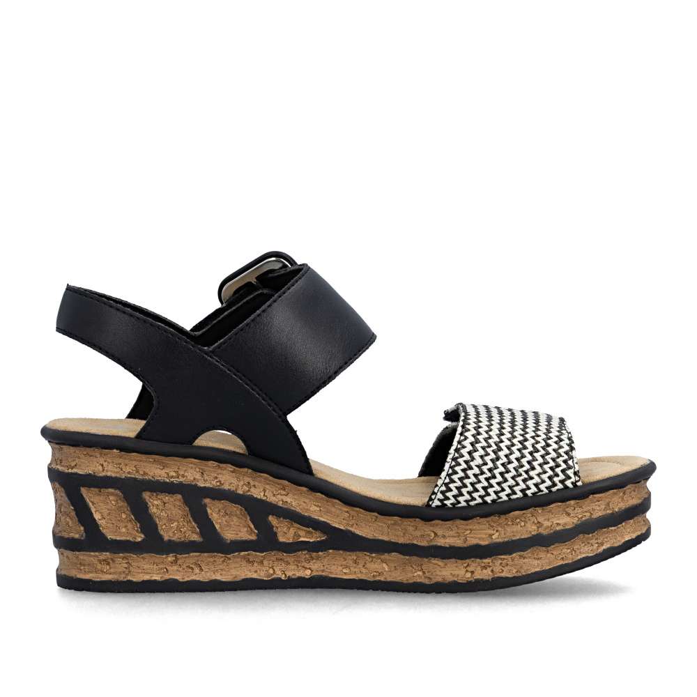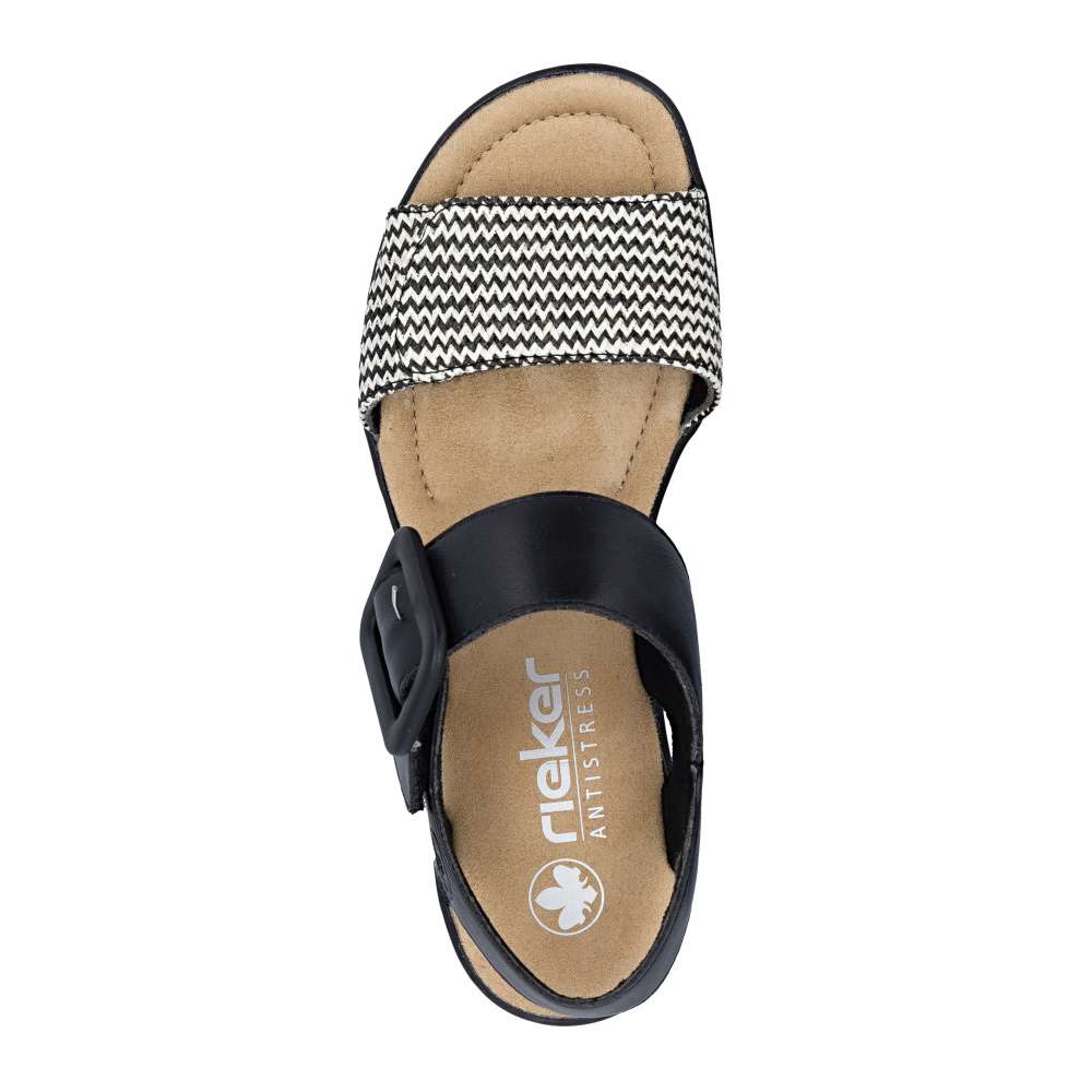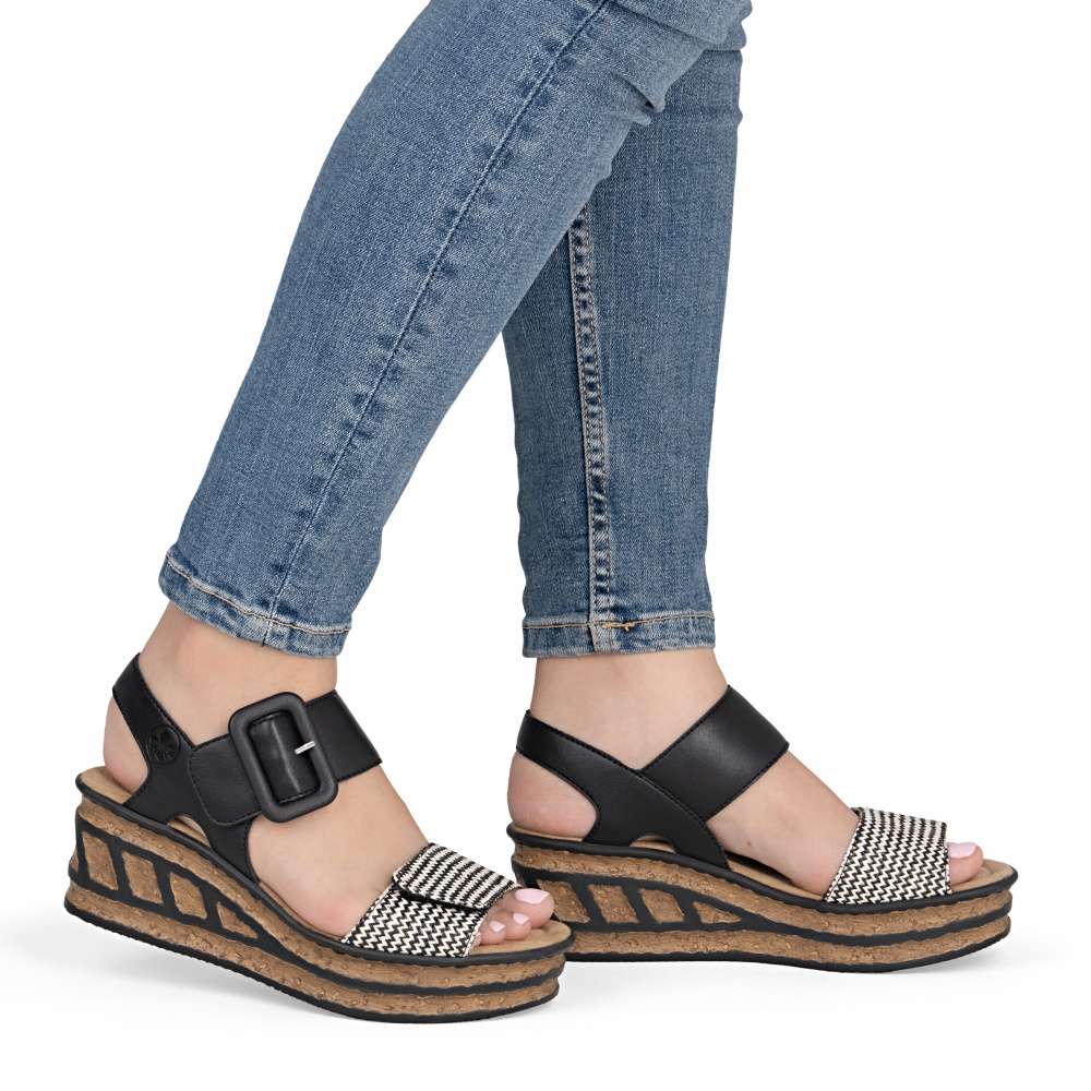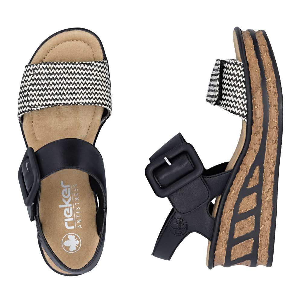 Tyto sandály RIEKER jsou oslavou ženskosti, originality a bezstarostného pohodlí. Už na první pohled okouzlí promyšlenou kombinací materiálů a efektního předního pásku, který vyniká svojí strukturou a barevností, což dodává modelu nepřehlédnutelný charakter. Pásky se suchým zipem vám umožní sandály snadno přizpůsobit přesně podle tvaru nohy a nártový pásek zdobí výrazná spona. Měkká textilní stélka rozmazlí vaše chodidla a poskytne komfort i během dlouhých dnů strávených na nohou. Dominantou modelu je klínový podpatek, který dodává stabilitu, účinně tlumí nárazy při chůzi a zároveň zvýrazňuje originalitu celkového designu. Díky němu působí vaše silueta elegantněji a každý krok je přirozený a sebevědomý. Tyto sandály jsou stvořeny pro chvíle, kdy chcete kráčet s úsměvem, cítit se pohodlně a nechat vyniknout svůj styl - ať už se procházíte městem, užíváte si letní den nebo vyrazíte za odpočinkem.