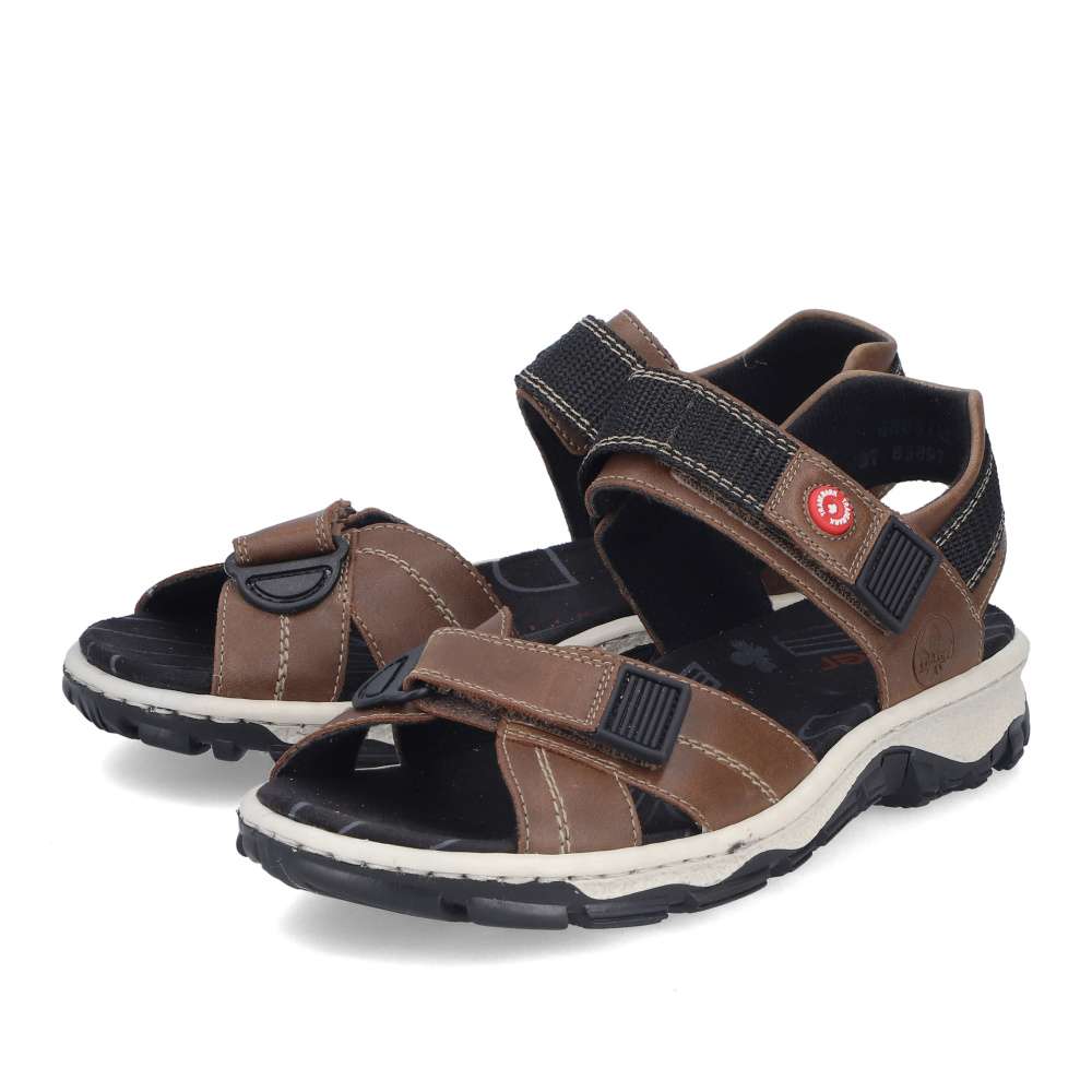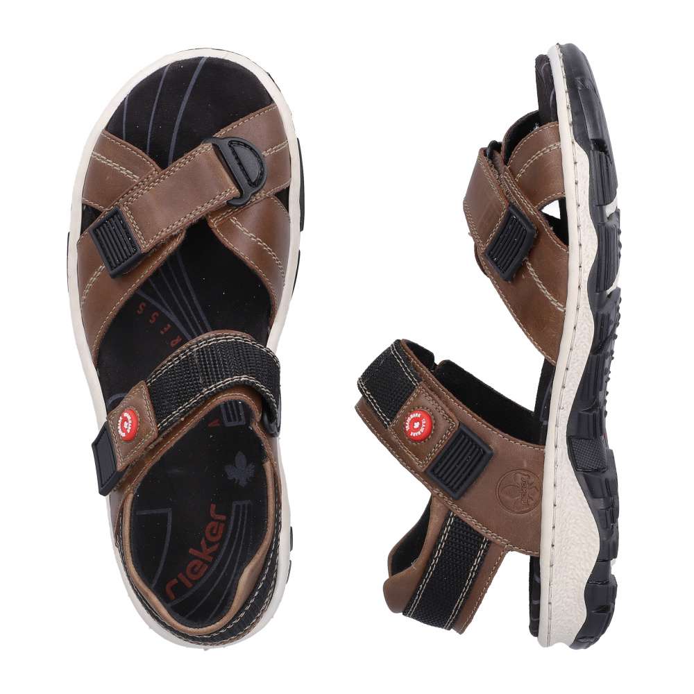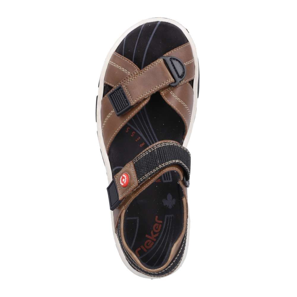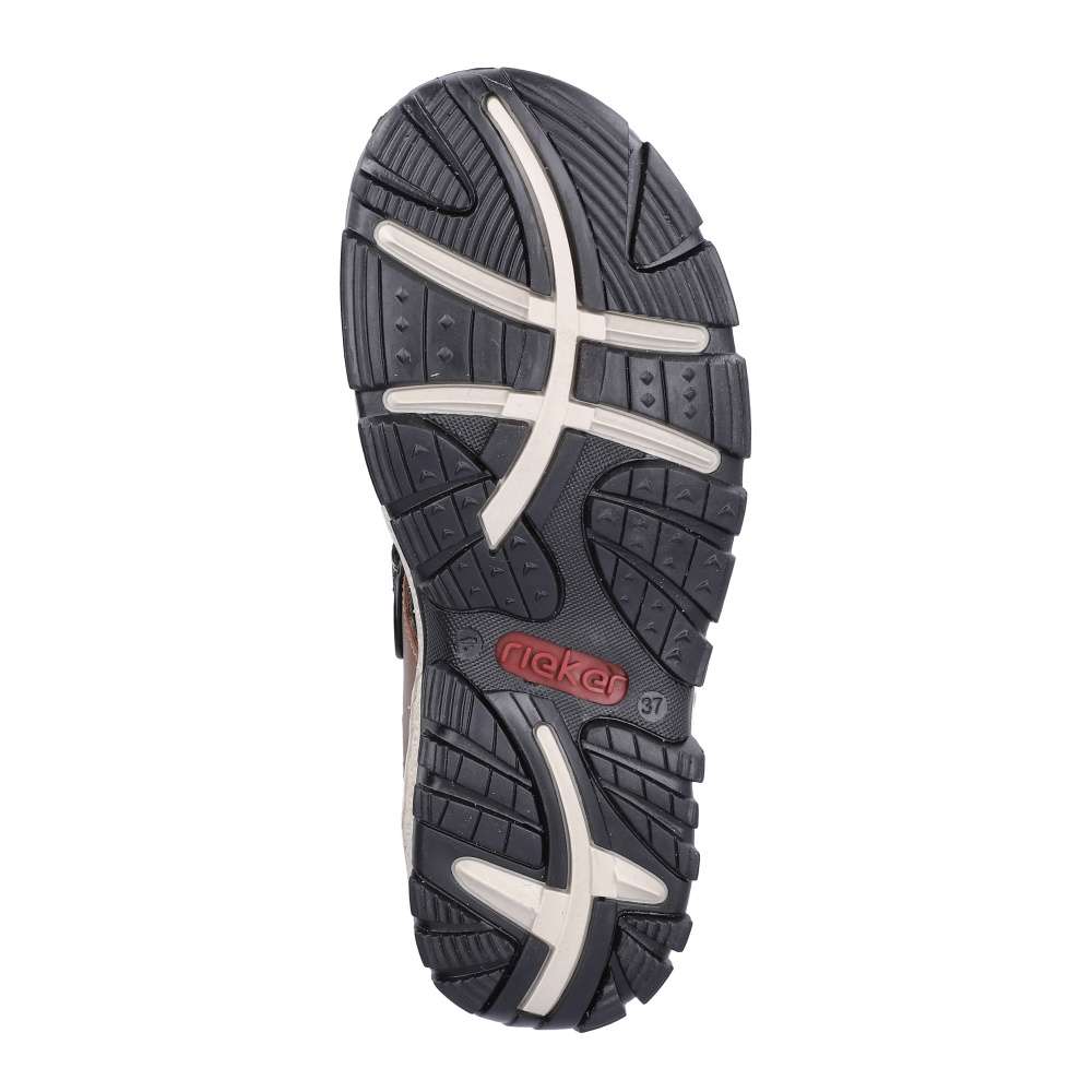 Tyto sportovní sandály značky RIEKER kombinují pohodlí, funkčnost a moderní design. Hnědé pásky jsou vybaveny měkkou podšívkou, která chrání chodidlo a zajišťuje komfort při každém kroku. Suché zipy na nastavitelných řemínkách umožňují přizpůsobení obuvi tvaru chodidla, díky čemuž sandály pevně drží a zároveň se snadno obouvají. Stélka poskytuje příjemný pocit při kontaktu s nohou, zatímco flexibilní podešev se systémem Antistress tlumí nárazy a zaručuje stabilitu a pohodlí po celý den. Tyto sandály jsou ideální pro volnočasové aktivity, procházky nebo sportovní využití, kde oceníte kombinaci praktičnosti a stylového vzhledu.