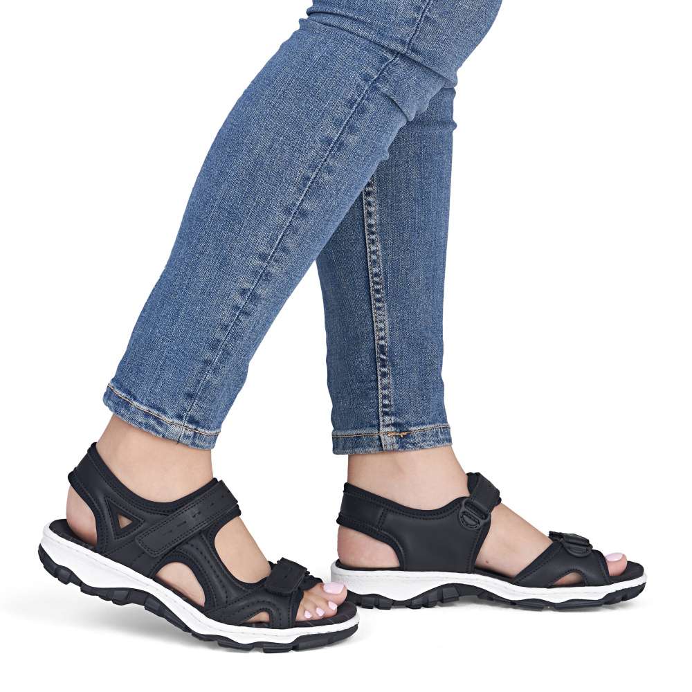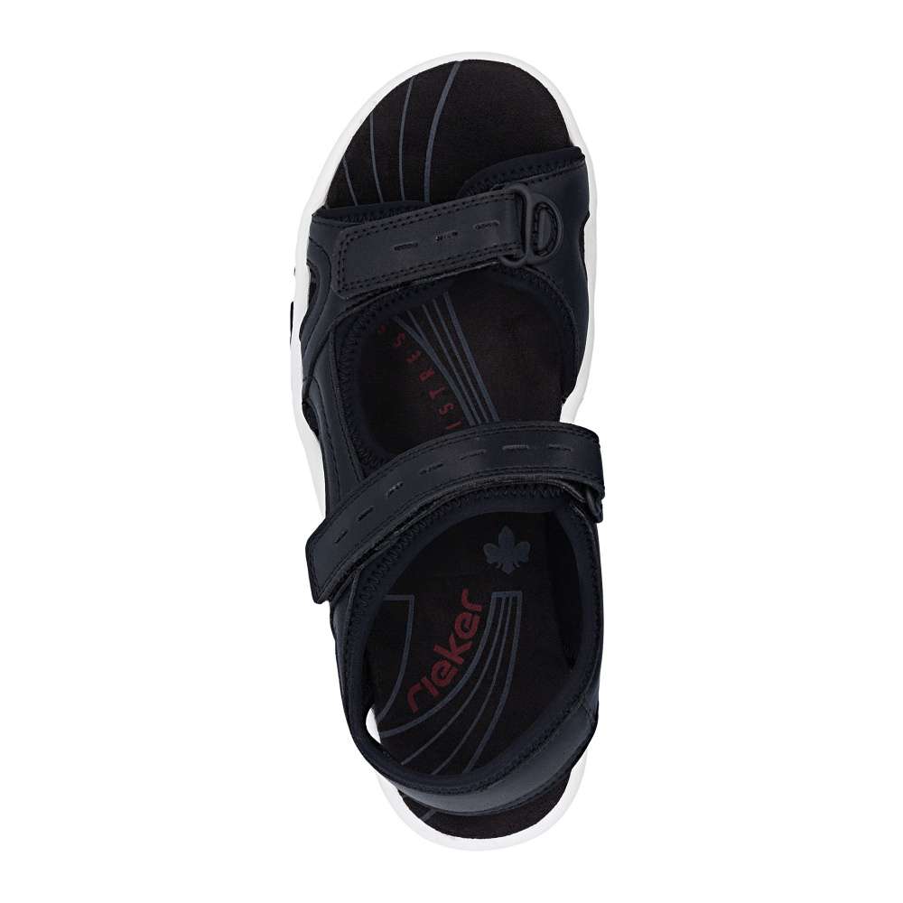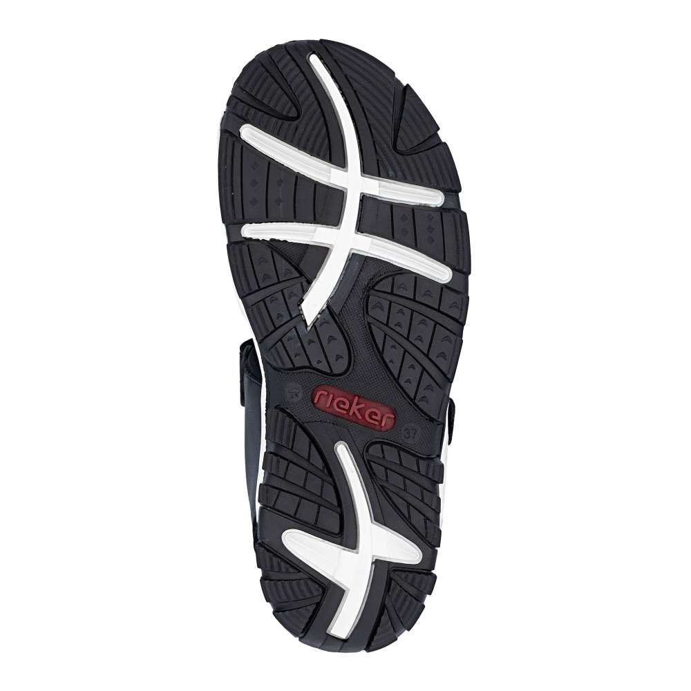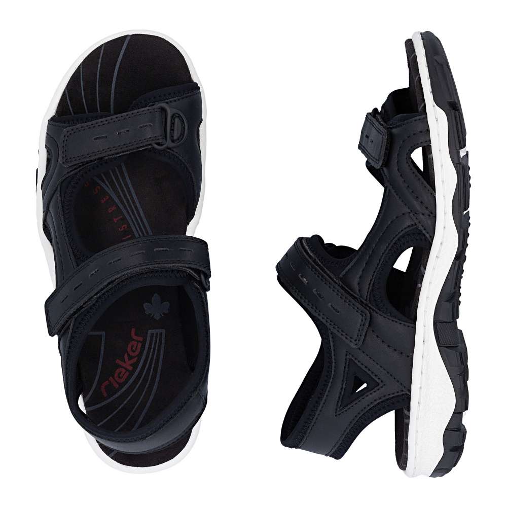 Dámské sportovní sandály RIEKER se vám budou hodit na každém letním výletu. Svršek je vyroben v nadčasové černé barvě se zajímavou kombinací materiálů a liniemi prošití. Zapínání je na suchý zip a díky němu si pásky můžete utáhnout podle svých potřeb a vytvořit maximální pohodlí. Textilní stélka a flexibilní podešev zajistí celodenní komfort, který ocení jistě mnohé z Vás. Potřebujete obuv vhodnou jak do přírody, tak procházku městem? Pak jste ji právě našli!