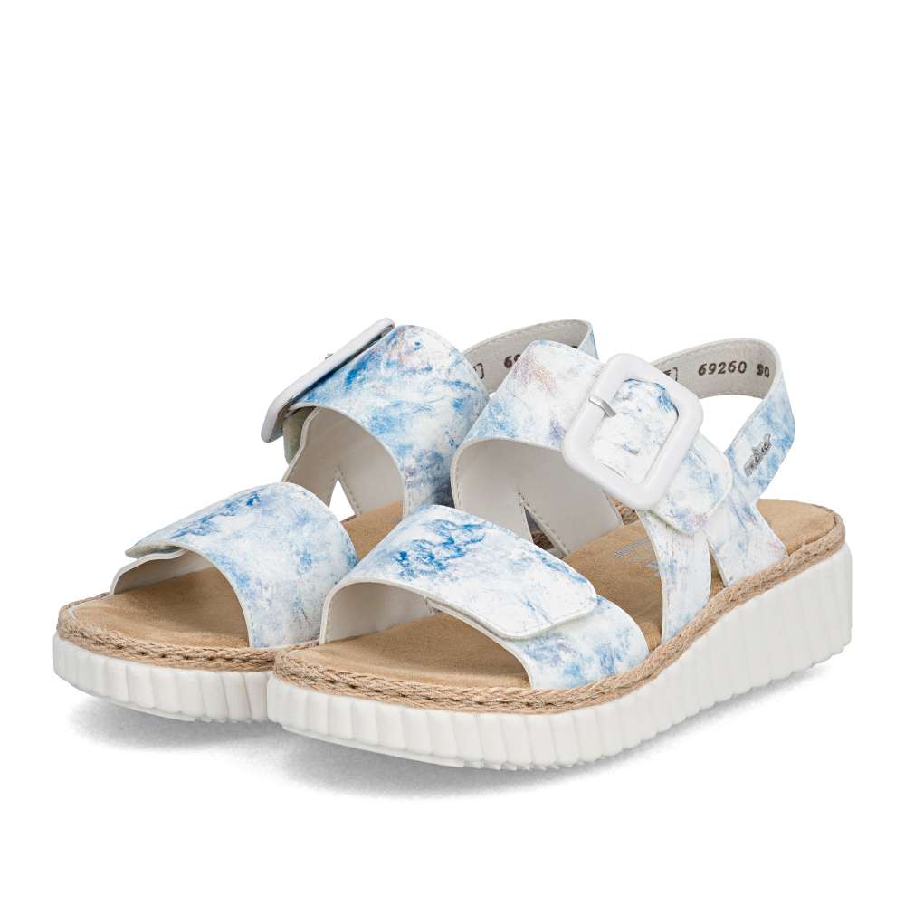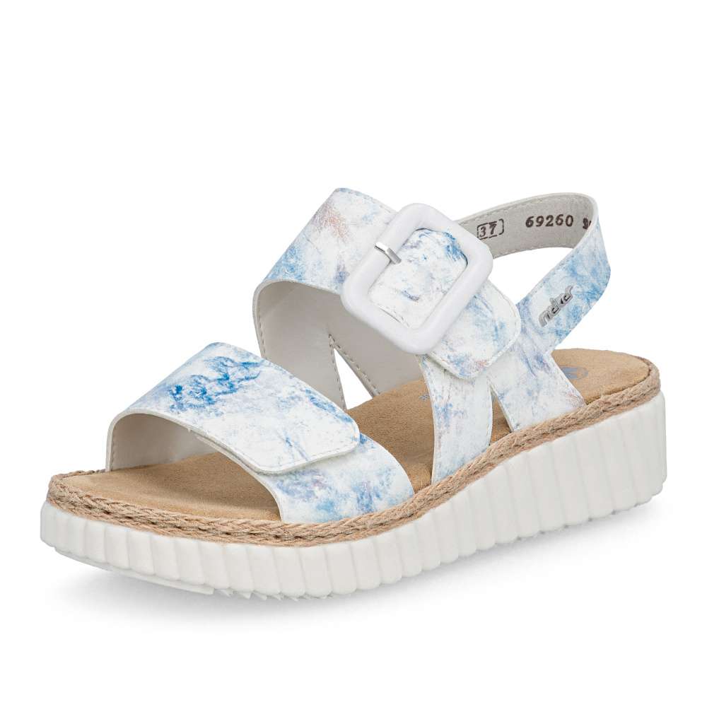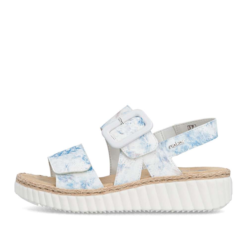Tyto sandály RIEKER jsou dokonalou kombinací každodenního pohodlí a vkusného designu, díky čemuž se stanou spolehlivým společníkem pro běžné dny i výjimečné příležitosti. Na první pohled zaujmou svrškem bílé barvy, který je oživen unikátním barevným potiskem a dodává modelu svěží letní vzhled. Výrazná dekorativní spona na pásku přes nárt působí jako stylový detail, který podtrhuje celkový charakter obuvi. Promyšlené zapínání zajišťuje maximální pohodlí při nošení - pásky se suchým zipem přes nárt umožňují rychlé obouvání i snadné přizpůsobení tvaru chodidla podle individuálních potřeb. Zadní pásek je pevný, doplněný elastickou gumičkou, díky čemuž sandály spolehlivě drží na noze. O komfort během celého dne se stará měkká stélka, která příjemně tlumí došlap, spolu s podešví tlumící nárazy. Klínový podpatek dodává sandálům elegantní siluetu, ale zároveň zachovává stabilitu a jistotu kroku. Velkou výhodou je také širší střih, který poskytuje dostatek prostoru i pro širší chodidlo a zaručuje přirozený pocit pohodlí. Tyto sandály RIEKER jsou ideální volbou pro ženy, které hledají stylovou a pohodlnou letní obuv, vhodnou do města, do práce, na procházky i společenská setkání.