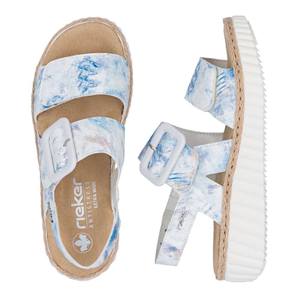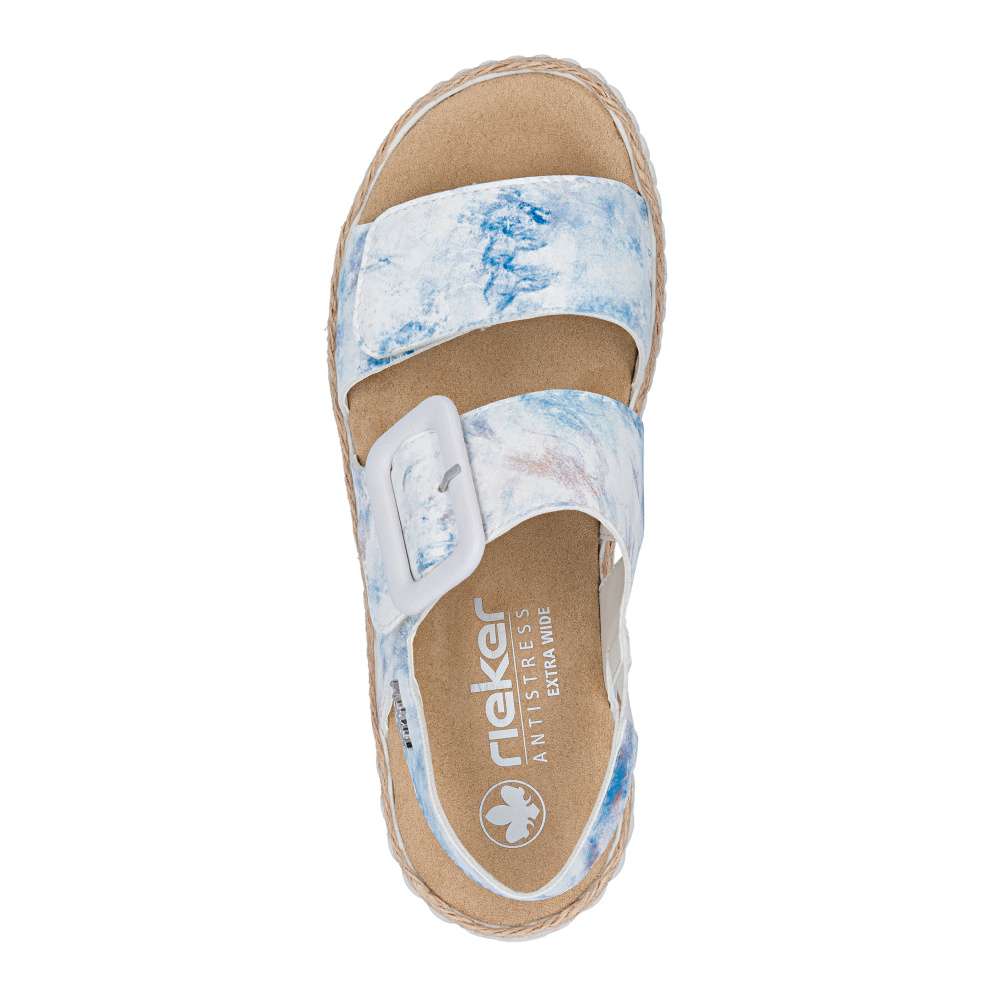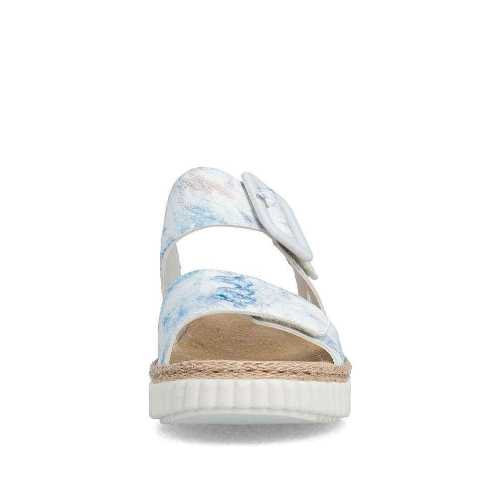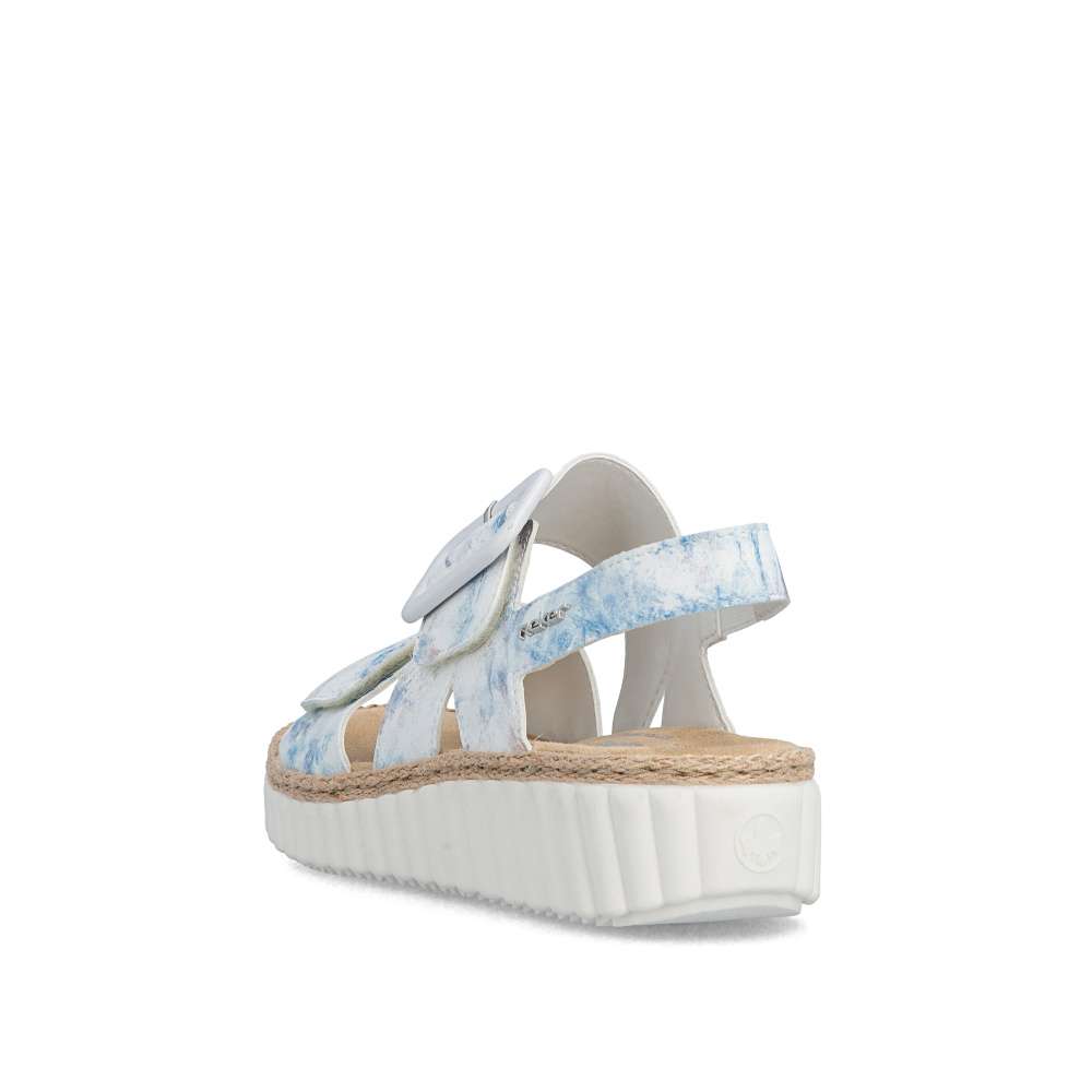 Tyto sandály RIEKER jsou dokonalou kombinací každodenního pohodlí a vkusného designu, díky čemuž se stanou spolehlivým společníkem pro běžné dny i výjimečné příležitosti. Na první pohled zaujmou svrškem bílé barvy, který je oživen unikátním barevným potiskem a dodává modelu svěží letní vzhled. Výrazná dekorativní spona na pásku přes nárt působí jako stylový detail, který podtrhuje celkový charakter obuvi. Promyšlené zapínání zajišťuje maximální pohodlí při nošení - pásky se suchým zipem přes nárt umožňují rychlé obouvání i snadné přizpůsobení tvaru chodidla podle individuálních potřeb. Zadní pásek je pevný, doplněný elastickou gumičkou, díky čemuž sandály spolehlivě drží na noze. O komfort během celého dne se stará měkká stélka, která příjemně tlumí došlap, spolu s podešví tlumící nárazy. Klínový podpatek dodává sandálům elegantní siluetu, ale zároveň zachovává stabilitu a jistotu kroku. Velkou výhodou je také širší střih, který poskytuje dostatek prostoru i pro širší chodidlo a zaručuje přirozený pocit pohodlí. Tyto sandály RIEKER jsou ideální volbou pro ženy, které hledají stylovou a pohodlnou letní obuv, vhodnou do města, do práce, na procházky i společenská setkání.