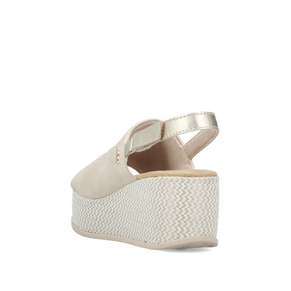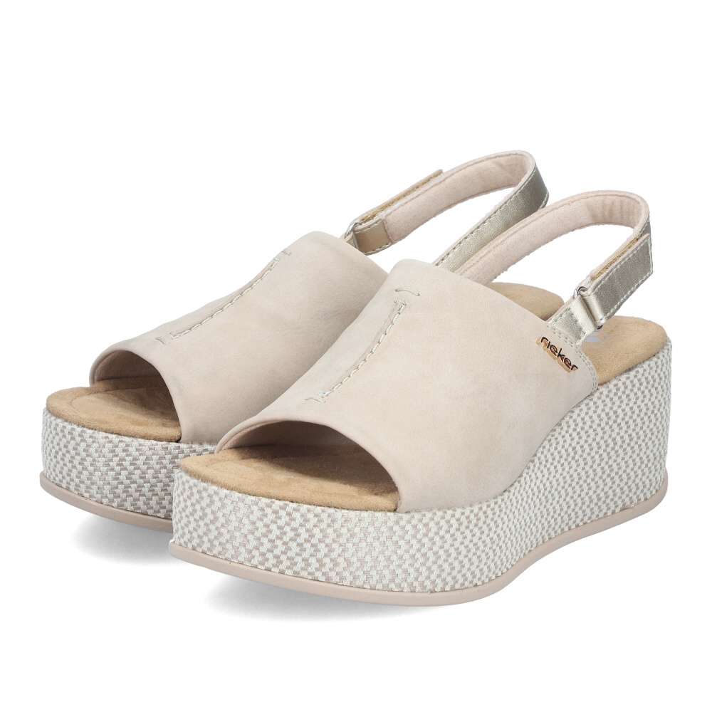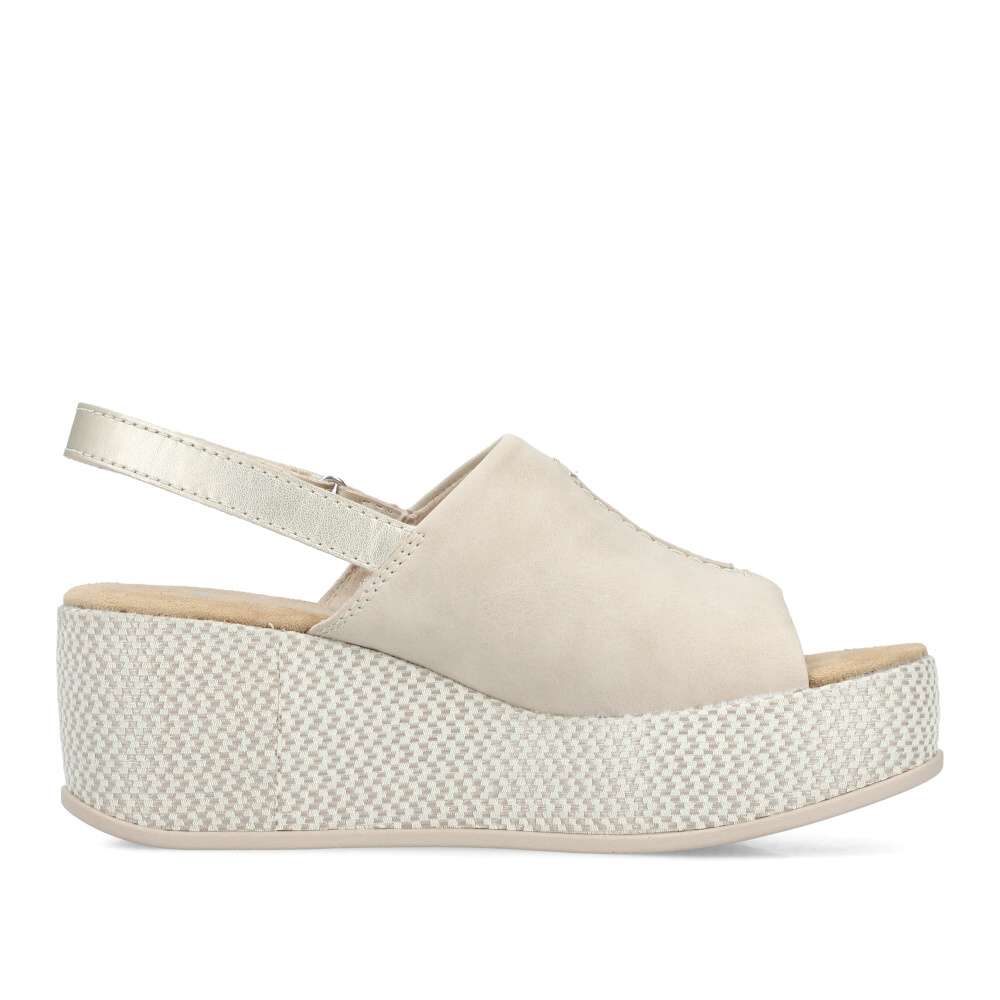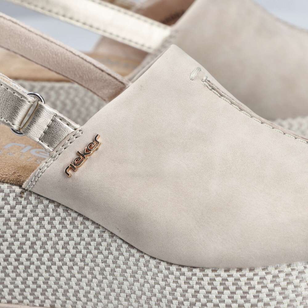 Sandály Rieker v jemném béžovém odstínu se zadním lesklým páskem si zamilujete na první pohled i krok. Široký nártový pásek dekorovaný logem značky zlaté barvy poskytne dokonalou stabilitu a pásek v zadní části se suchým zipem usnadní nazutí, zatímco měkká textilní stélka rozmazlí vaše chodidla při každém kroku. Klínový podpatek je nejen vizuálně působivý, ale také praktický – jemně tlumí nárazy a dodává chůzi ladnost. Tyto sandály jsou ideální volbou pro ženy, které touží po eleganci bez kompromisů ve stylu i pohodlí – spolehlivý kousek, ve kterém se budete cítit sebevědomě při každém kroku.