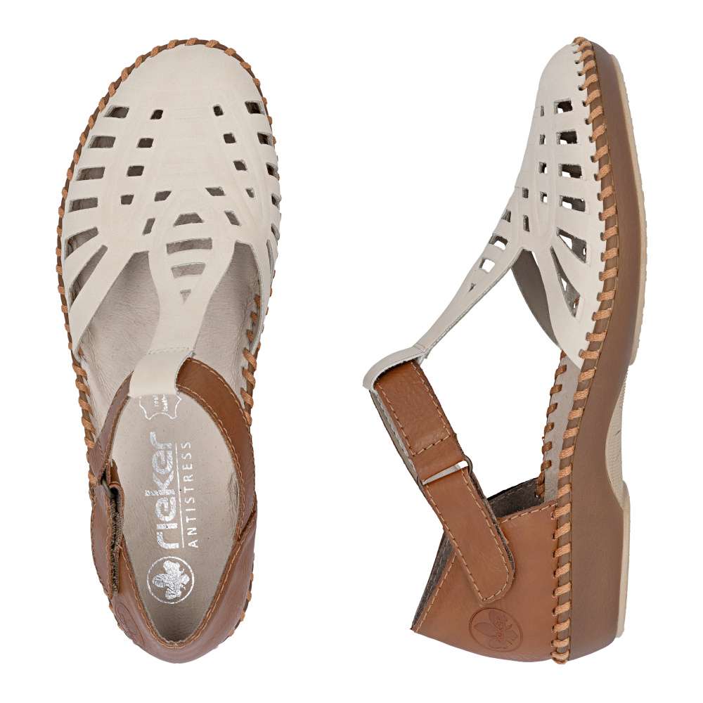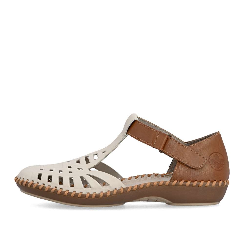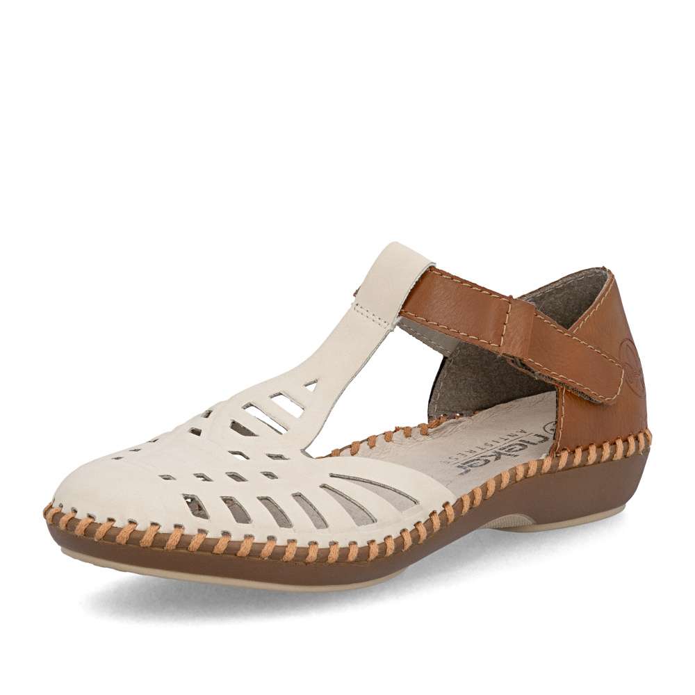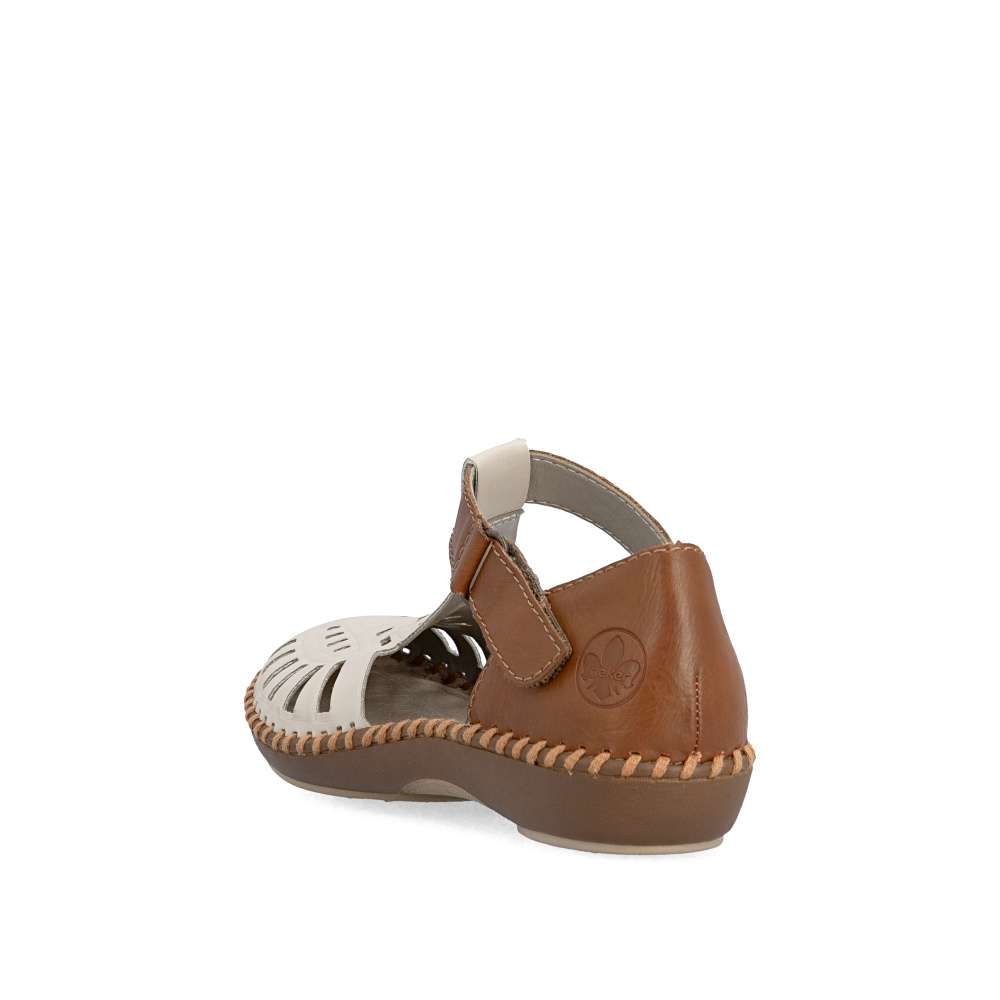 Dámské sandály značky RIEKER Vás uchvátí stylovým provedením svršku, kontrastní kombinace hnědé a bílé barvy v kombinaci s nápaditě perforovanou přední částí bude dekorovat Váš vzhled originalitou. Pro snadné obutí poslouží řemínek na suchý zip v oblasti nártu, nazutím si budete užívat měkkou koženou stélku a komfort při chůzi je vytvořen flexibilní podešví tlumící nárazy. Tyto sandály jsou ideální pro letní dny, kdy hledáte obuv, která spojuje pohodlí a krásný design.
