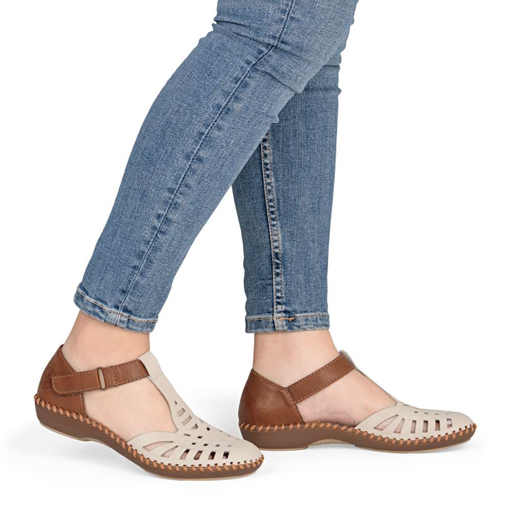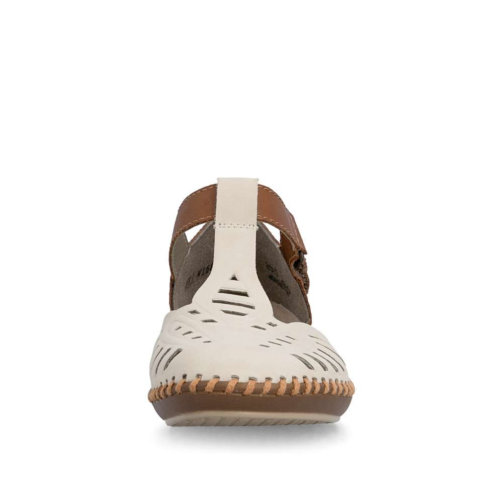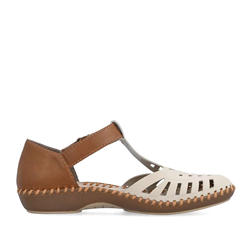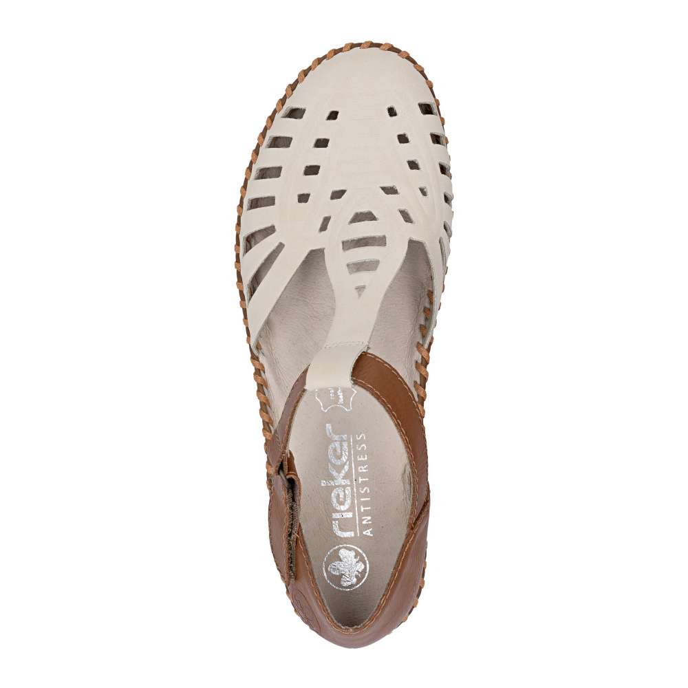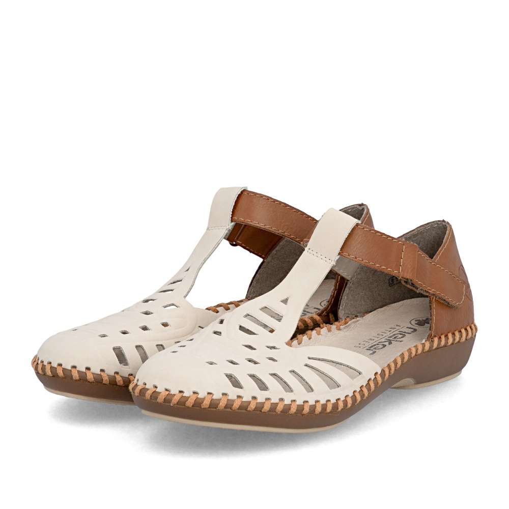 Dámské sandály značky RIEKER Vás uchvátí stylovým provedením svršku, kontrastní kombinace hnědé a bílé barvy v kombinaci s nápaditě perforovanou přední částí bude dekorovat Váš vzhled originalitou. Pro snadné obutí poslouží řemínek na suchý zip v oblasti nártu, nazutím si budete užívat měkkou koženou stélku a komfort při chůzi je vytvořen flexibilní podešví tlumící nárazy. Tyto sandály jsou ideální pro letní dny, kdy hledáte obuv, která spojuje pohodlí a krásný design.