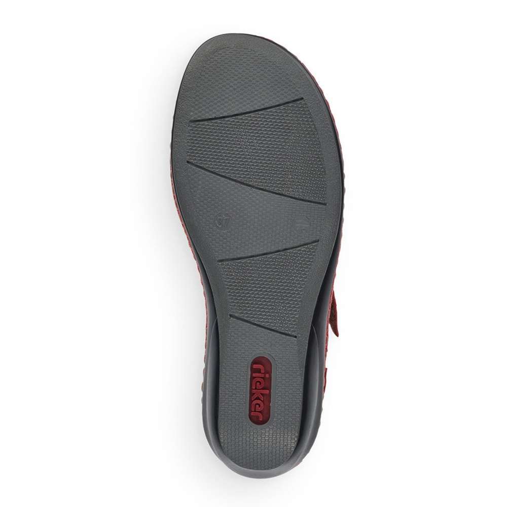 Je zdoben perforací ve tvaru pruhů, prošíváním svršku a také obšitím podešve. Pro snadné nazouvání a dokonalé přizpůsobení přímo na Vaši nohu slouží pásek na suchý zip, který na sobě nese název RIEKER.